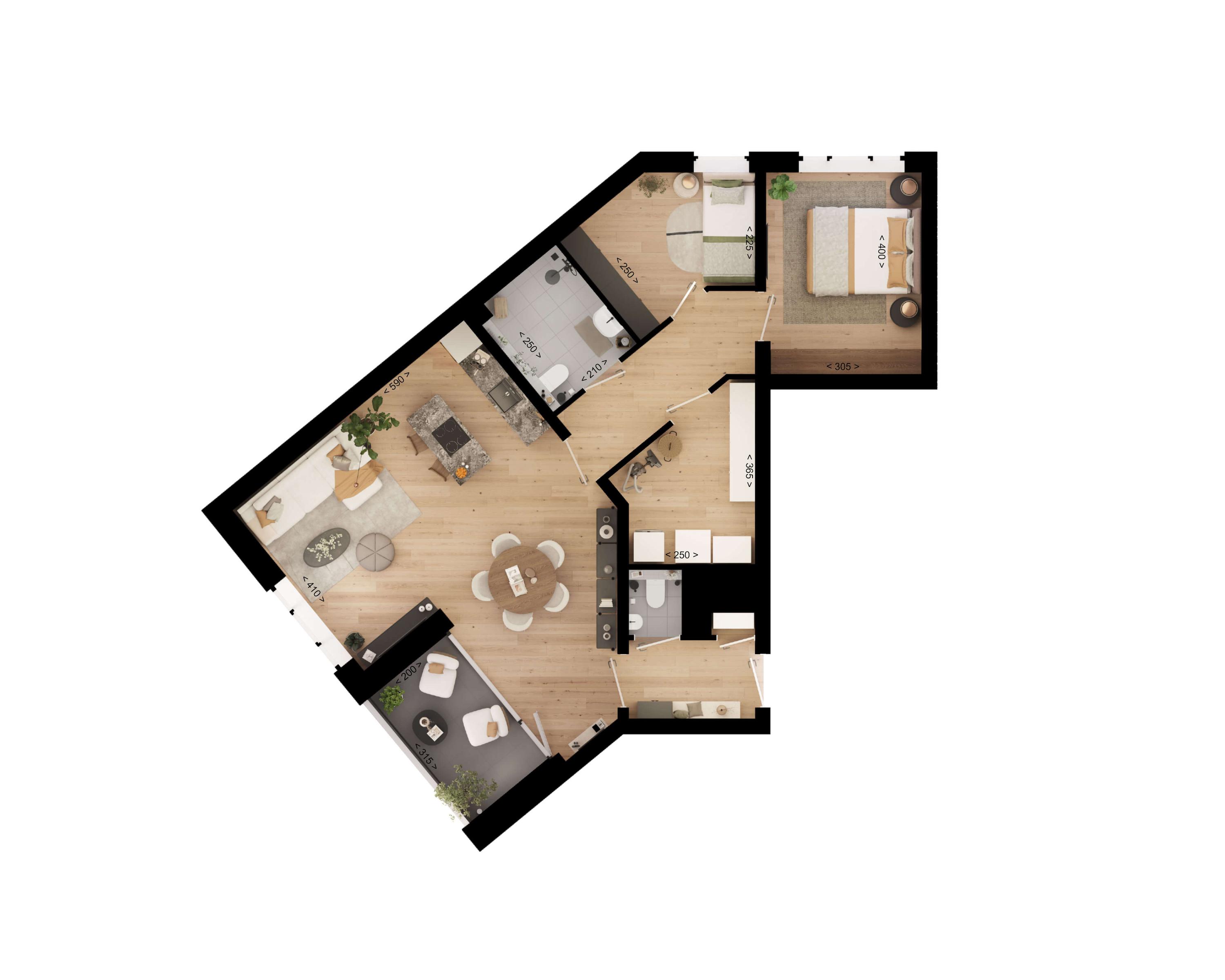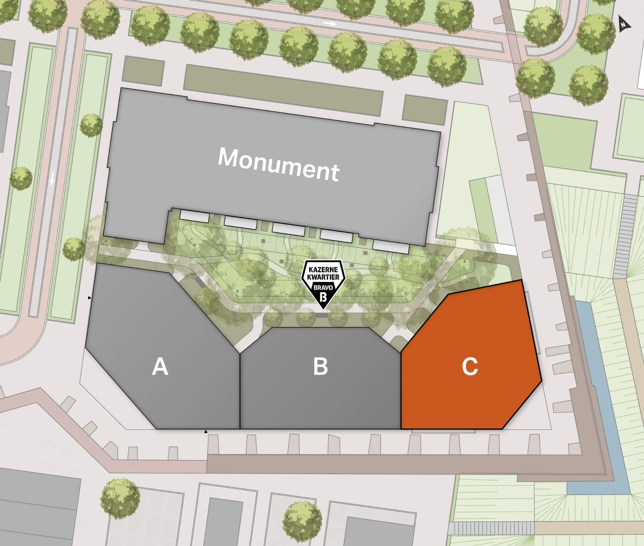 Dit type heeft een brede leefruimte met centraal geplaatste keuken en eethoek. De zithoek ligt aan de voorzijde en heeft uitzicht op de monumentale gebouwen in het Kazernekwartier. Een uniek uitzicht dat dit woningtype bijzonder maakt. De rustige indeling met twee slaapkamers maakt dit type geschikt voor uiteenlopende doelgroepen: van stellen tot jonge gezinnen en actieve 55+’ers.