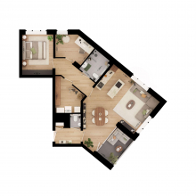 Dit type heeft een brede leefruimte met centraal geplaatste keuken en eethoek. De zithoek ligt aan de voorzijde en heeft uitzicht op de monumentale gebouwen in het Kazernekwartier. Een uniek uitzicht dat dit woningtype bijzonder maakt. De rustige indeling met twee slaapkamers maakt dit type geschikt voor uiteenlopende doelgroepen: van stellen tot jonge gezinnen en actieve 55+’ers.