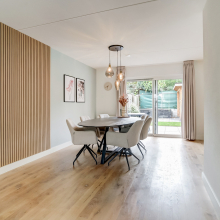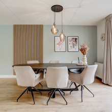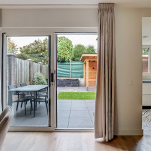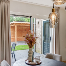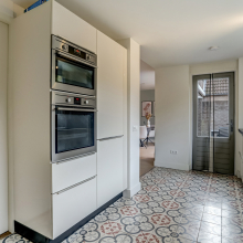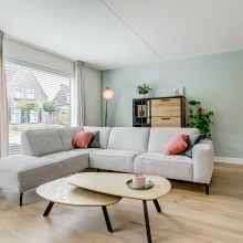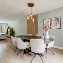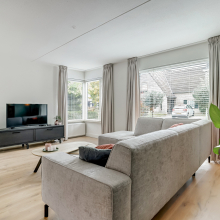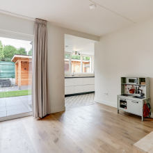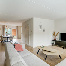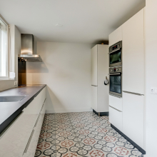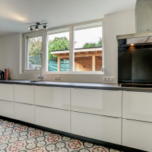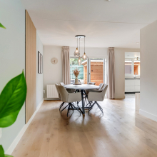 Ruime zitkamer aan de voorzijde, sfeervol, licht en modern geheel! De eetkamer aan de achterzijde staat in verbinding met de keuken en is voorzien van pui naar het terras en de tuin. Lichte keuken met ruim werkblad en uitzicht op de tuin. De keuken (2016) is voorzien van Portugese tegelvloer met vloerverwarming, vele bergruimte en diverse inbouwapparatuur; inductiekookplaat, afzuigkap, spoelbak, combi-oven, oven en koelkast.