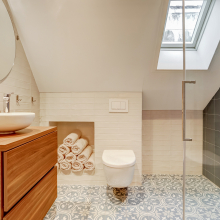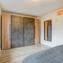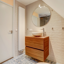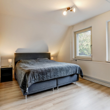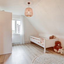 Overloop, 4 slaapkamers (ca. 14, 12, 11 en 9 m²) allen voorzien van laminaatvloer (’23), rolluiken (3 van de 4) en horren. De slaapkamer boven de berging heeft een schuin dak en is voorzien van dakkapel, aansluitend is er een bergruimte. De badkamer (’18) vormt een sfeervol geheel en is voorzien van wastafel met designerkom, toilet, inloopdouche en dakraam.