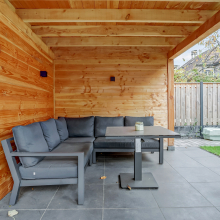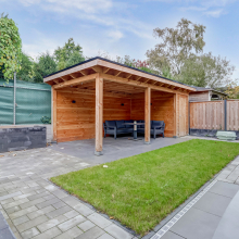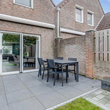 De achtertuin is in de zomer van 2024 opnieuw aangelegd met betegeld terras en pad, gazon, plantborders en fraaie overkapping. Mooie houten overkapping, ideale loungeplek! Het terras is beschut gelegen en is voorzien van elektrisch zonnescherm.