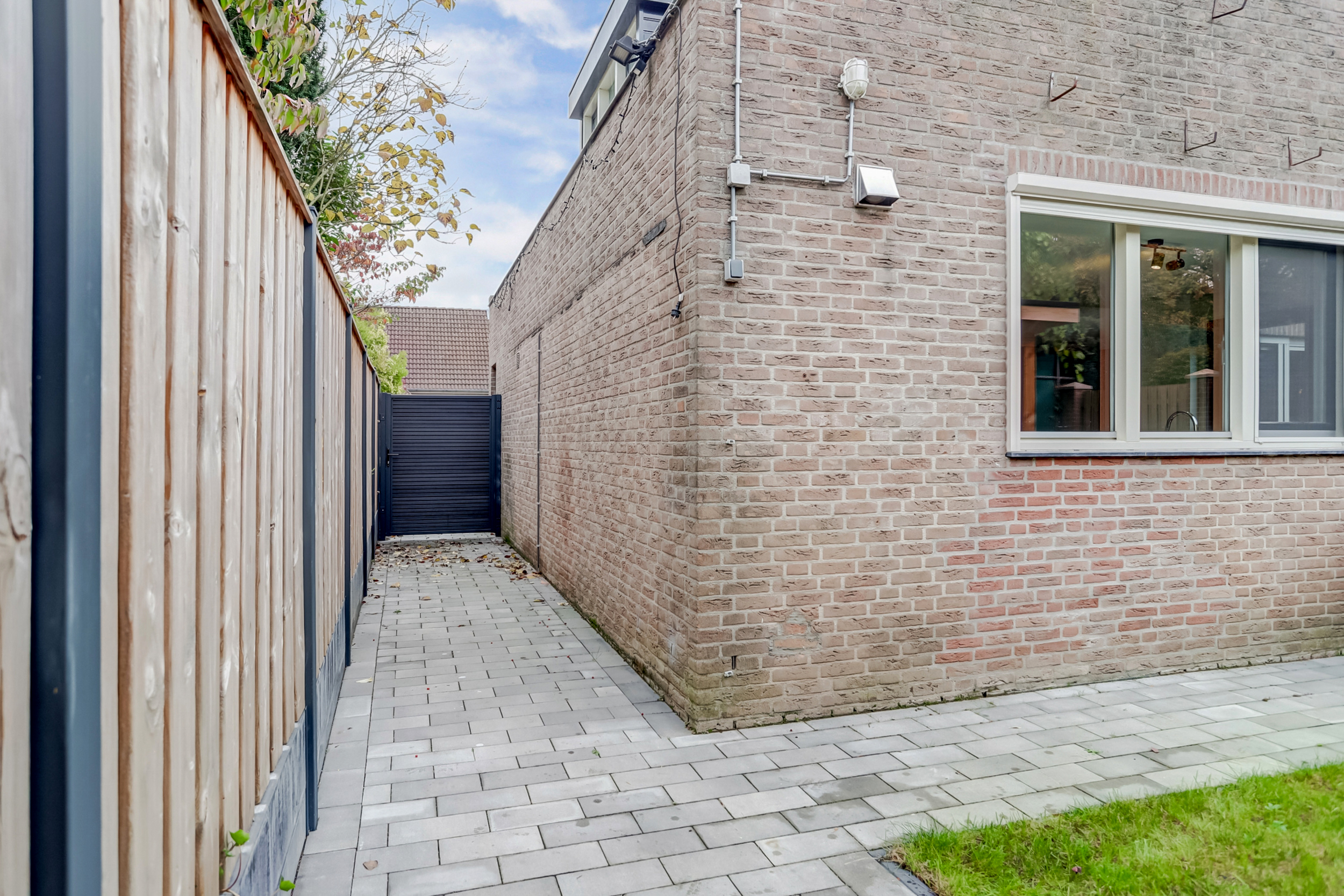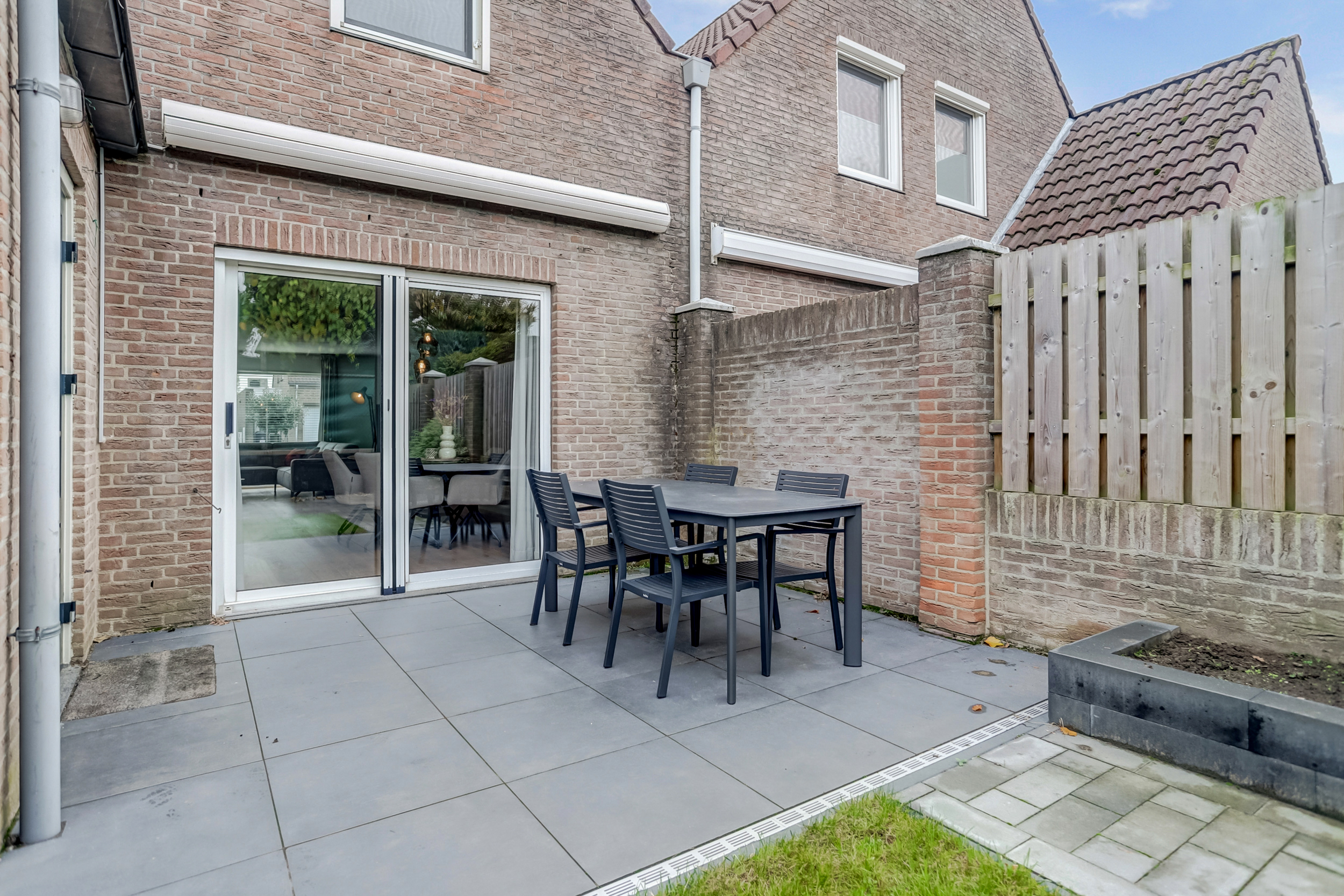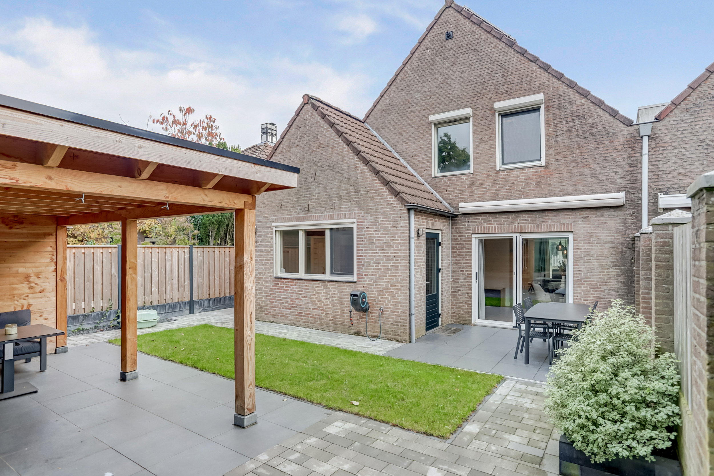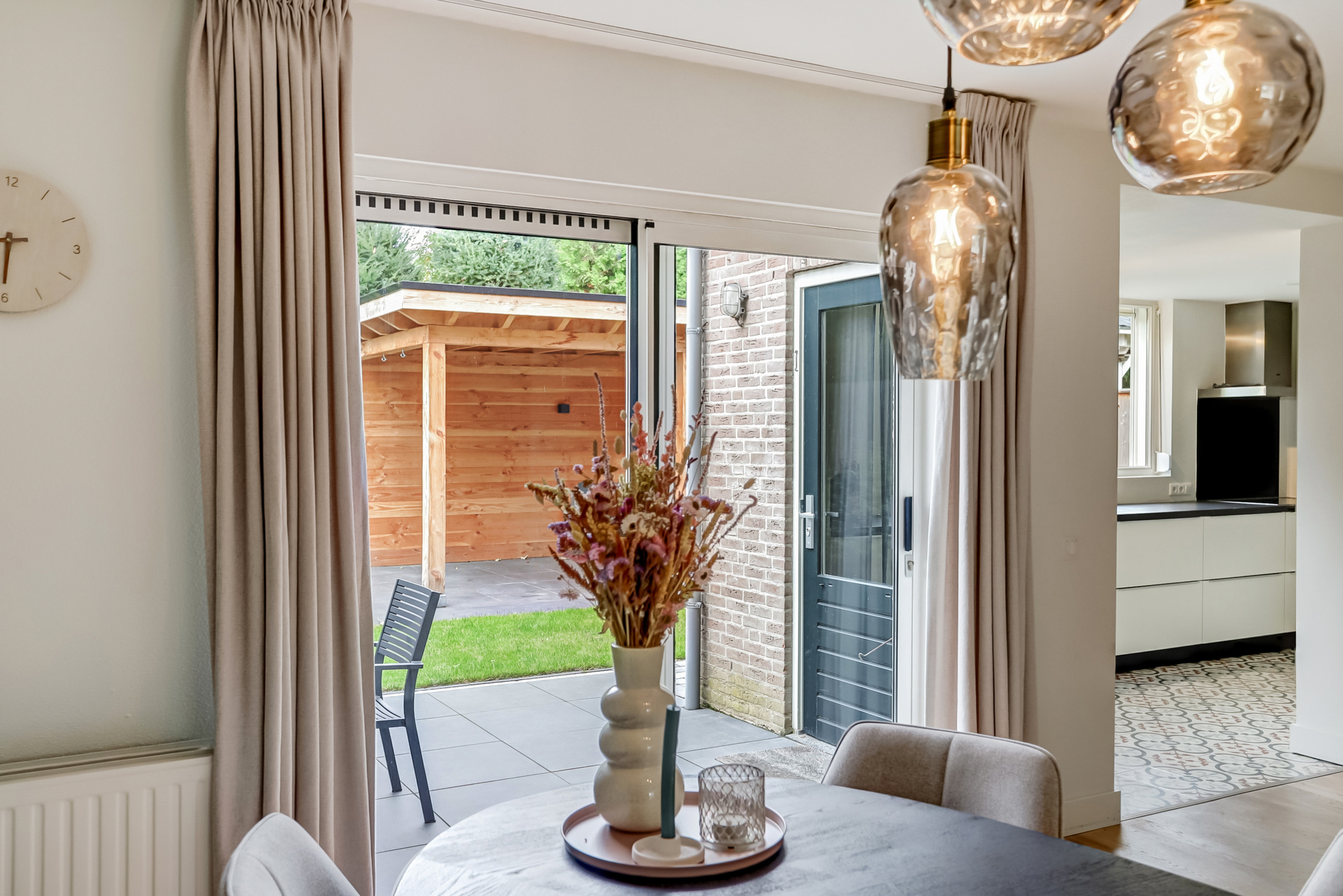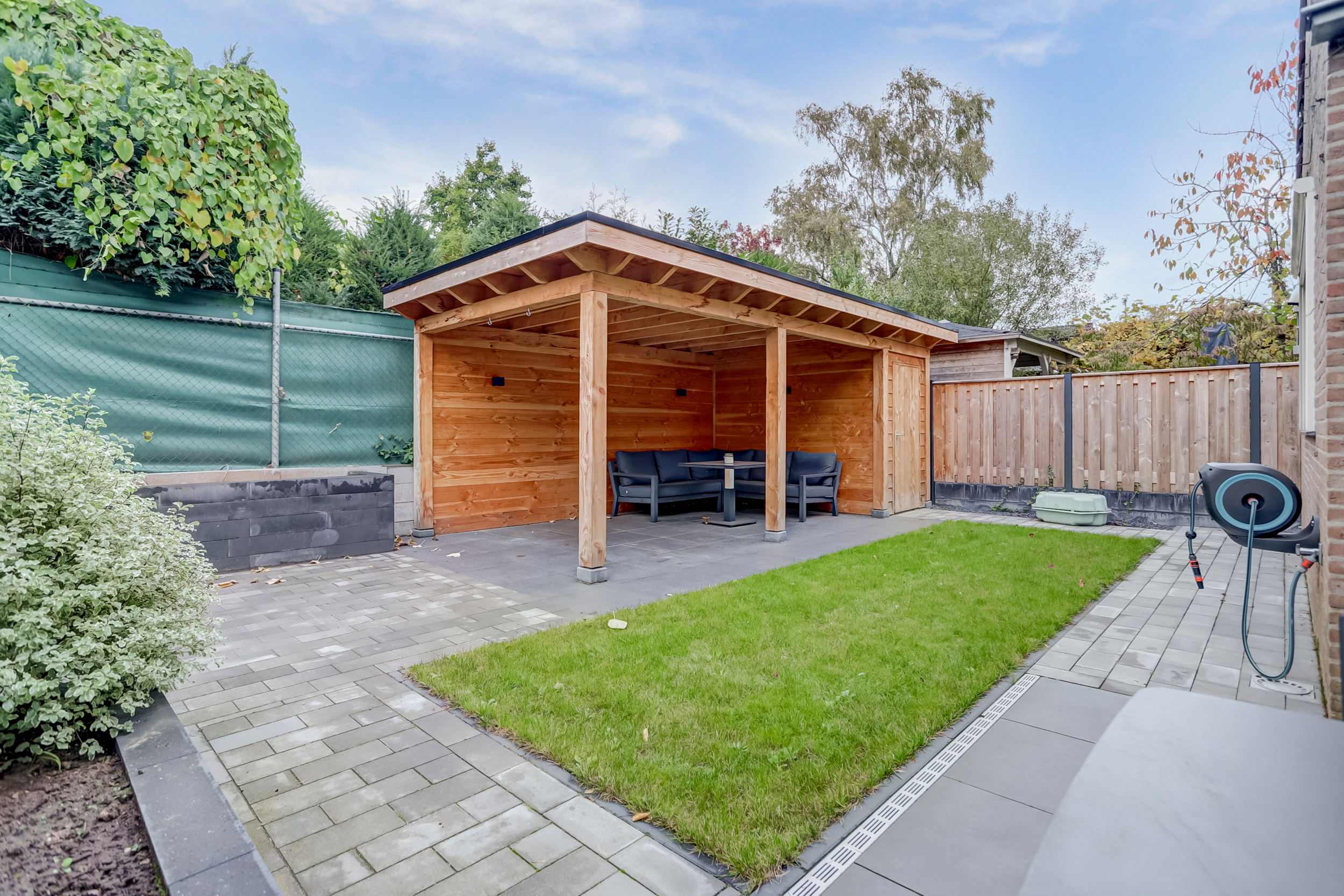 De achtertuin is in de zomer van 2024 opnieuw aangelegd met betegeld terras en pad, gazon, plantborders en fraaie overkapping. Mooie houten overkapping, ideale loungeplek! Het terras is beschut gelegen en is voorzien van elektrisch zonnescherm.