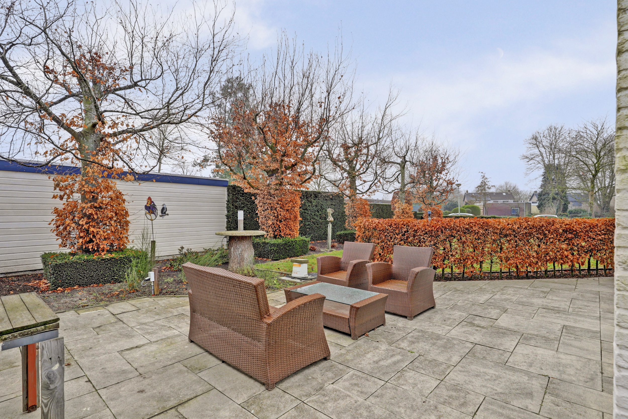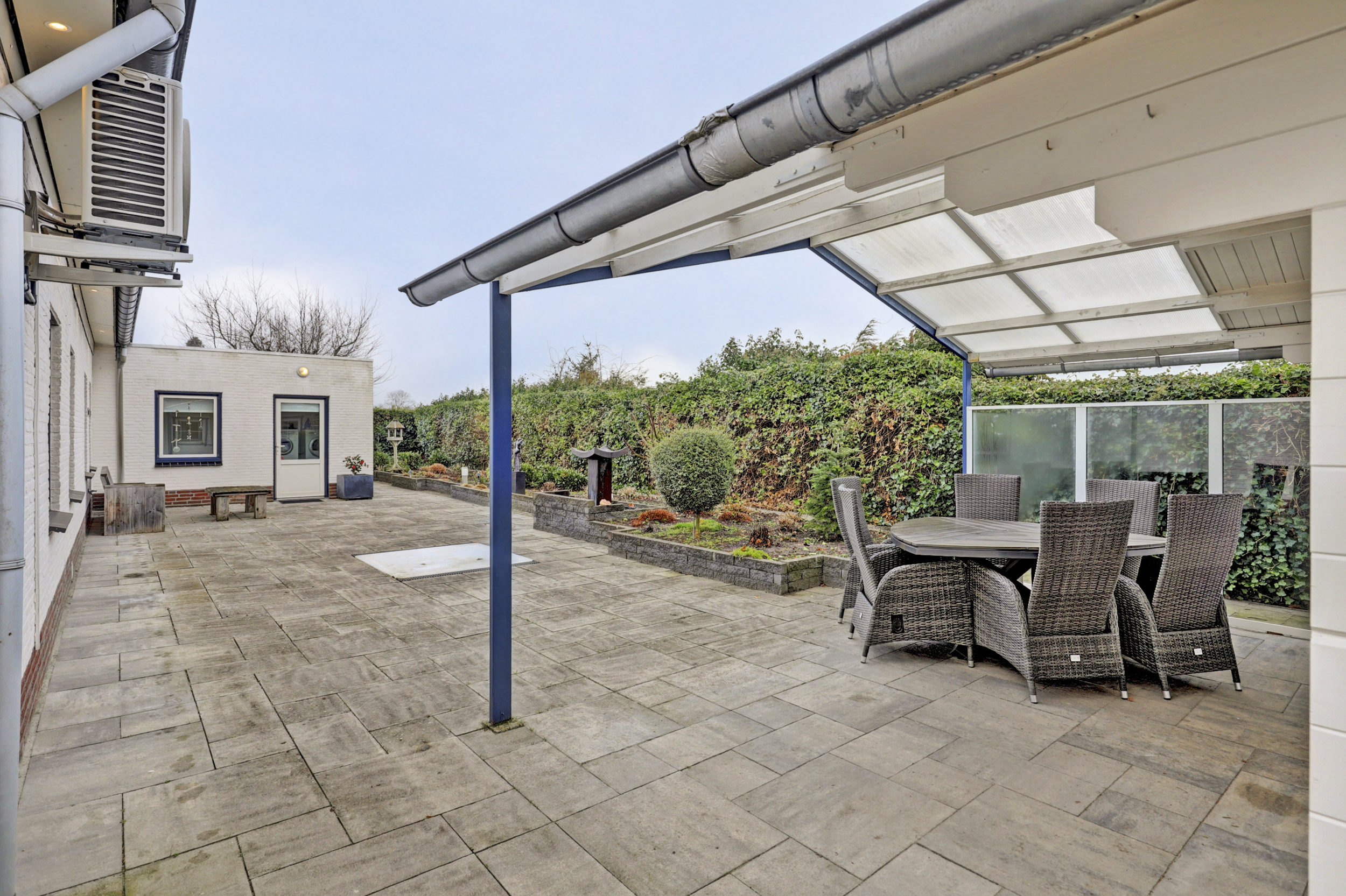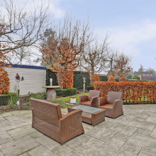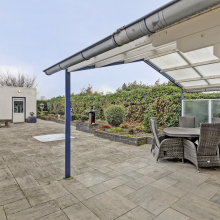 Voortuin met onder meer een oprit waar je diverse auto’s kunt parkeren en een groot gazon dat gemaaid wordt door de robotmaaier. De achtertuin biedt optimale privacy en is onderhoudsarm aangelegd. Onder de overkapping kun je heerlijk van het buitenleven genieten en het tuinhuis biedt veel bergruimte. De tuin is voorzien van een eigen waterput t.b.v. beregening.