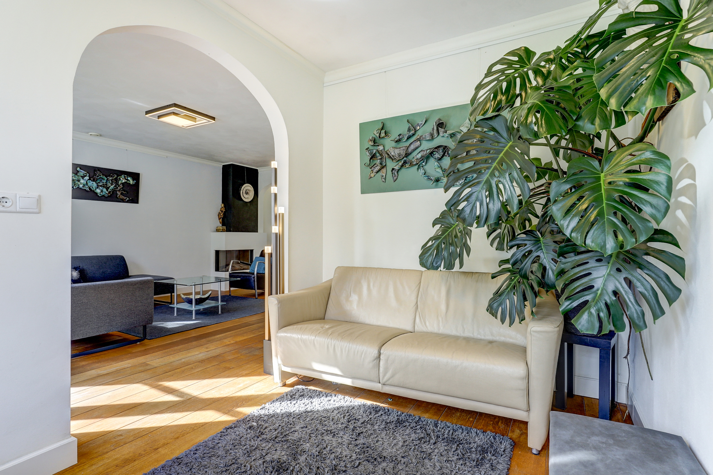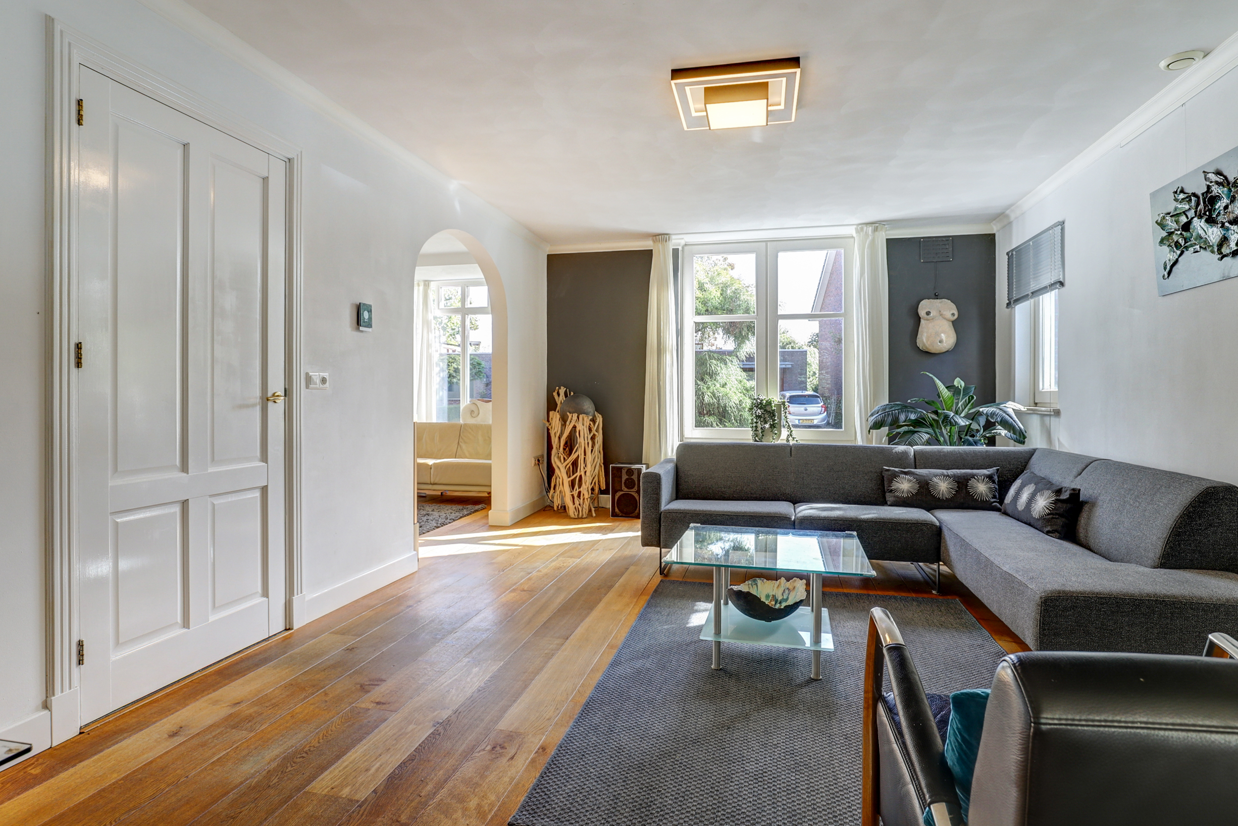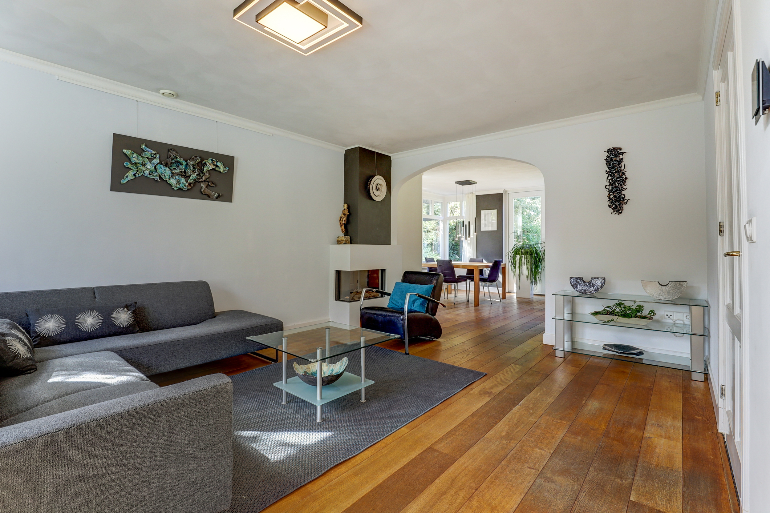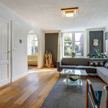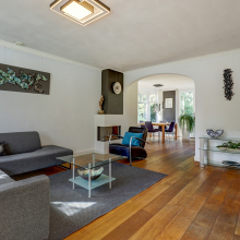 Eenmaal binnen ervaar je de lichte en open sfeer. De woonkamer is ruim opgezet en voorzien van grote raampartijen die zorgen voor een fijne lichtinval en een fraai zicht op de tuin. De woonkamer is voorzien van een ware eiken houten vloer. De gashaard zorgt voor extra sfeer en warmte.
