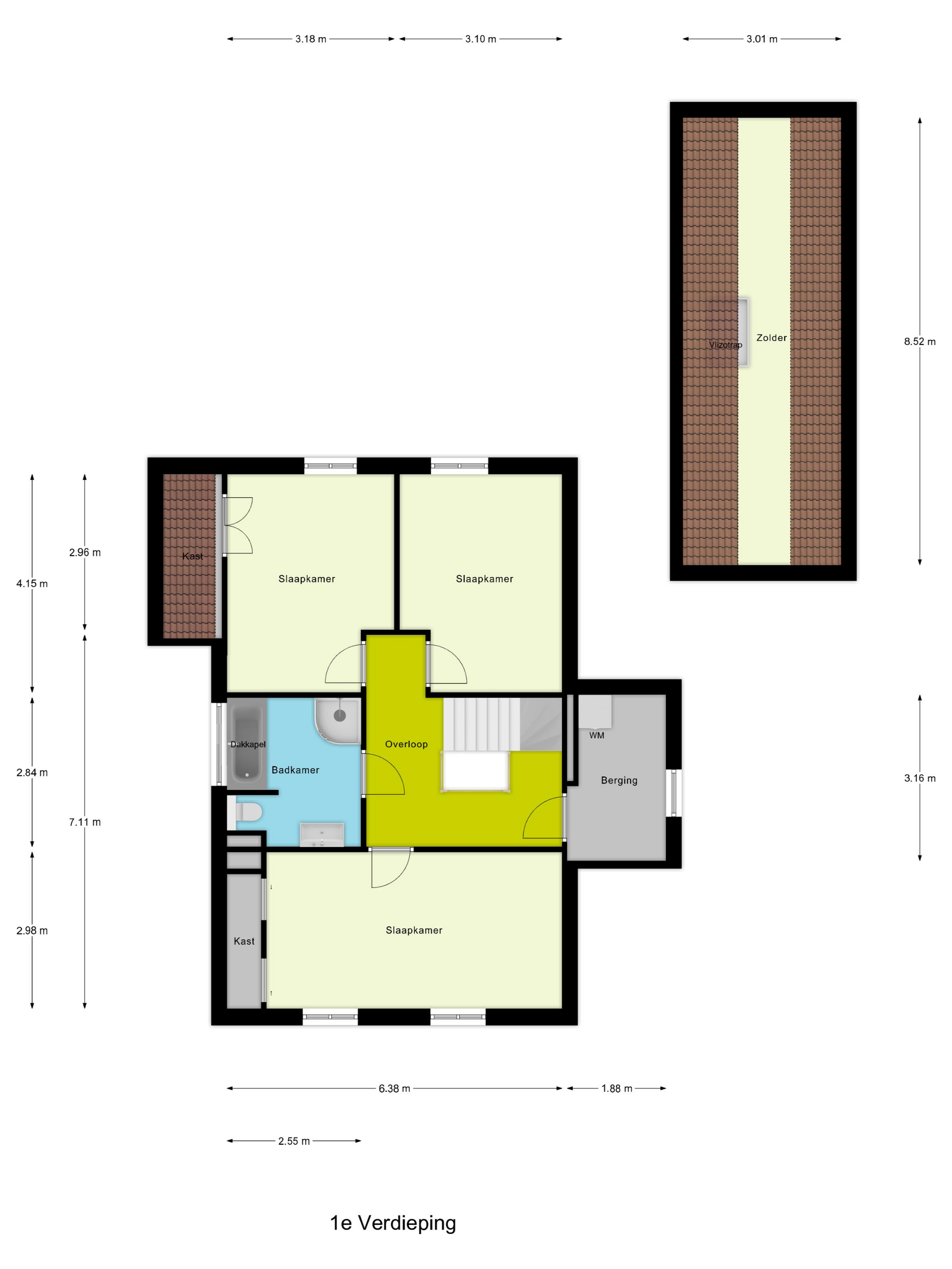 Op de eerste verdieping tref je 3 slaapkamers van goed formaat, elk met een rustige en aangename uitstraling. De badkamer is compleet uitgevoerd en biedt alle comfort voor het hele gezin.