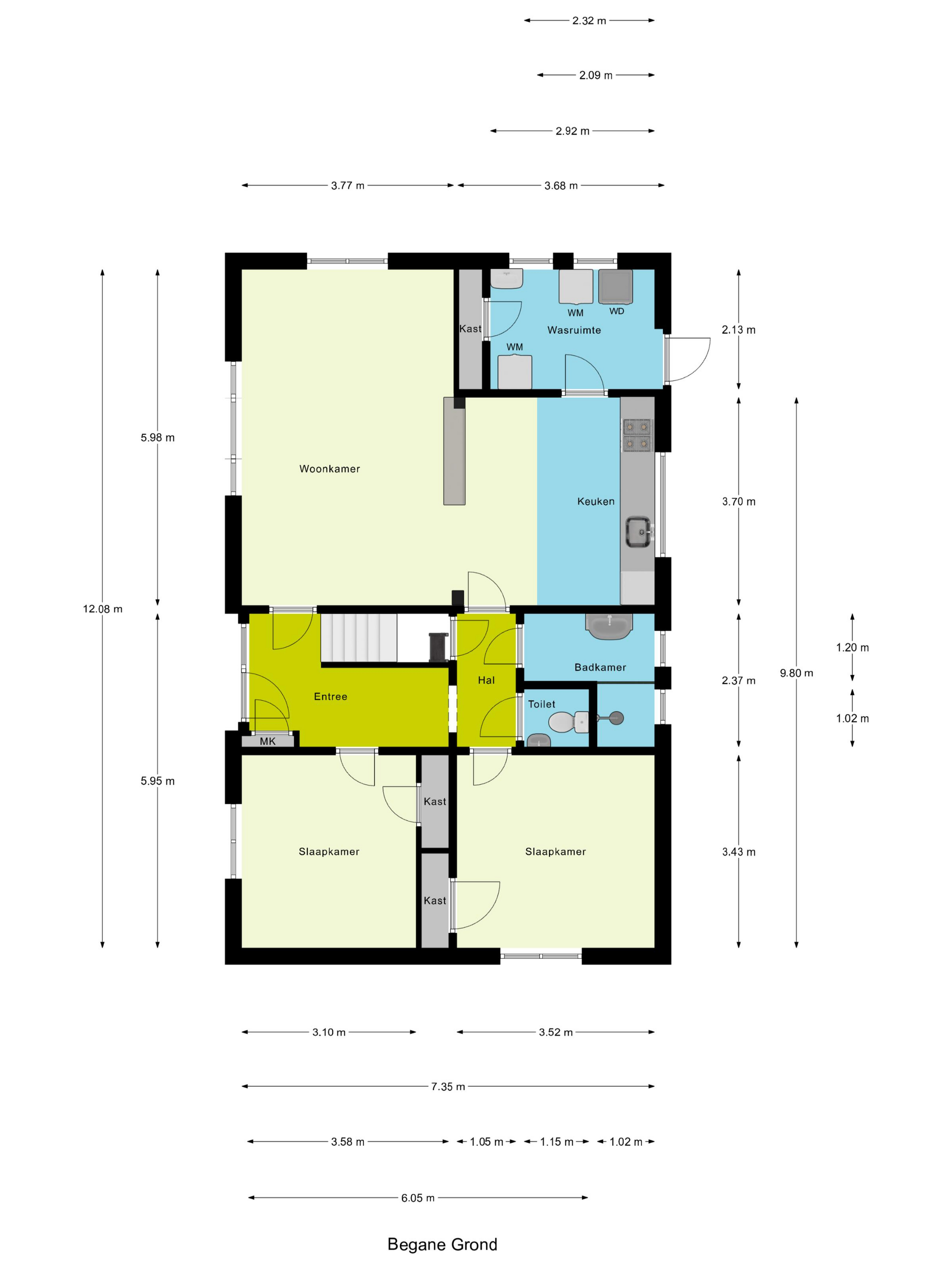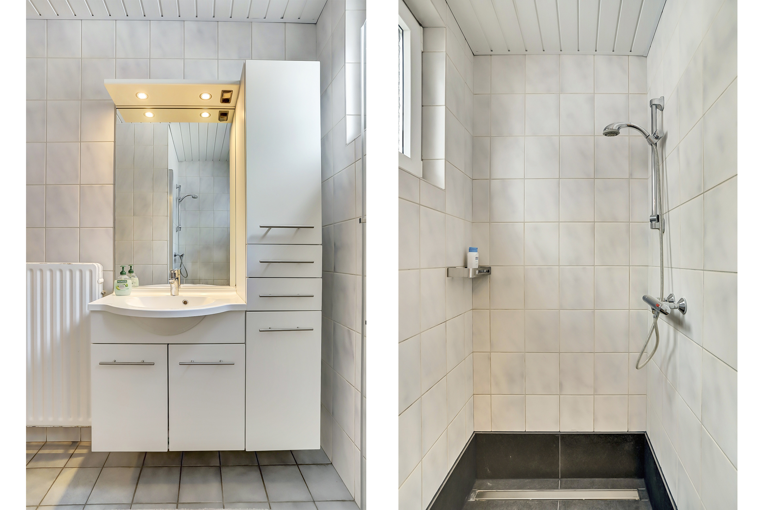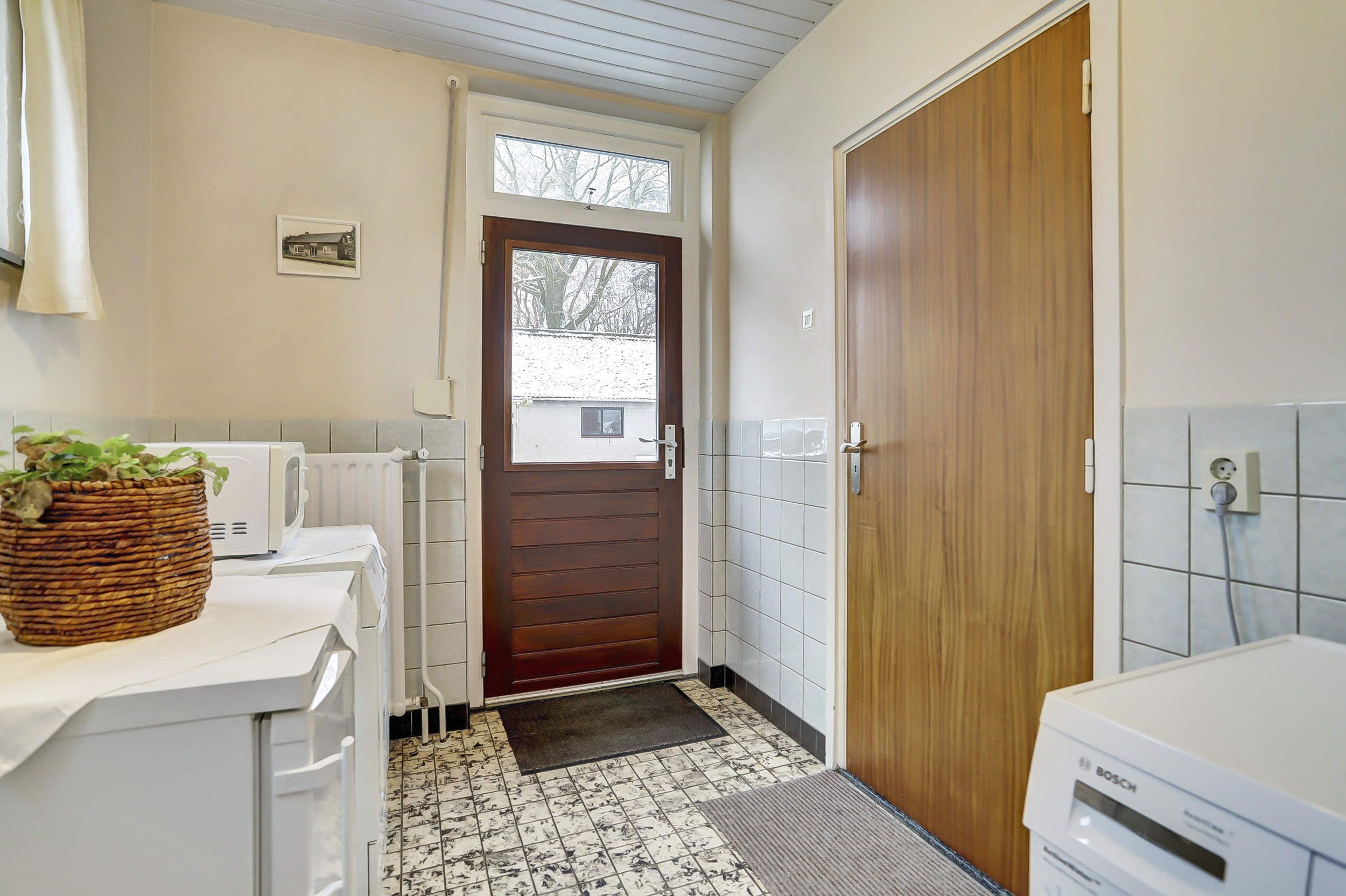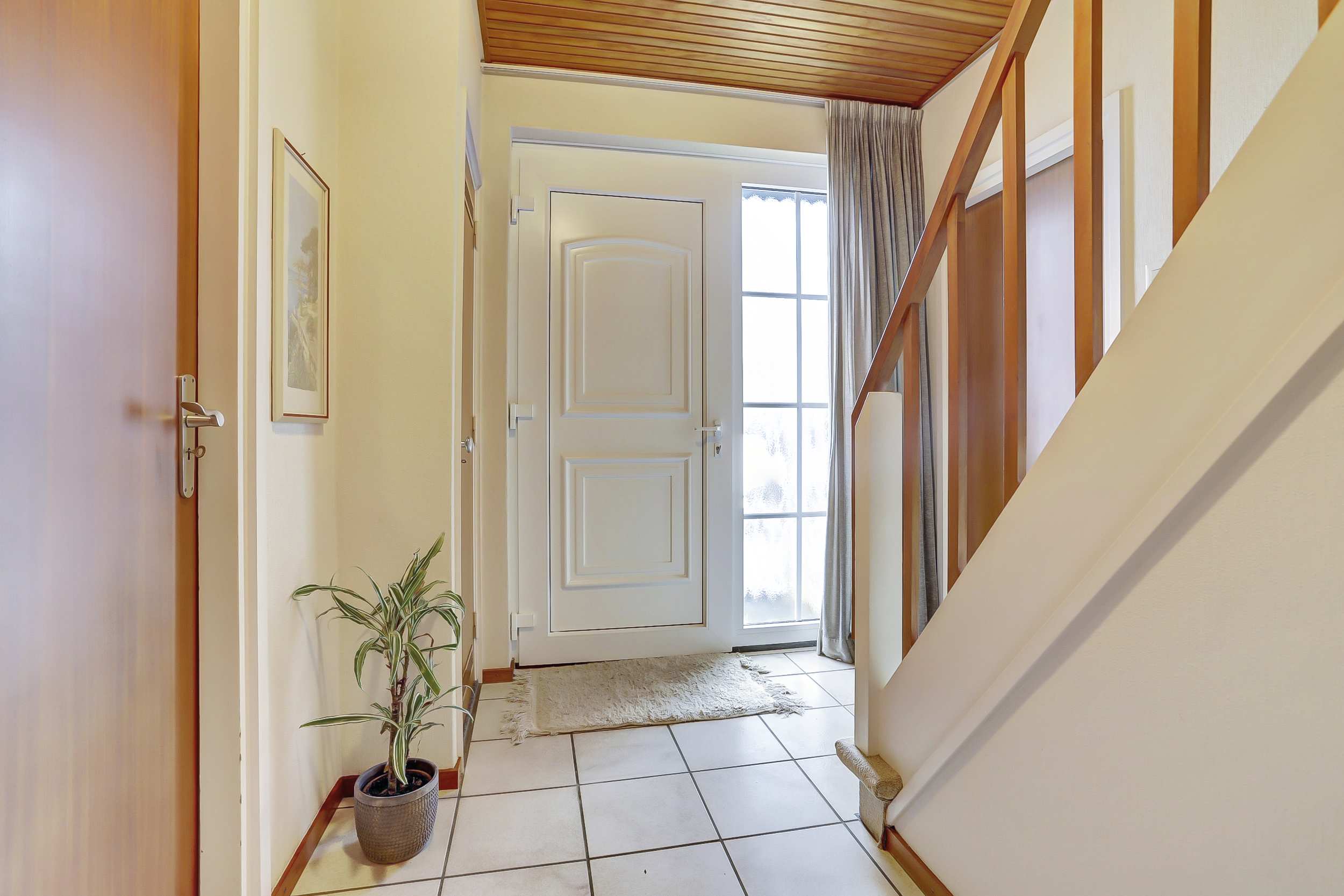 Hal, meterkast, toilet, woonkamer met uitzicht op landerijen en open woonkeuken, aparte bijkeuken met wastafel. Er zijn 2 slaapkamers en een badkamer met inloopdouche (gerenoveerd in 2024) op de begane grond.
