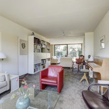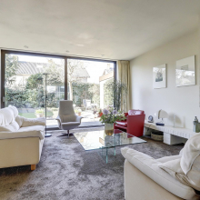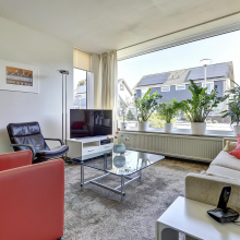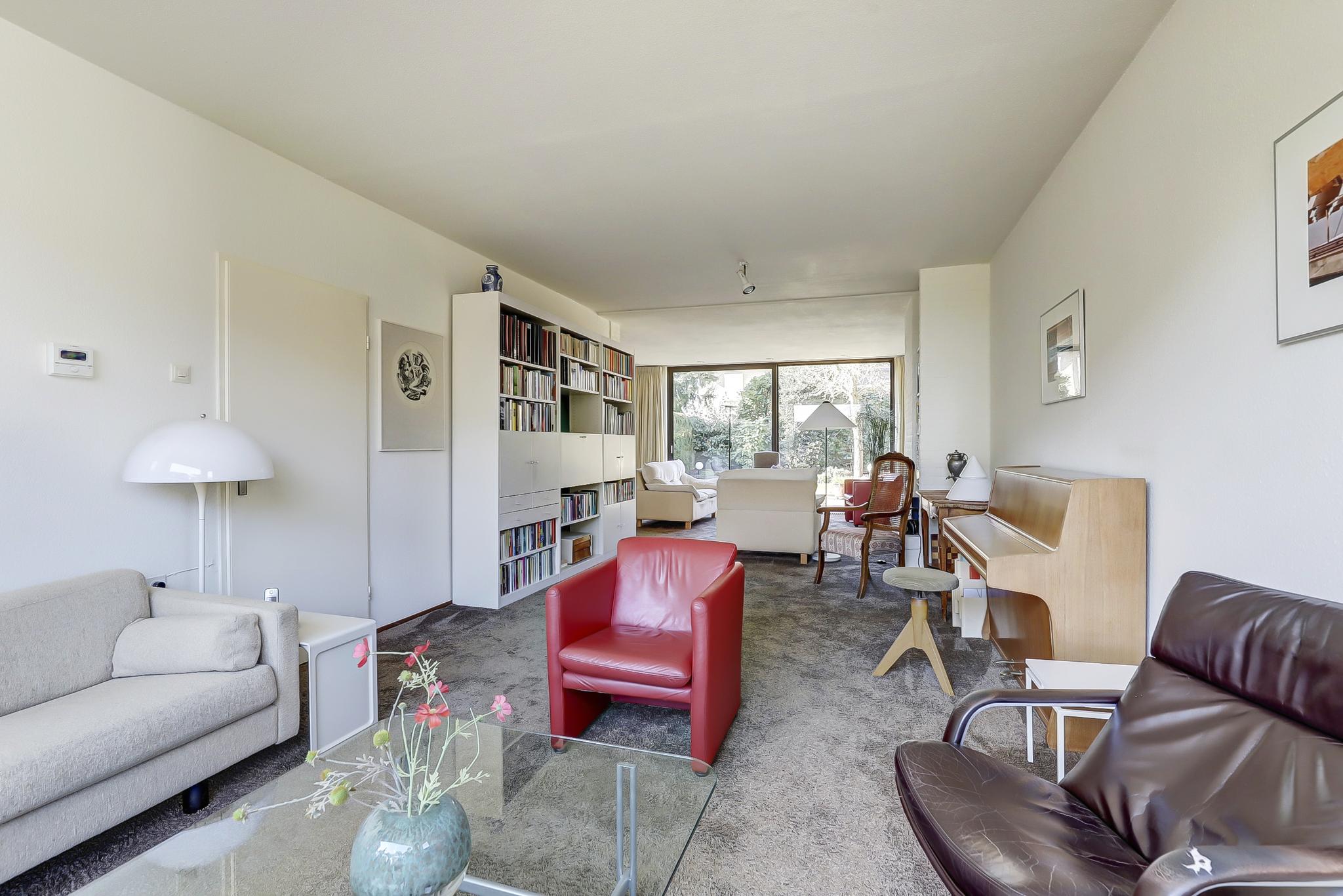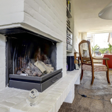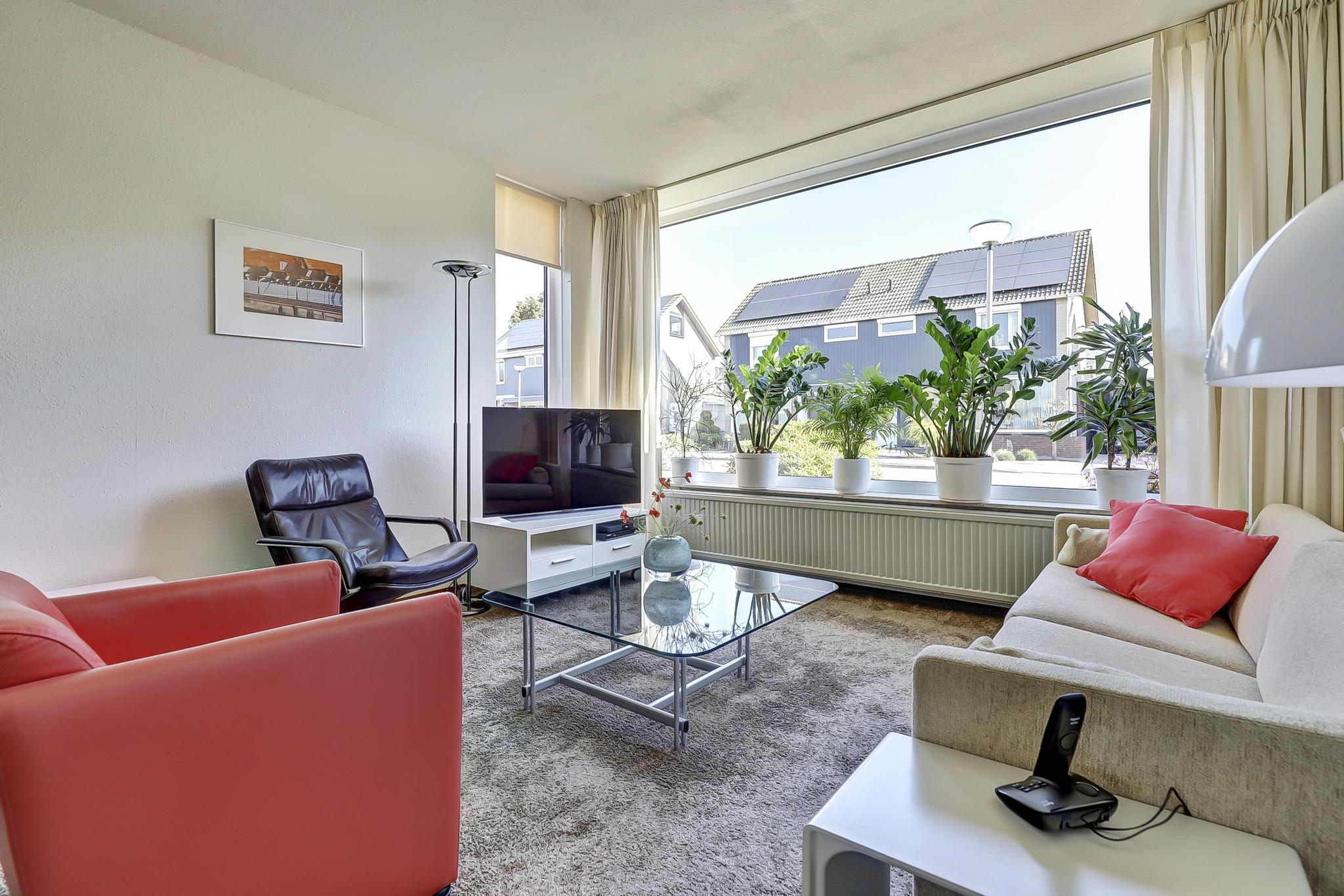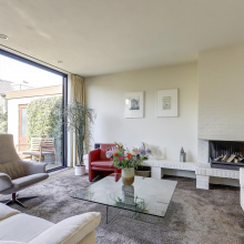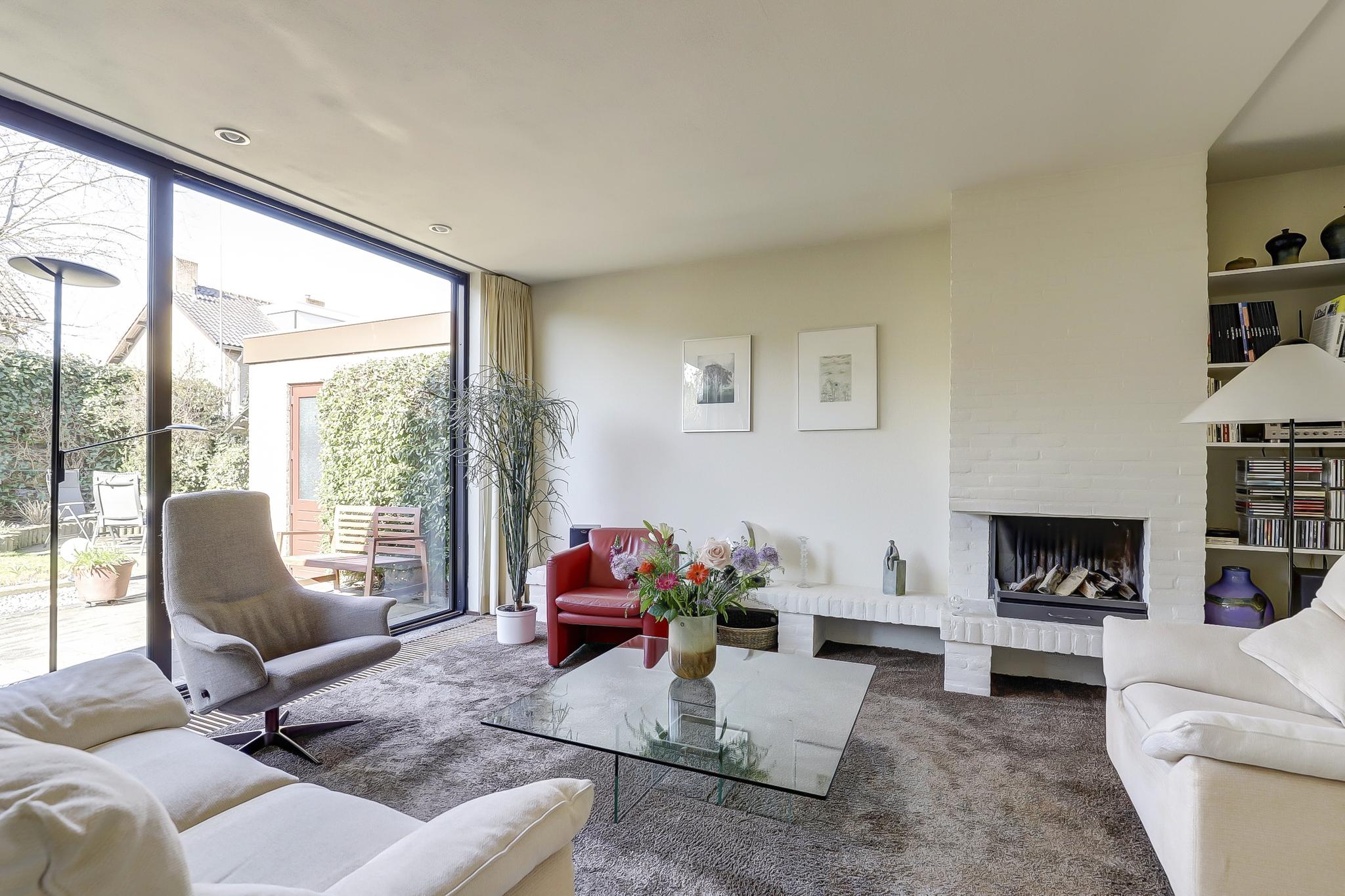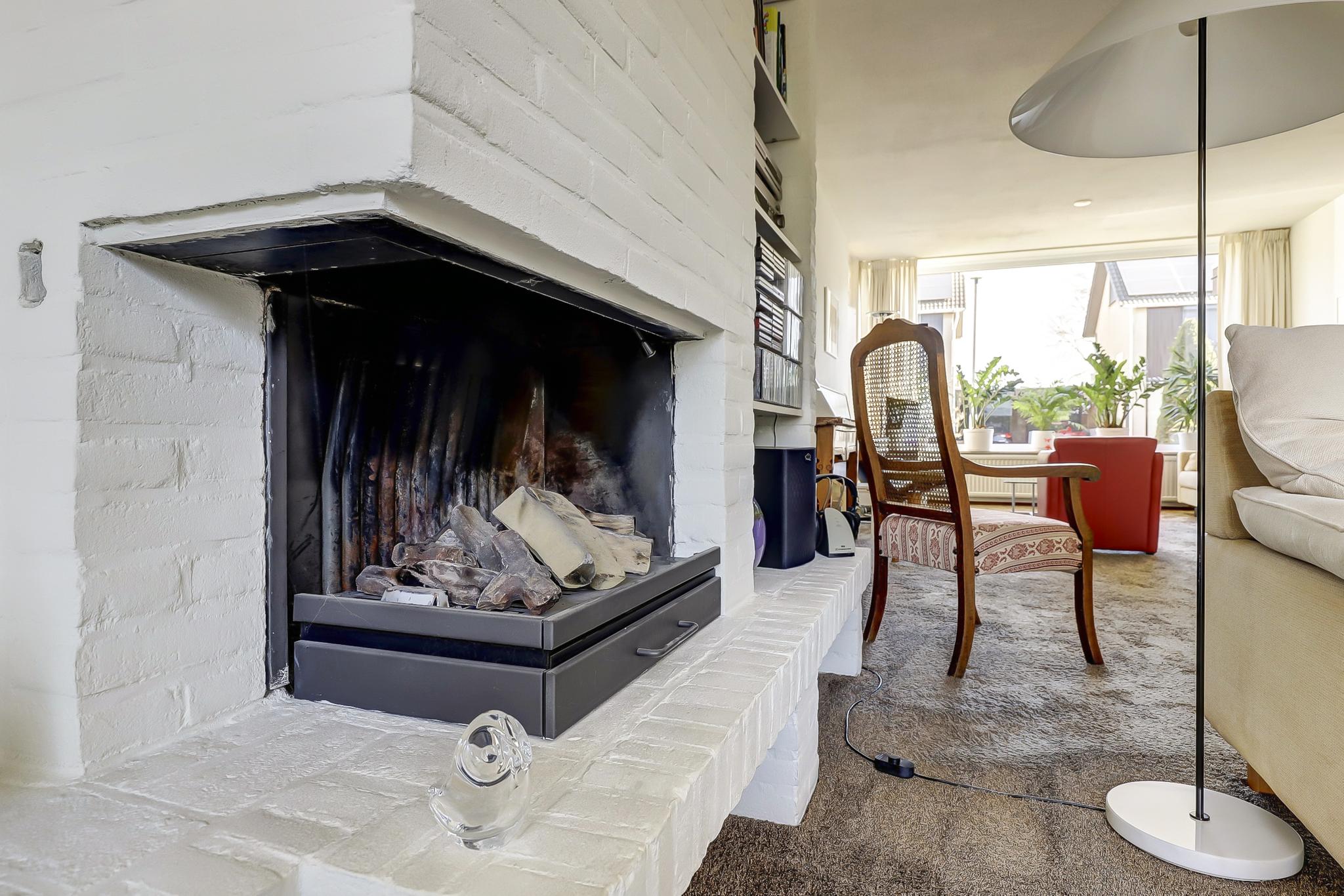 Royale en lichte woonkamer met tv-hoek aan de voorzijde en knusse zithoek in de uitbouw aan de achterzijde. Sfeervolle gashaard aanwezig en royale pui naar de achtertuin. Licht geheel met fijn tuincontact!