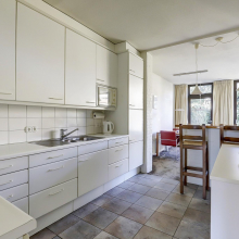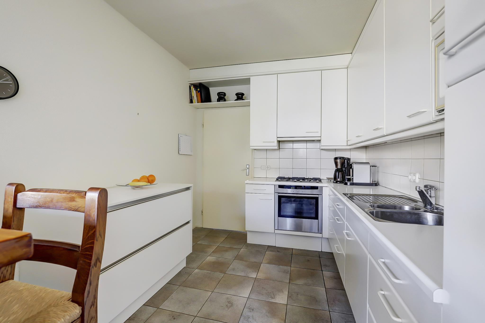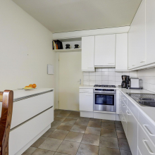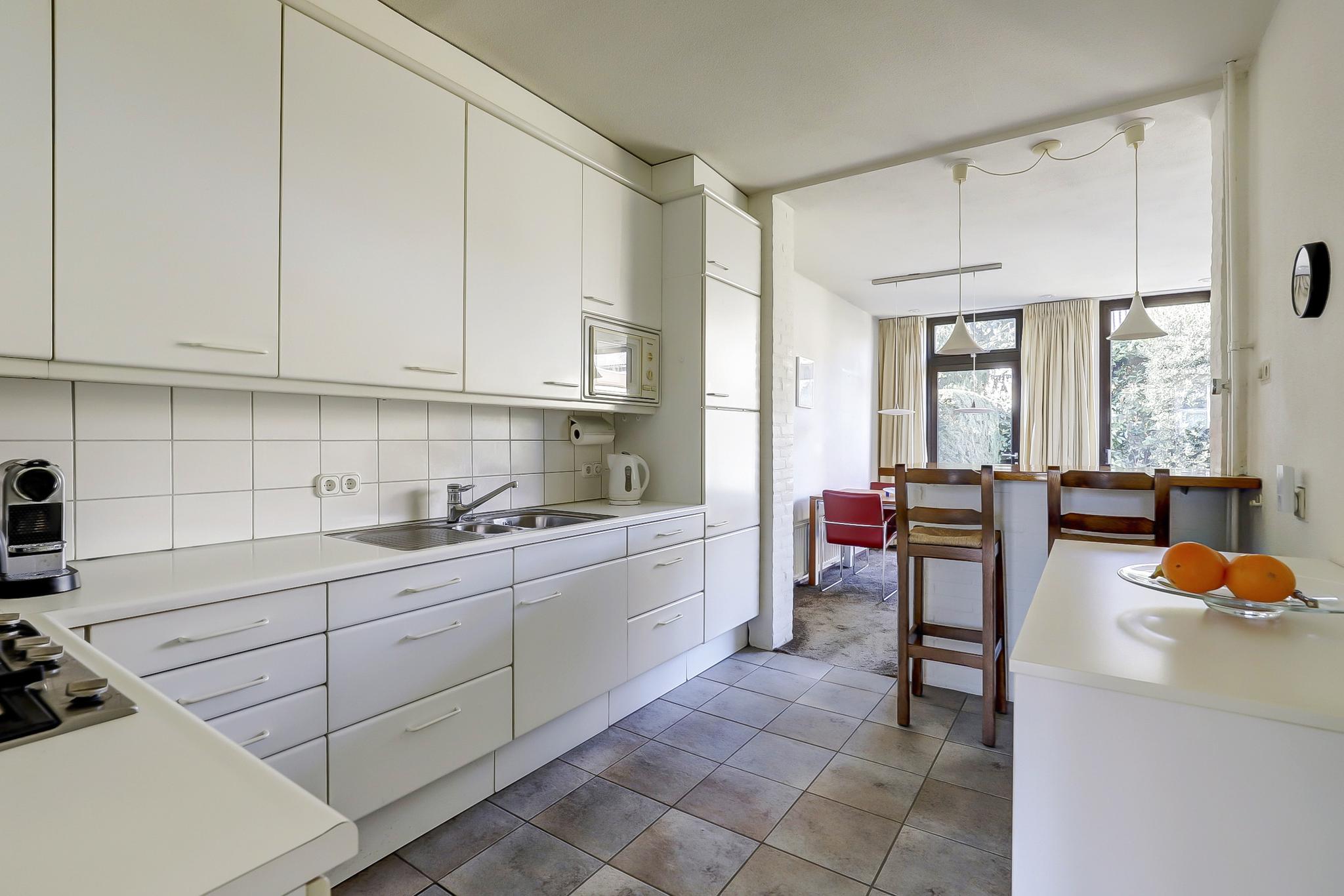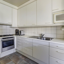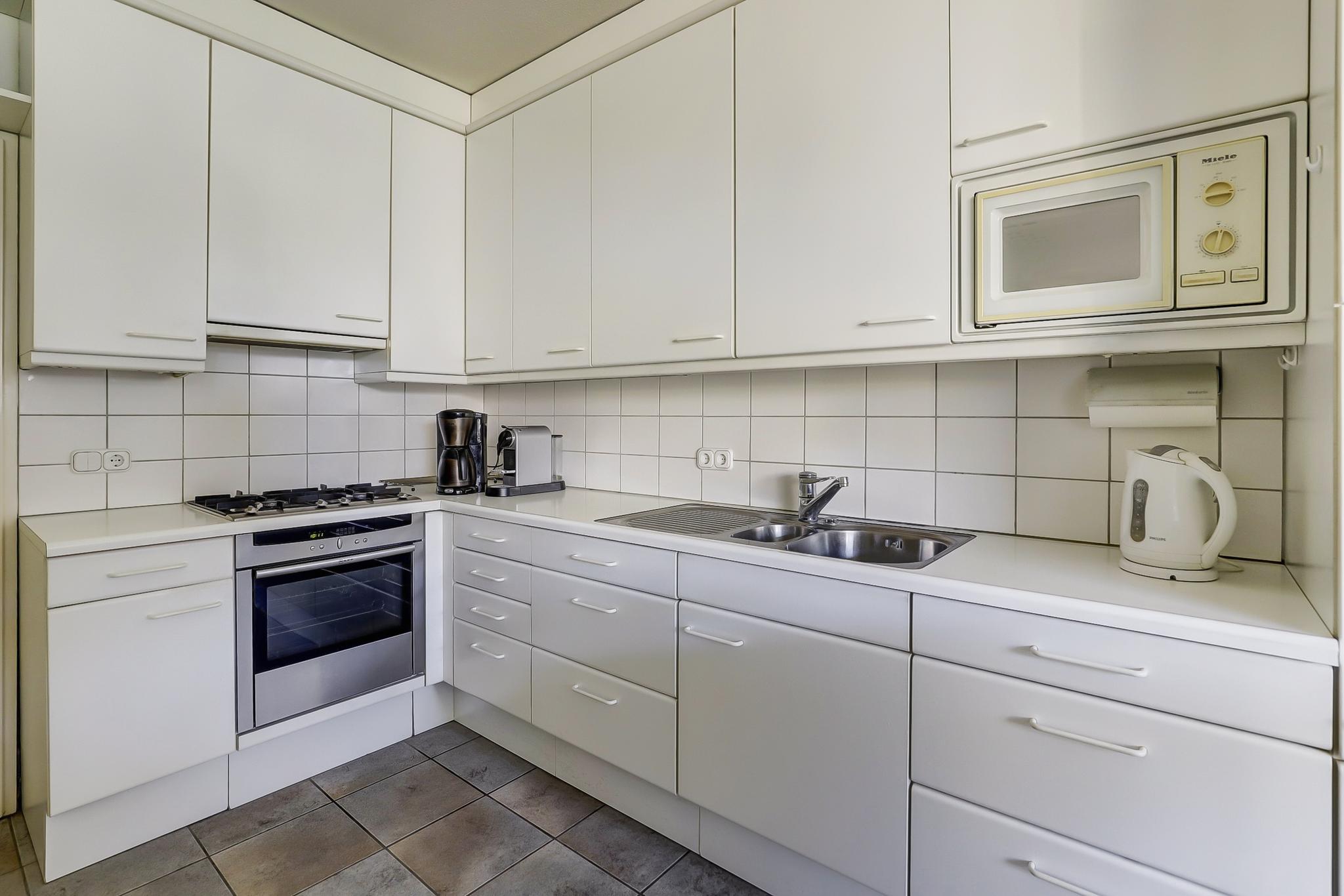 De half open keuken is voorzien ruim werkblad, veel bergruimte, bar, koffiecorner en diverse inbouwapparatuur; 4-pits gaskomfoor, afzuigkap, oven, vaatwasser (’24), magnetron, spoelbak, koelkast met vriesvak (’20).