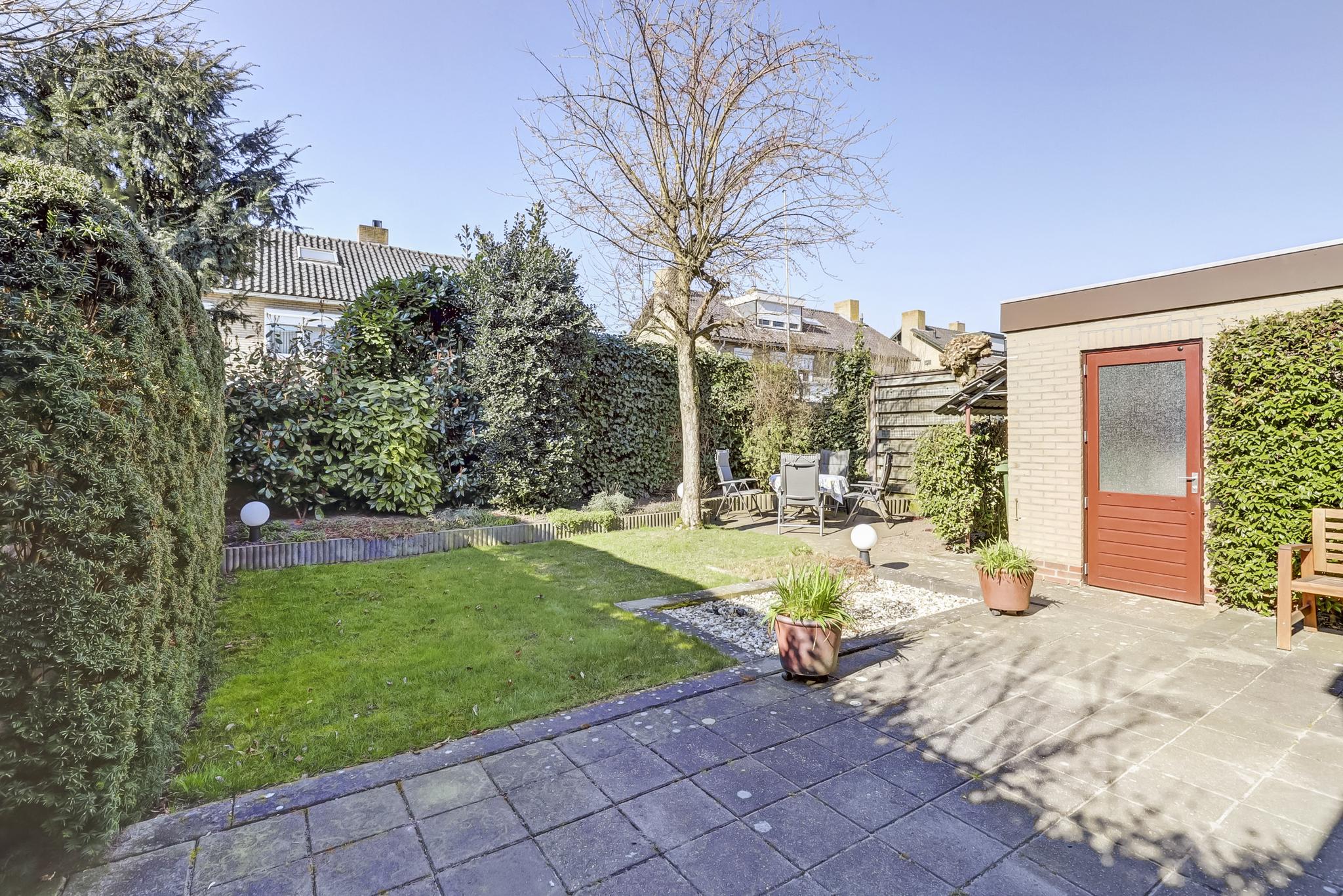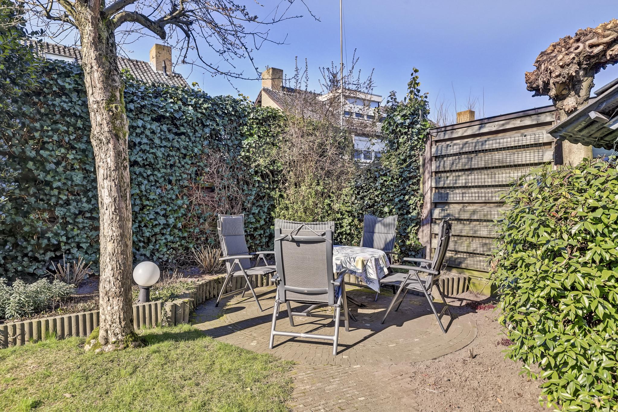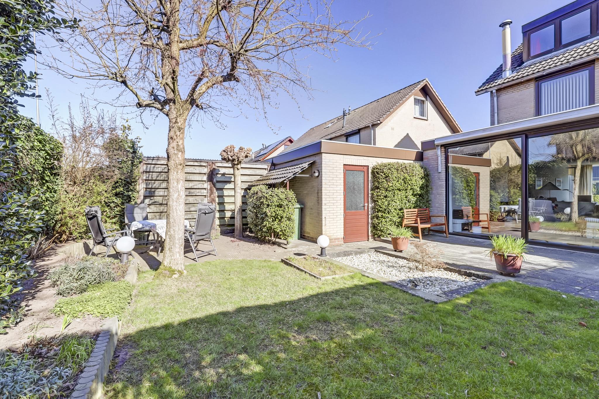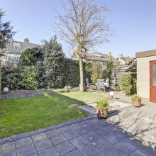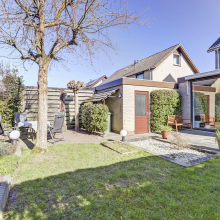 De achtertuin ligt op het zuid-westen en is voorzien van beklinkerd terras met elektrisch zonnescherm. Fraai aangelegd met groene hagen, plantborders, gazon en 2e zonneterras. Hier is het heerlijk vertoeven!