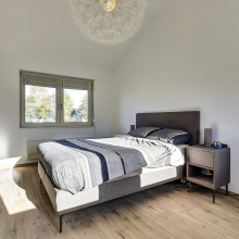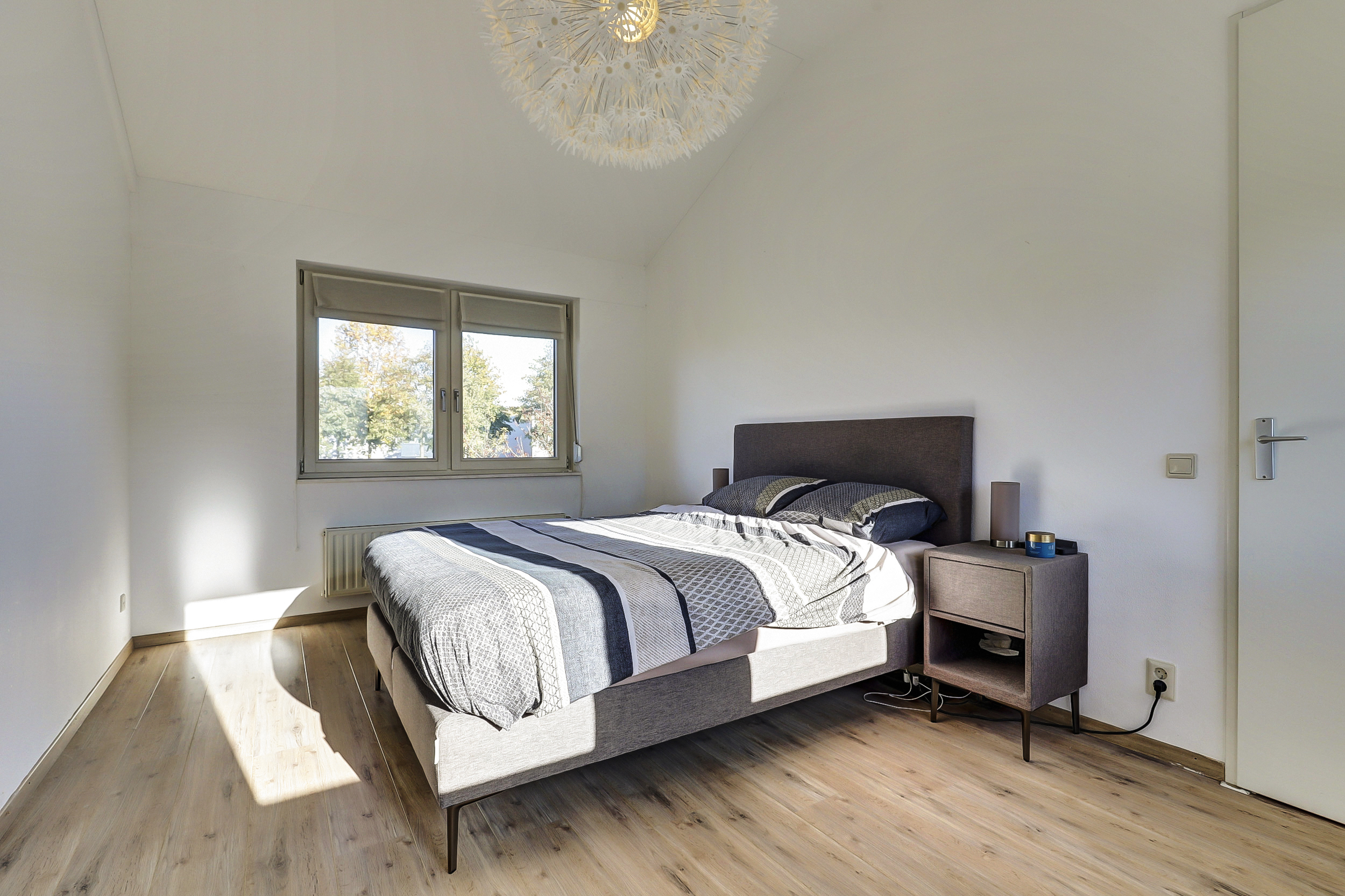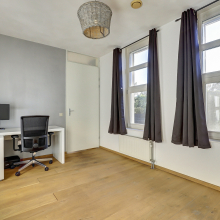 Overloop, 2 slaapkamers die beide voorzien zijn rolluiken. Op de verdieping liggen laminaatvloeren.