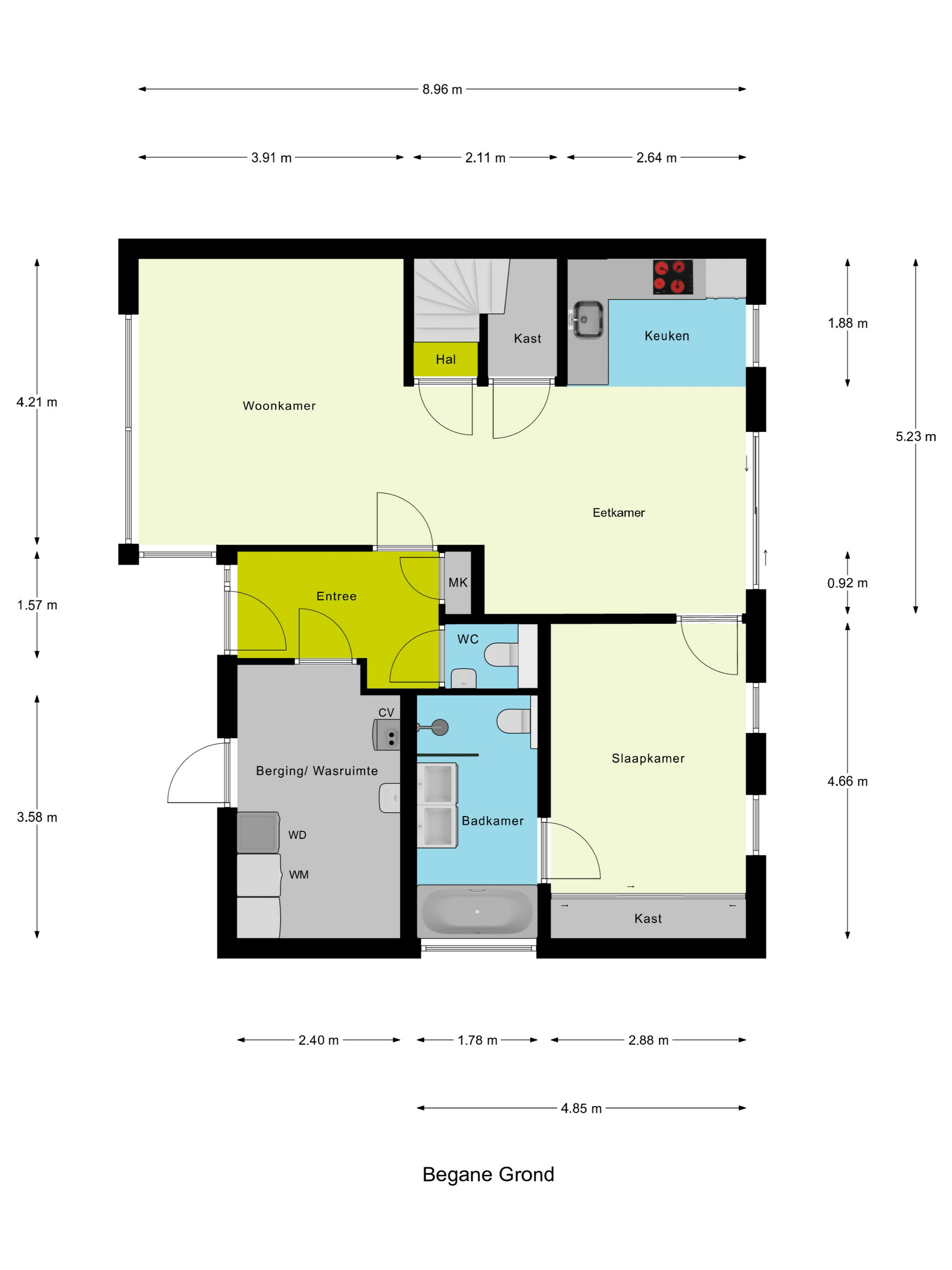 Entree, hal, toilet, meterkast, woonkamer met eiken vloerdelen parket en vrij zicht over de groenvoorziening aan de straatzijde, zit- en eetgedeelte, trapakst voor extra bergruimte, L-keuken voorzien van inductiekookplaat, combi-oven, vaatwasser(2024), koelkast(2023), afzuigkap (2022) en natuurstenen aanrechtblad. Via de schuifpui is de tuin bereikbaar. Via de hal is de ruime berging bereikbaar met daarin de CV ketel, wasmachine aansluiting, uitstortgootsteen en de WTW installatie. De slaapkamer op de begane grond is lekker ruim en is voorzien van een inbouw schuifkast en rolluiken. De badkamer is voorzien van een inloopdouche, ligbad, dubbele wastafel en een toilet.