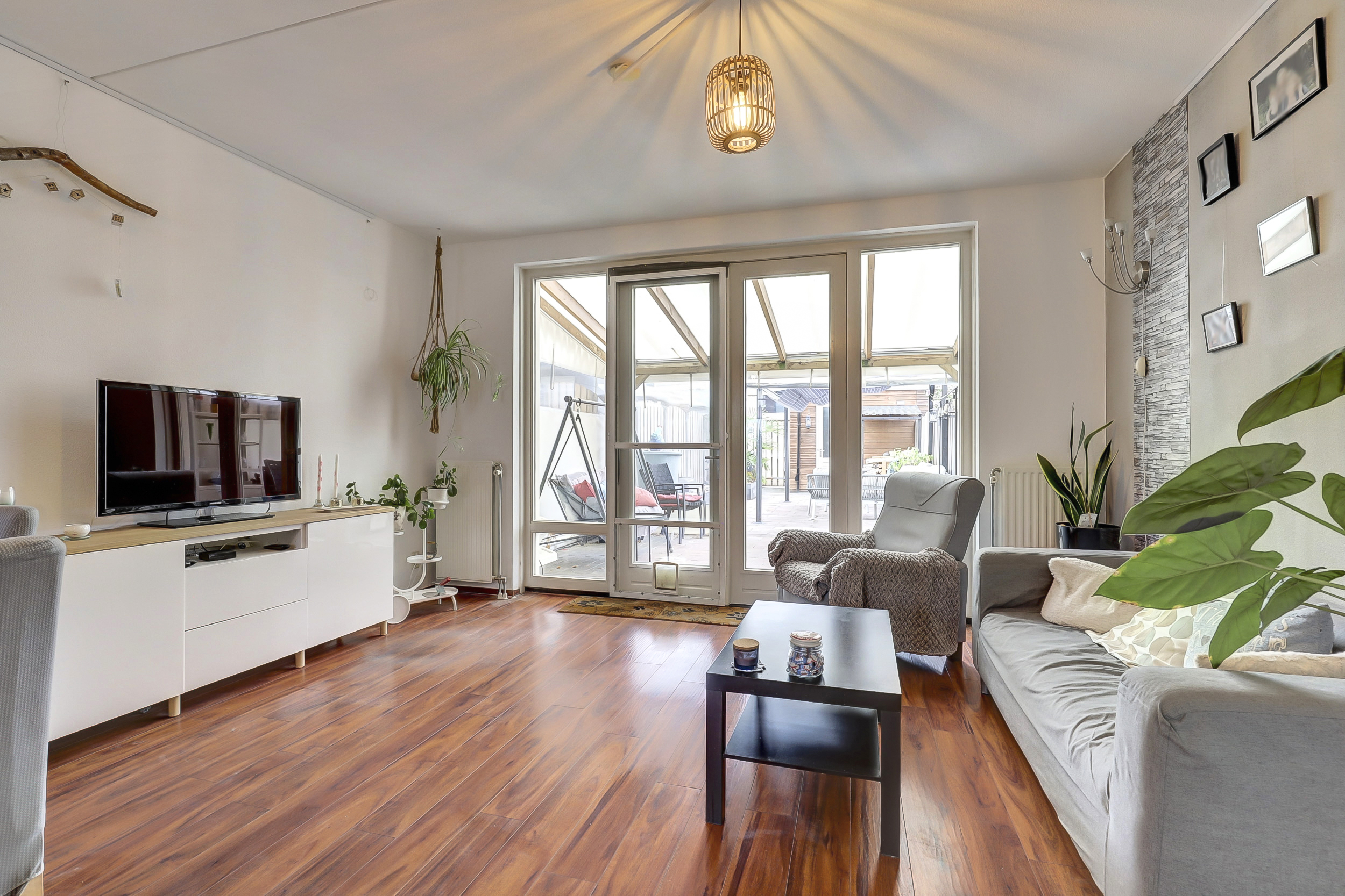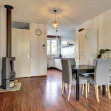 Via de entree kom je in de hal met toilet en toegang tot de lichte woonkamer. Dankzij de openslaande tuindeuren haal je buiten moeiteloos naar binnen, ideaal op lange zomeravonden of gewoon om even frisse lucht binnen te laten. De laminaatvloer zorgt voor een warme uitstraling van de ruimte, dit gevoel wordt versterkt door de hout gestookte allesbrander, die het hier in de winter opvallend behaaglijk maakt en zorgt voor lage energiekosten.