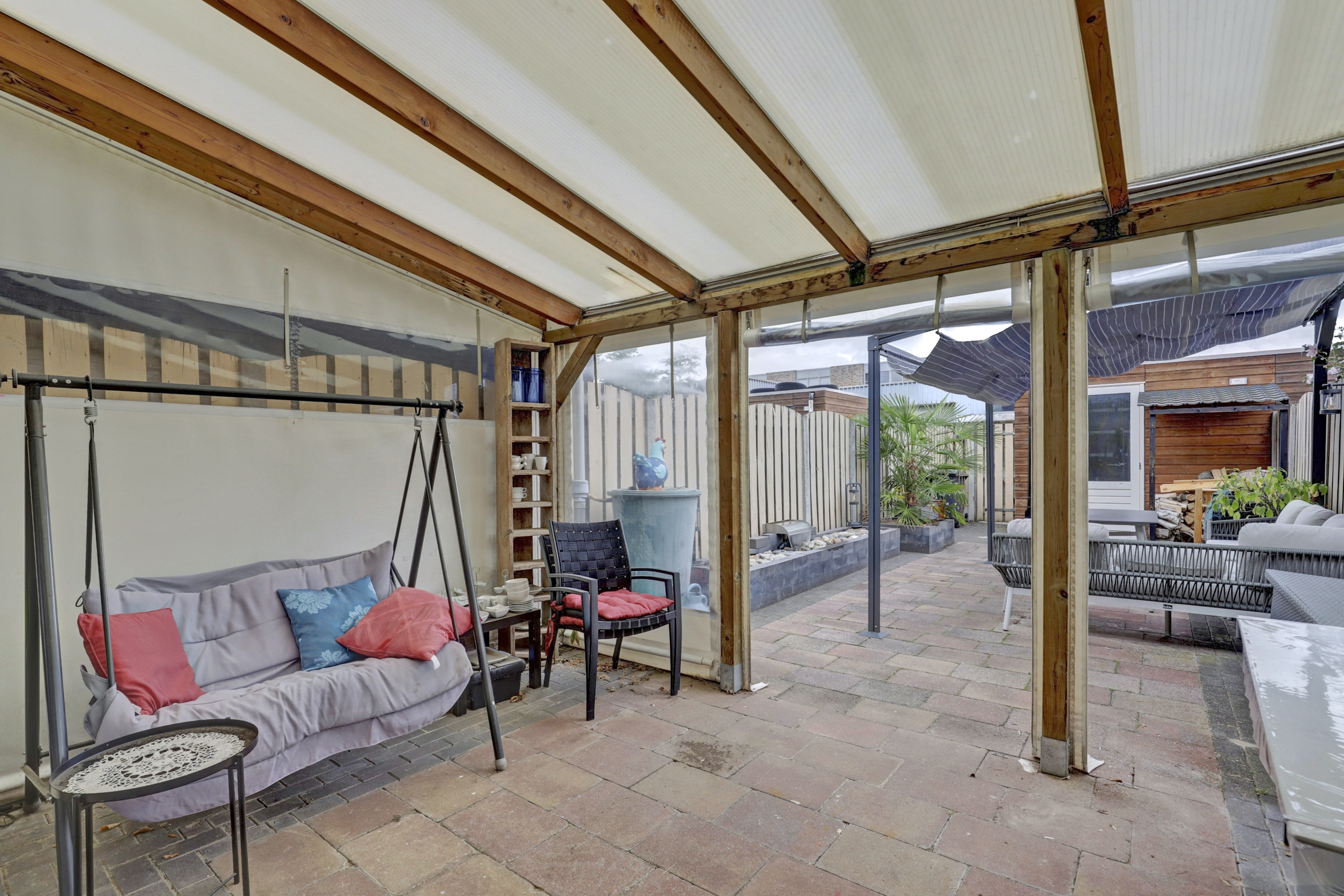 De achtertuin is praktisch ingericht en beschikt over een eigen achterom met mandelig achterpad. Er is een houten berging aanwezig voor fietsen en opslag.