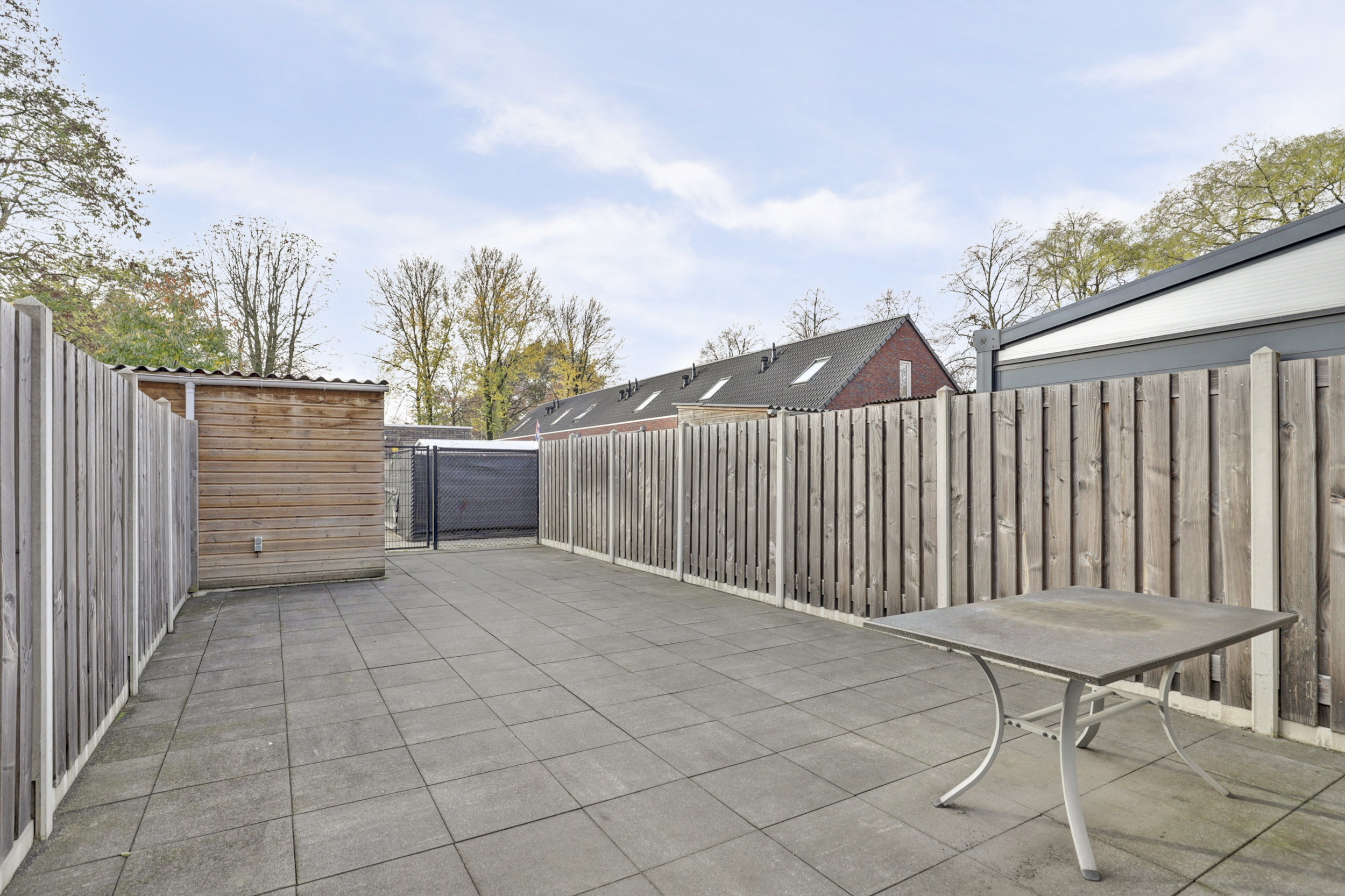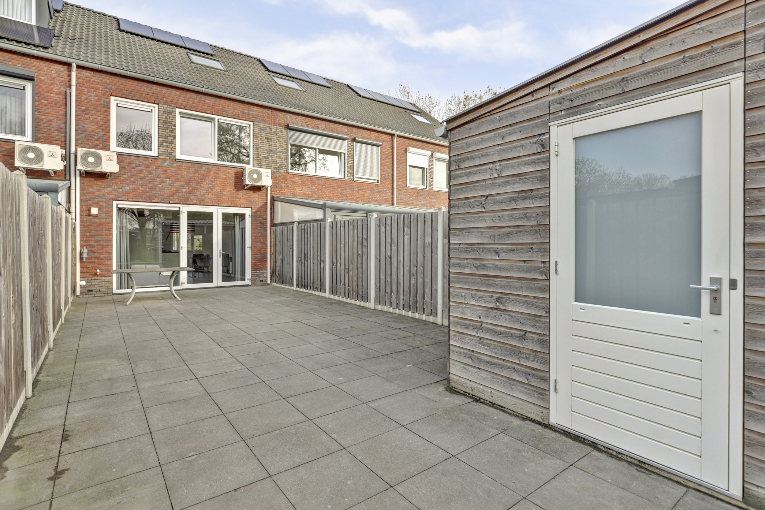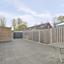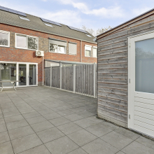 De achtertuin is geheel omheind en is voorzien van tegels waardoor er weinig onderhoud is. De tuin ligt op het zuiden en er is een achterom. In de berging aan de achterzijde kun je je fietsen stallen. De achtertuin grenst aan het groen en er zijn geen directe achterburen, dit geeft mooi zicht en veel vrijheid