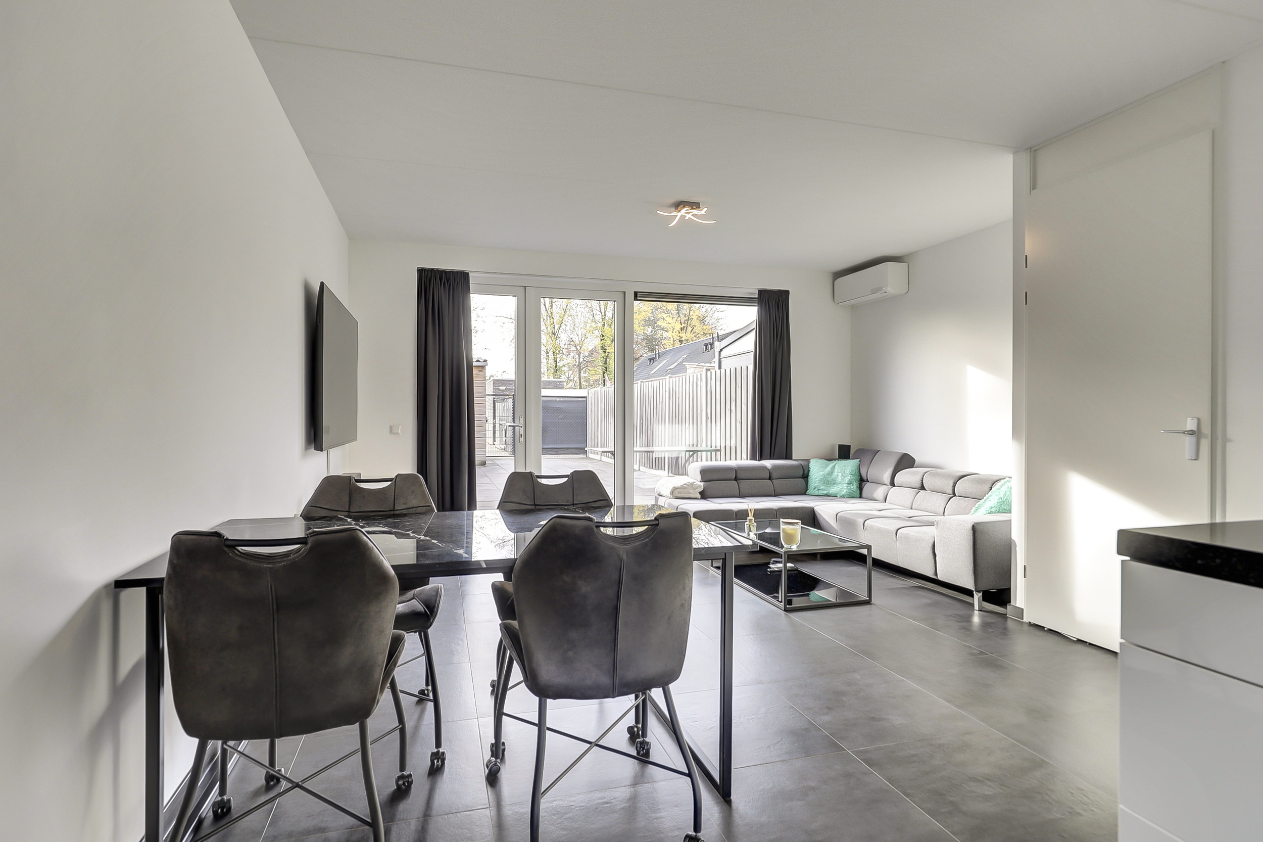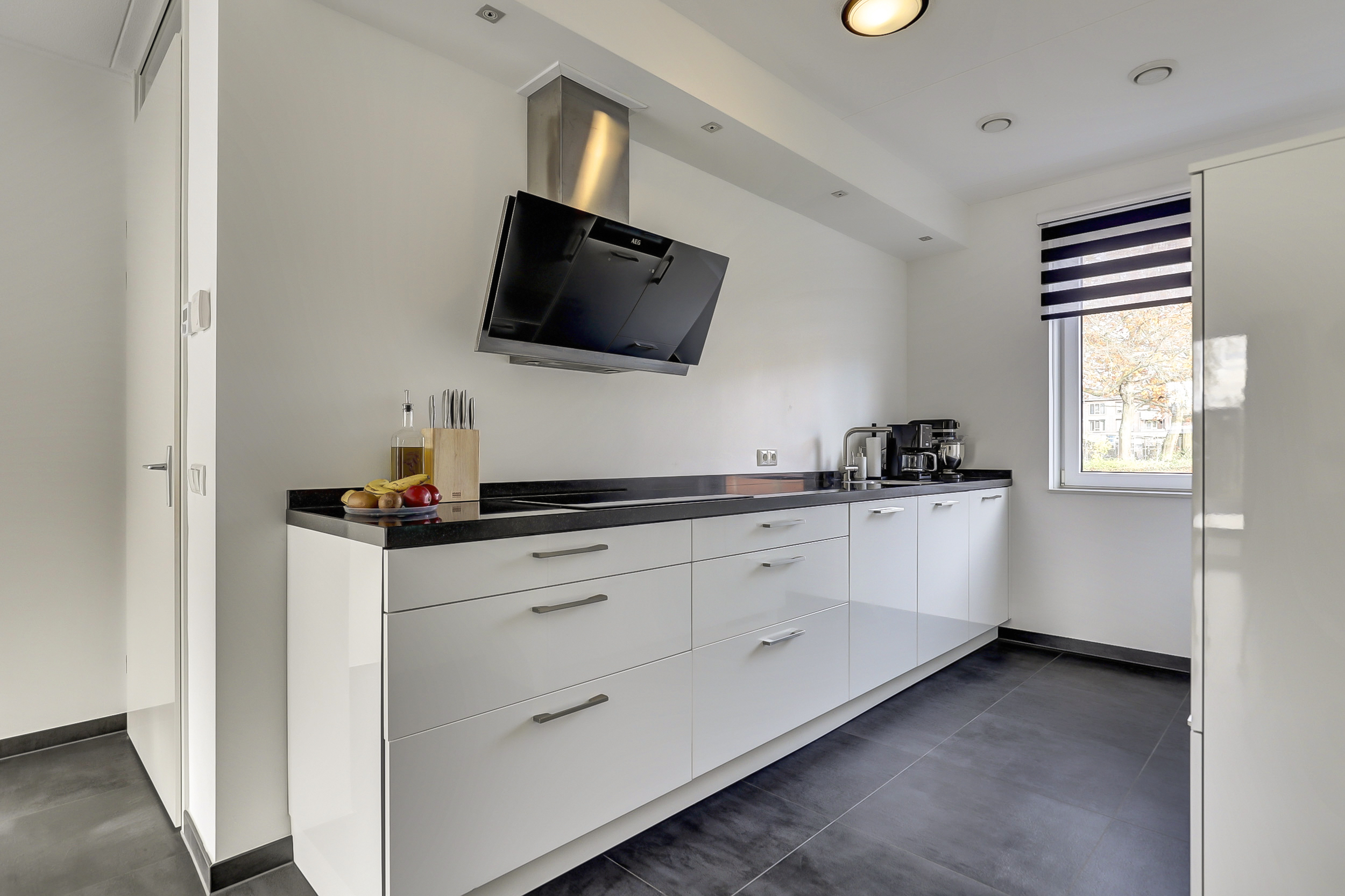 Entree, hal, meterkast toilet, lichte woonkamer voorzien van airco en openslaande tuindeuren. De trapkast biedt extra opbergruimte. De open keuken ligt aan de voorzijde van de woning en heeft vrij zicht over groenstrook en de straat. De keuken biedt aan 2 zijdes veel kast- en laderuimte en is voorzien van inductiekookplaat, afzuigkap (met buitenafvoer), vaatwasser, koelkast, combi oven. De begane grond is voorzien van een mooie donkere tegelvloer met comfortabele vloerverwarming. Via de openslaande tuindeuren is de achtertuin gemakkelijk bereikbaar.