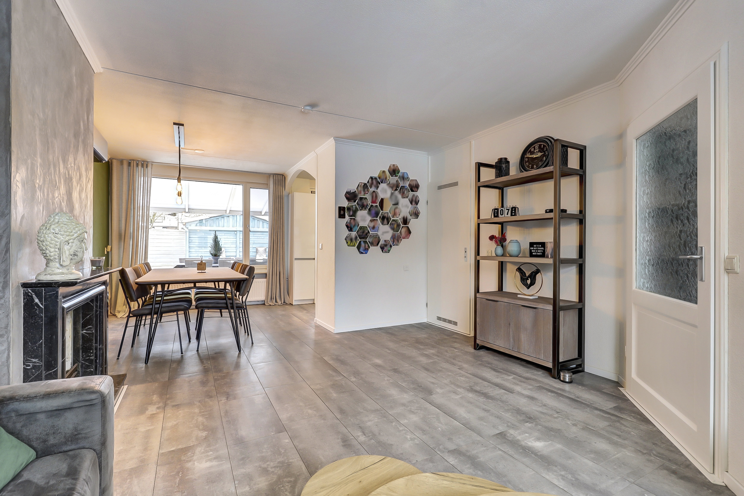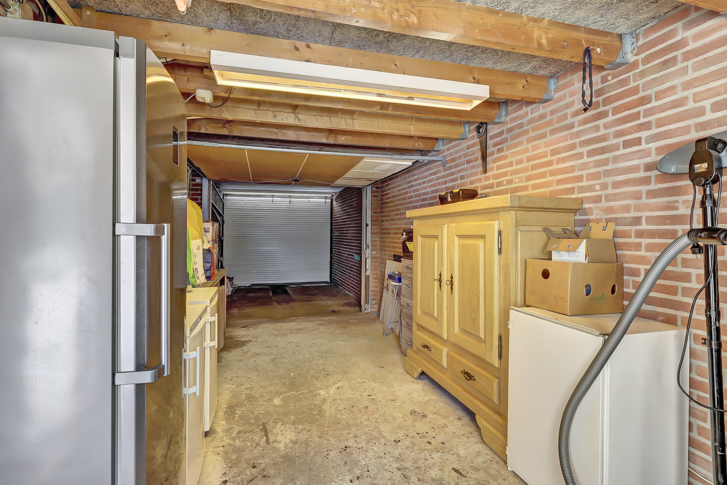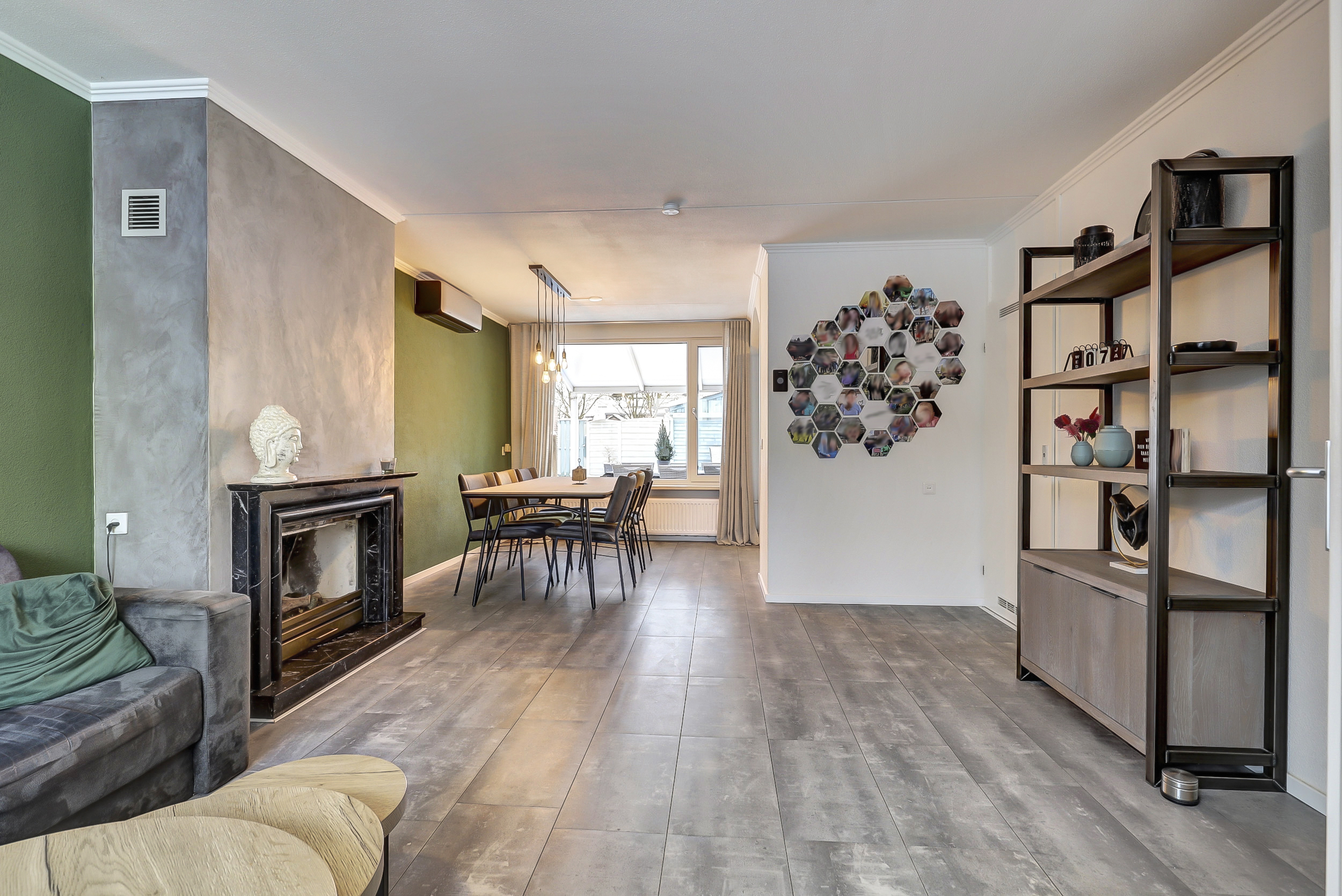 Hal, toilet (2022), trapopgang (trap in 2021 gerenoveerd), meterkast (2021), ruime woonkamer met veel lichtinval, gashaard, airco (2023), PVC klikvloer (er is nog een houten vloer onder de PVC-vloer aanwezig), open keuken met moderne inbouwcombinatie (2021) voorzien van inductiekookplaat, afzuigkap, vaatwasser, koelkast en combi oven. De begane grond is geheel voorzien van rolluiken. De verlengde garage biedt ruimte om 2 auto’s te parkeren. De rolpoort aan de straatzijde functioneert niet, de garage is via een loopdeur vanuit de tuinzijde bereikbaar.