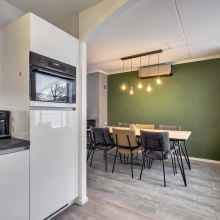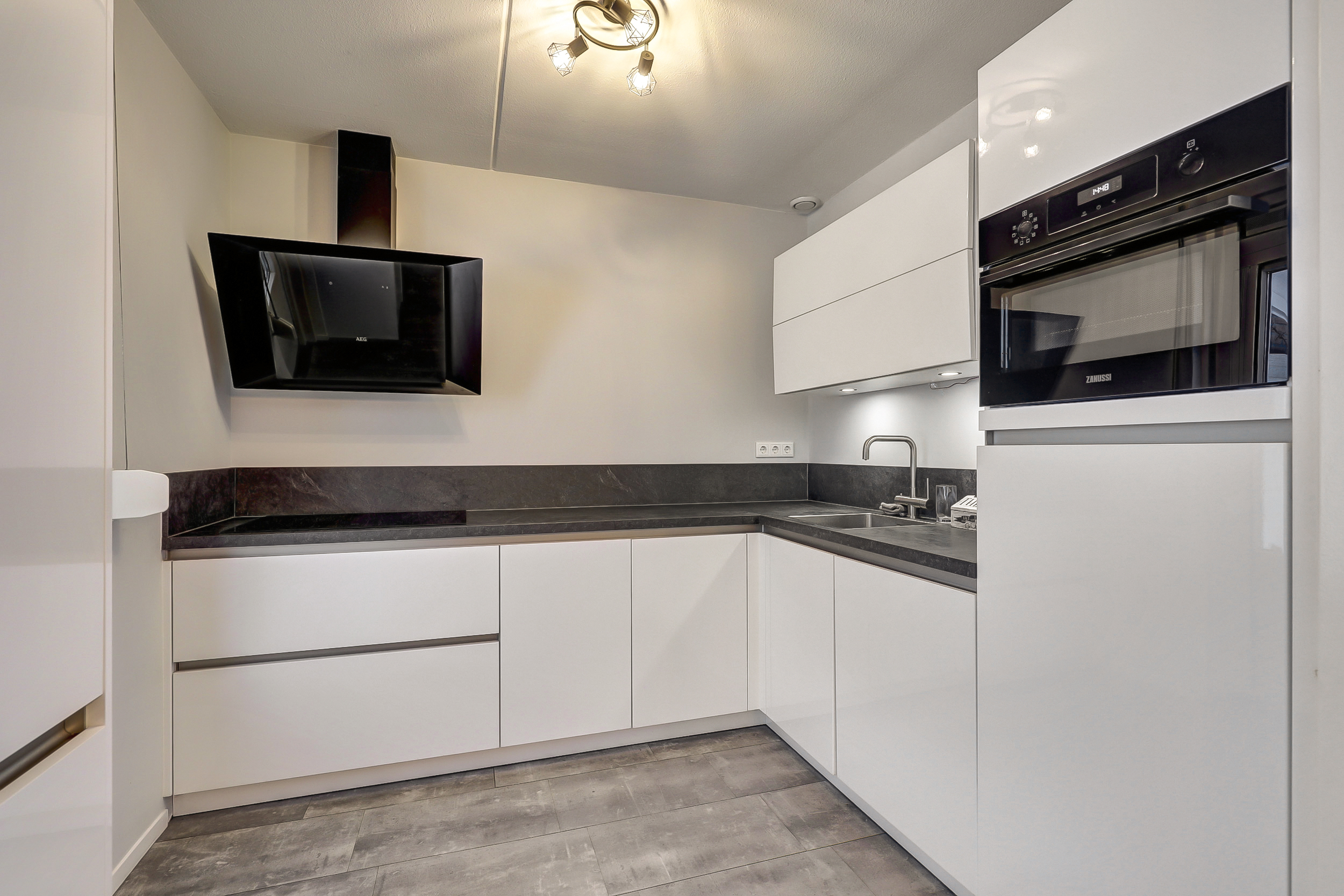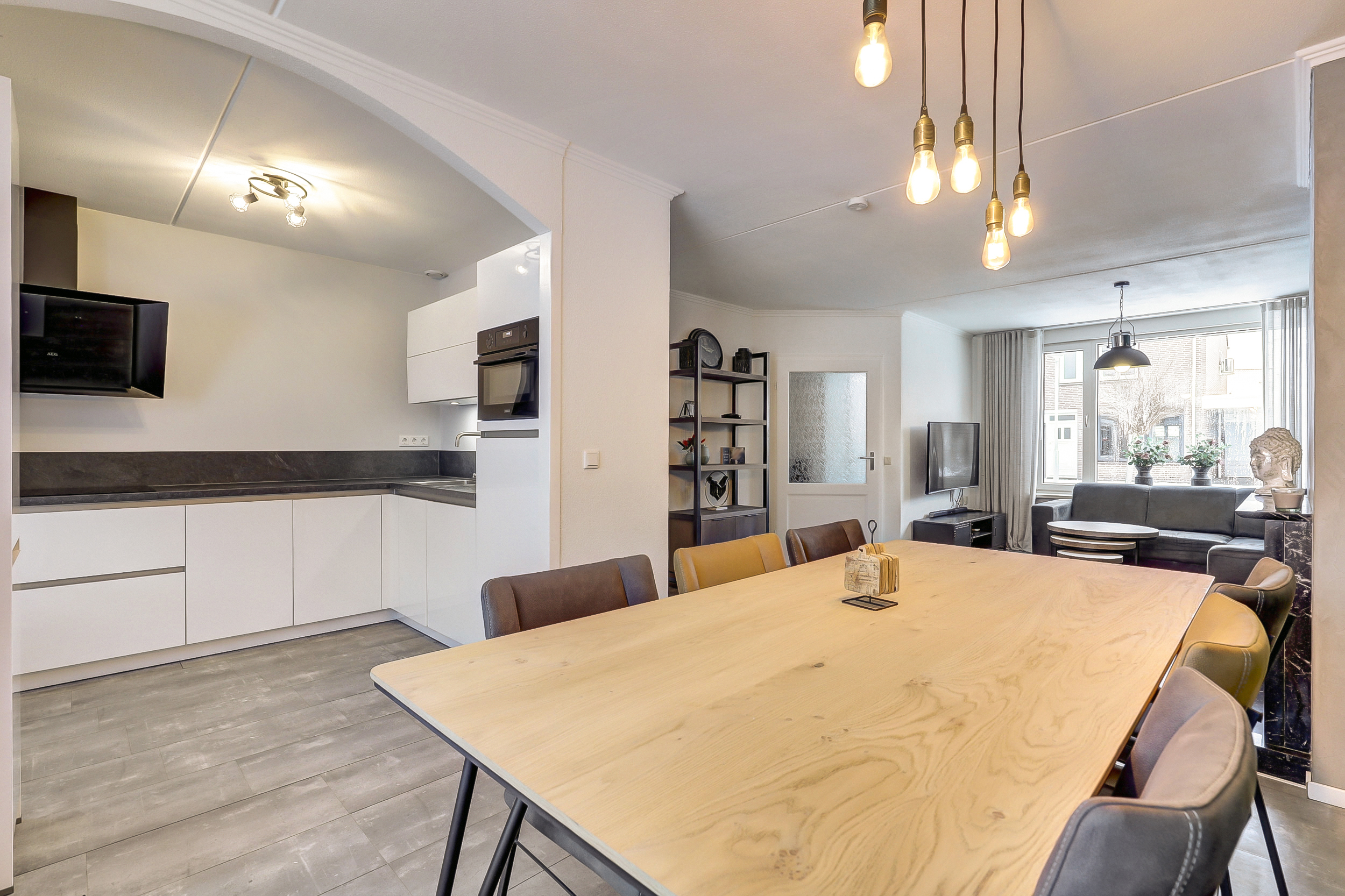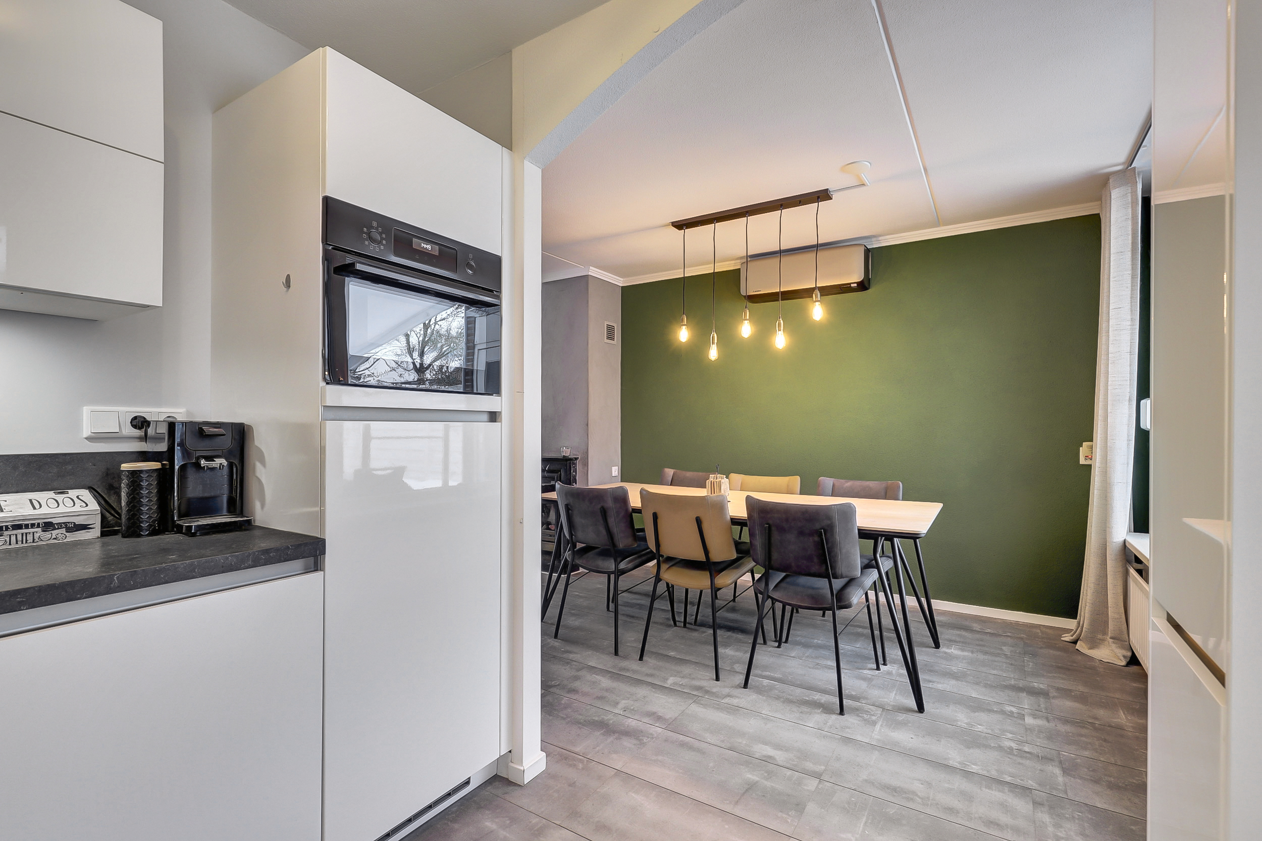 Hal, toilet (2022), trapopgang (trap in 2021 gerenoveerd), meterkast (2021), ruime woonkamer met veel lichtinval, gashaard, airco (2023), PVC klikvloer (er is nog een houten vloer onder de PVC-vloer aanwezig), open keuken met moderne inbouwcombinatie (2021) voorzien van inductiekookplaat, afzuigkap, vaatwasser, koelkast en combi oven. De begane grond is geheel voorzien van rolluiken. De verlengde garage biedt ruimte om 2 auto’s te parkeren. De rolpoort aan de straatzijde functioneert niet, de garage is via een loopdeur vanuit de tuinzijde bereikbaar.