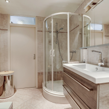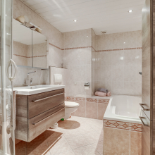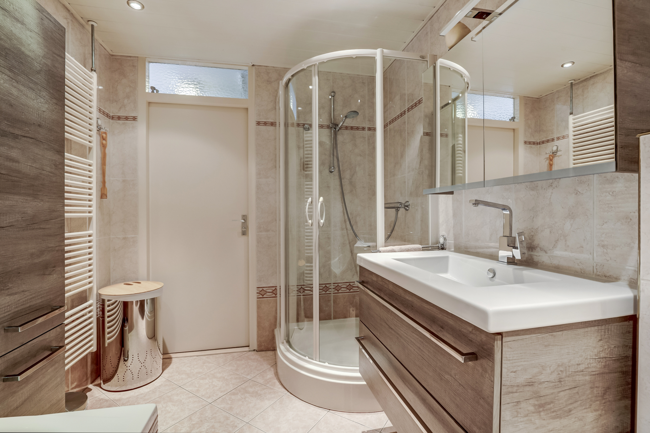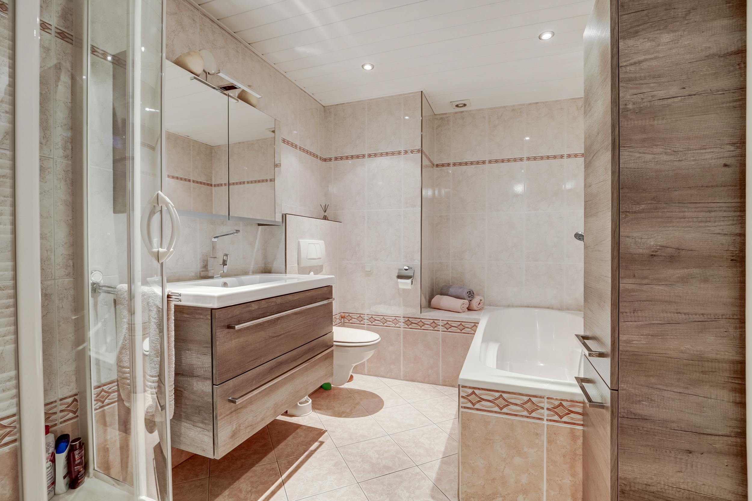 Complete en keurige badkamer met ligbad, douche, wastafel met ombouw en toilet.