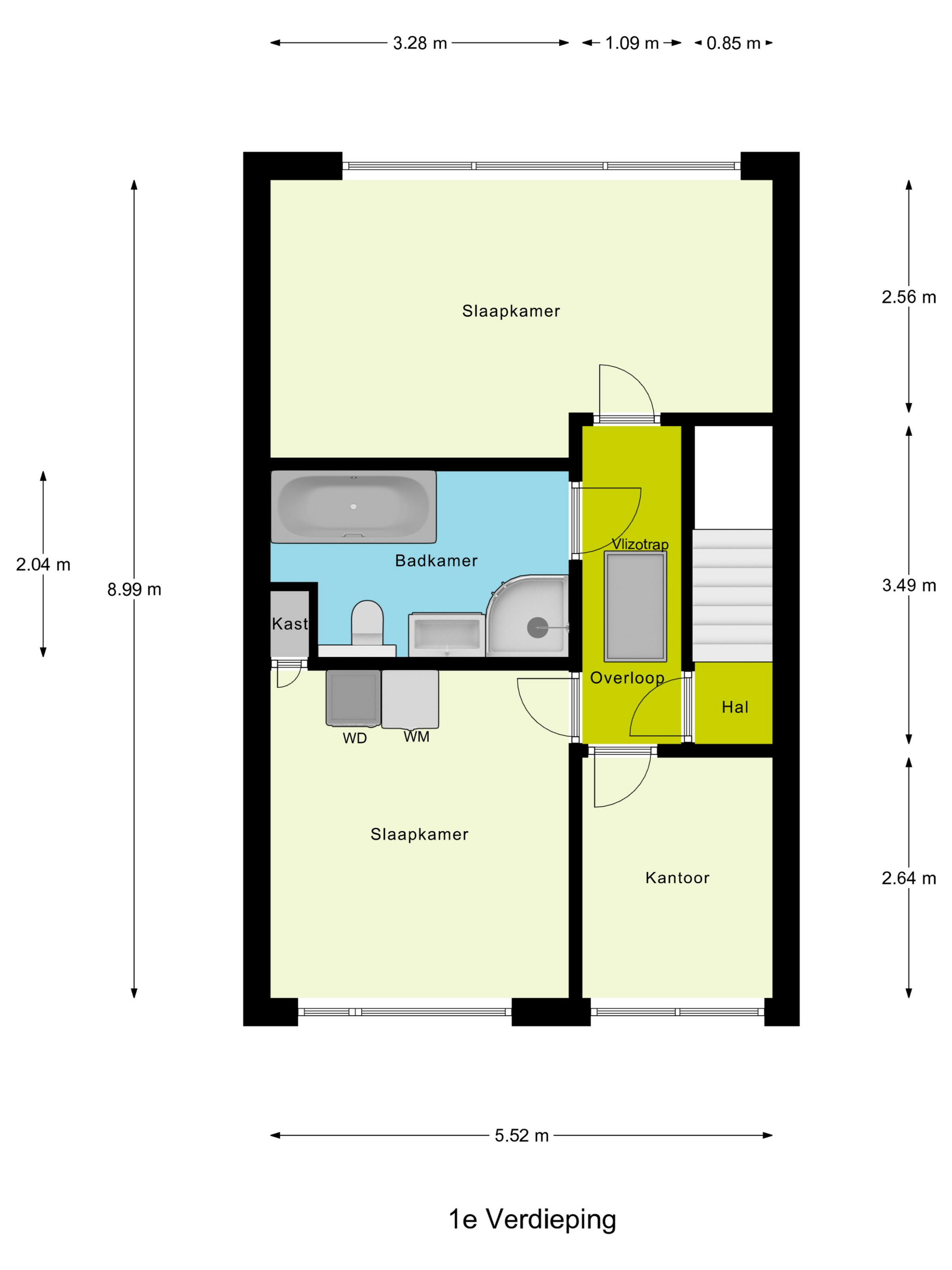 Op de eerste verdieping bevinden zich drie slaapkamers (ca. 14, 12 en 5 m²) en de badkamer. Op de 2e slaapkamer is was wasmachine- aansluiting gesitueerd.