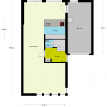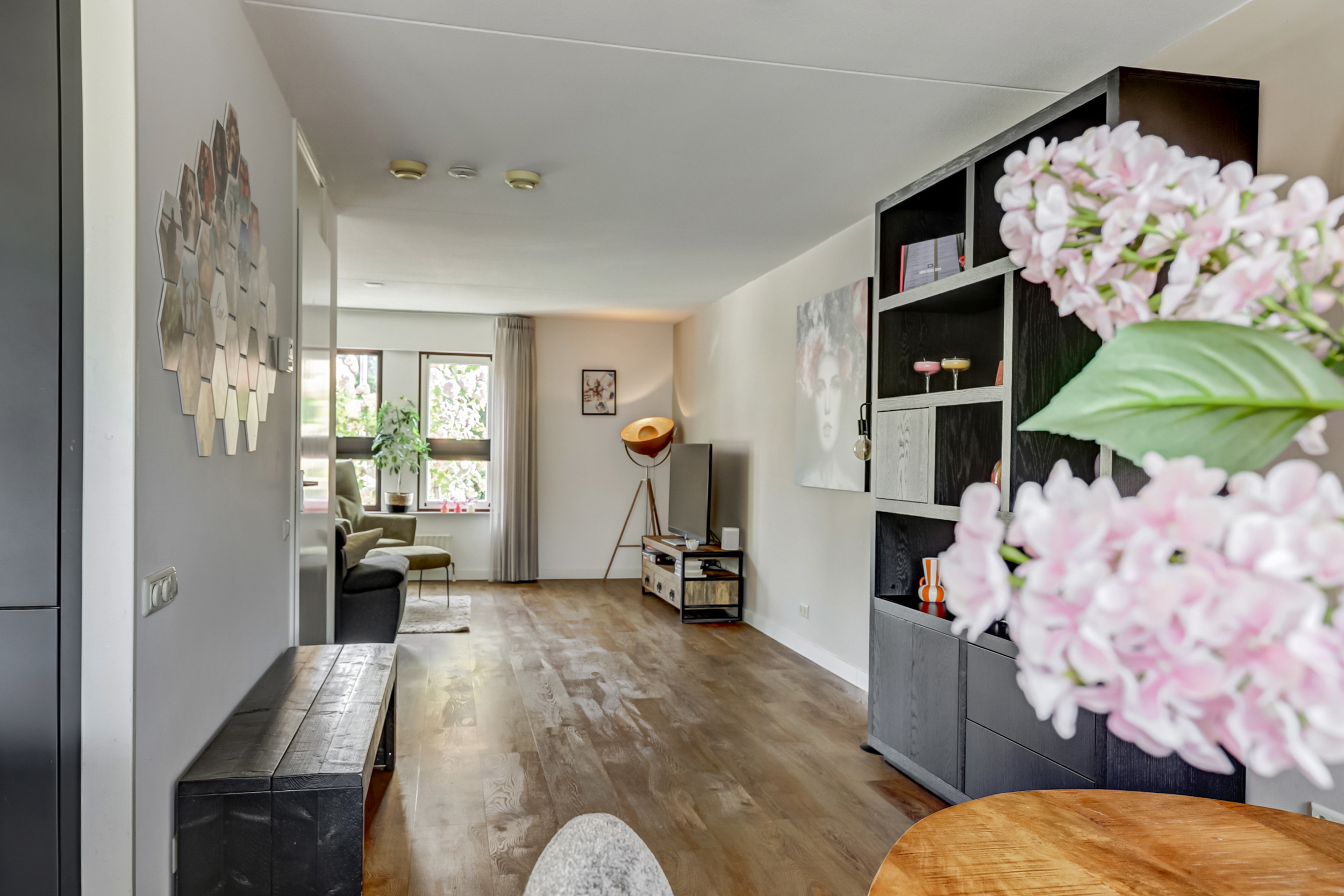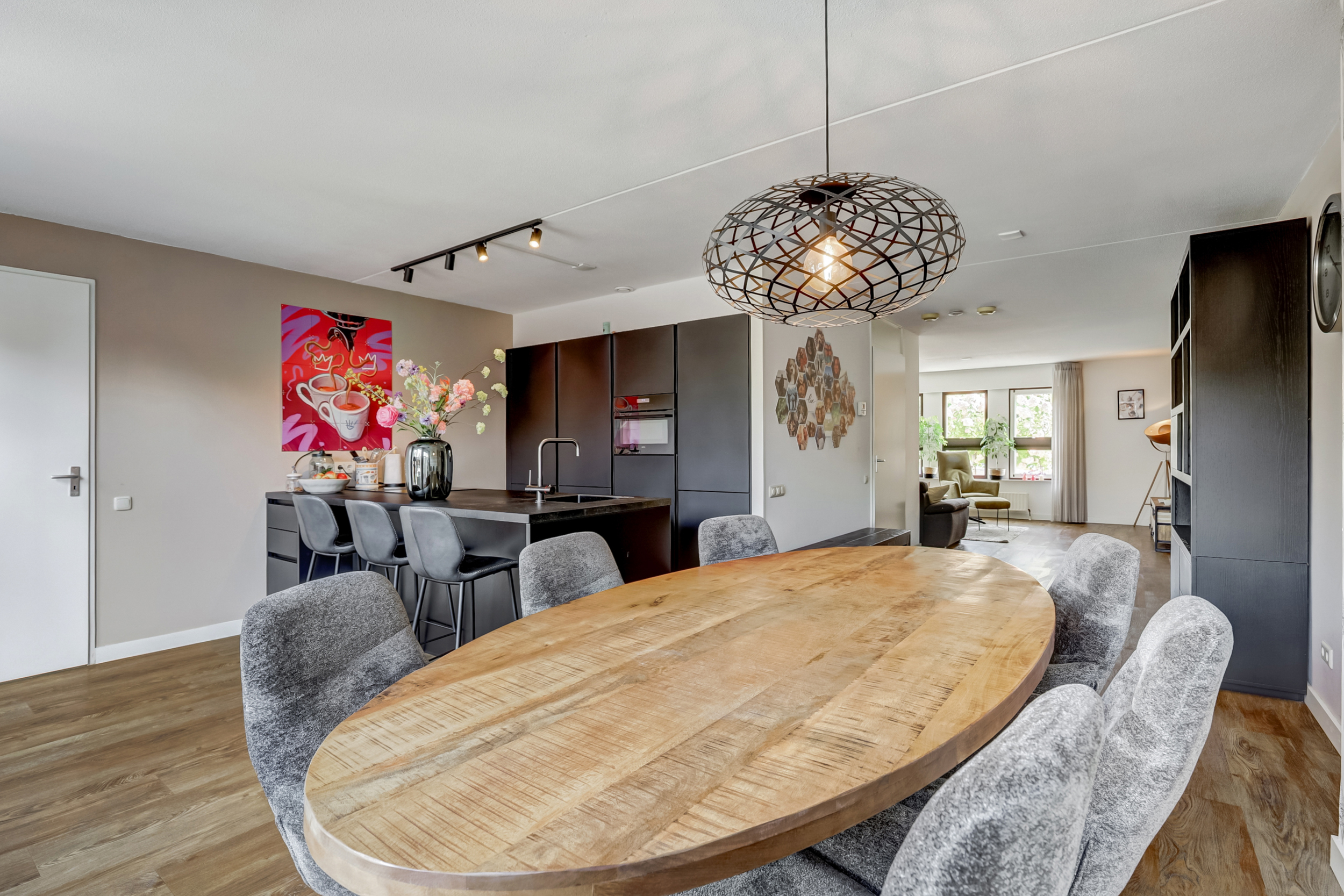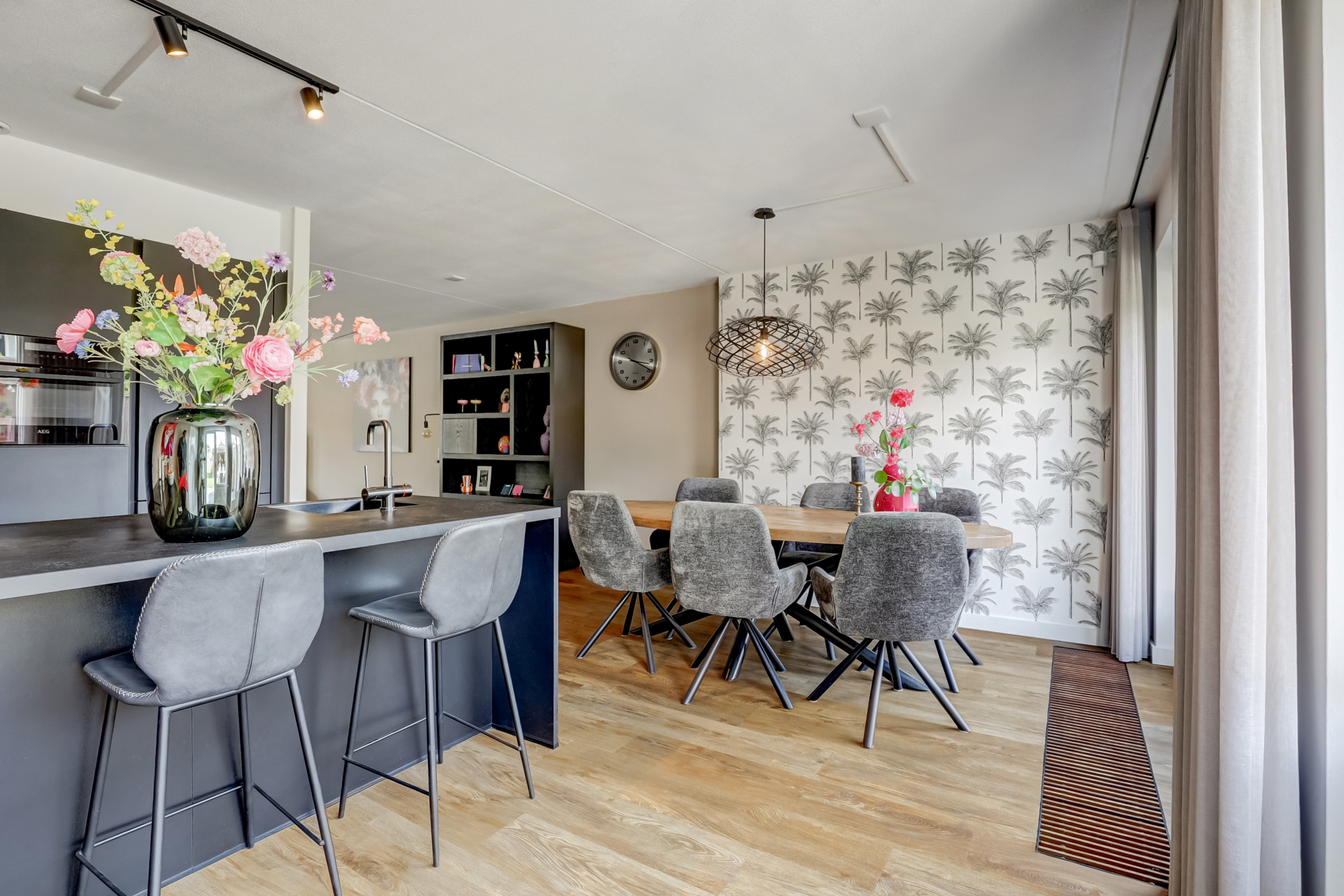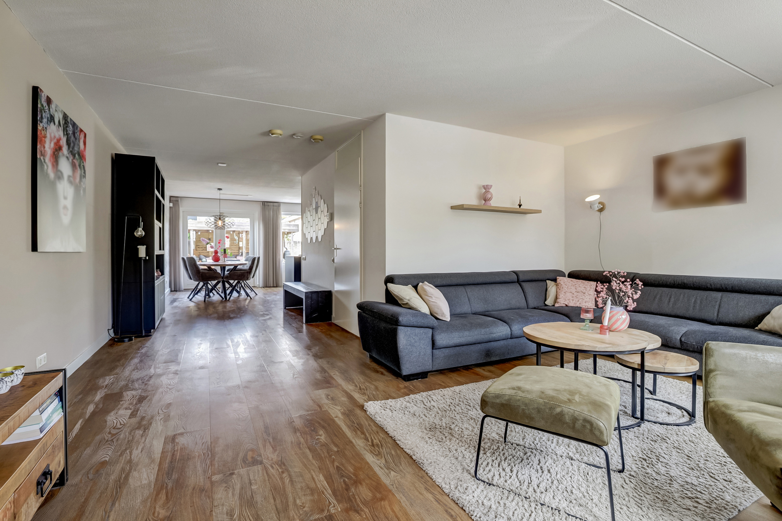 Hal, toilet (2023), meterkast, ruime uitgebouwde woonkamer met zitkamer aan de voorzijde en aan de achterzijde is de grote inbouwkeuken met kookeiland geplaatst. Aan het eiland zijn zitplaatsen gerealiseerd. De keuken is voorzien van complete inbouwapparatuur. Er is mooi zicht op de tuin inclusief de grote overkapping die achter in de tuin staat. De garage is vanuit de woning direct bereikbaar. De garage is uitgerust met een kantelpoort met een loopdeur zodat je een prettige “achterom” hebt.