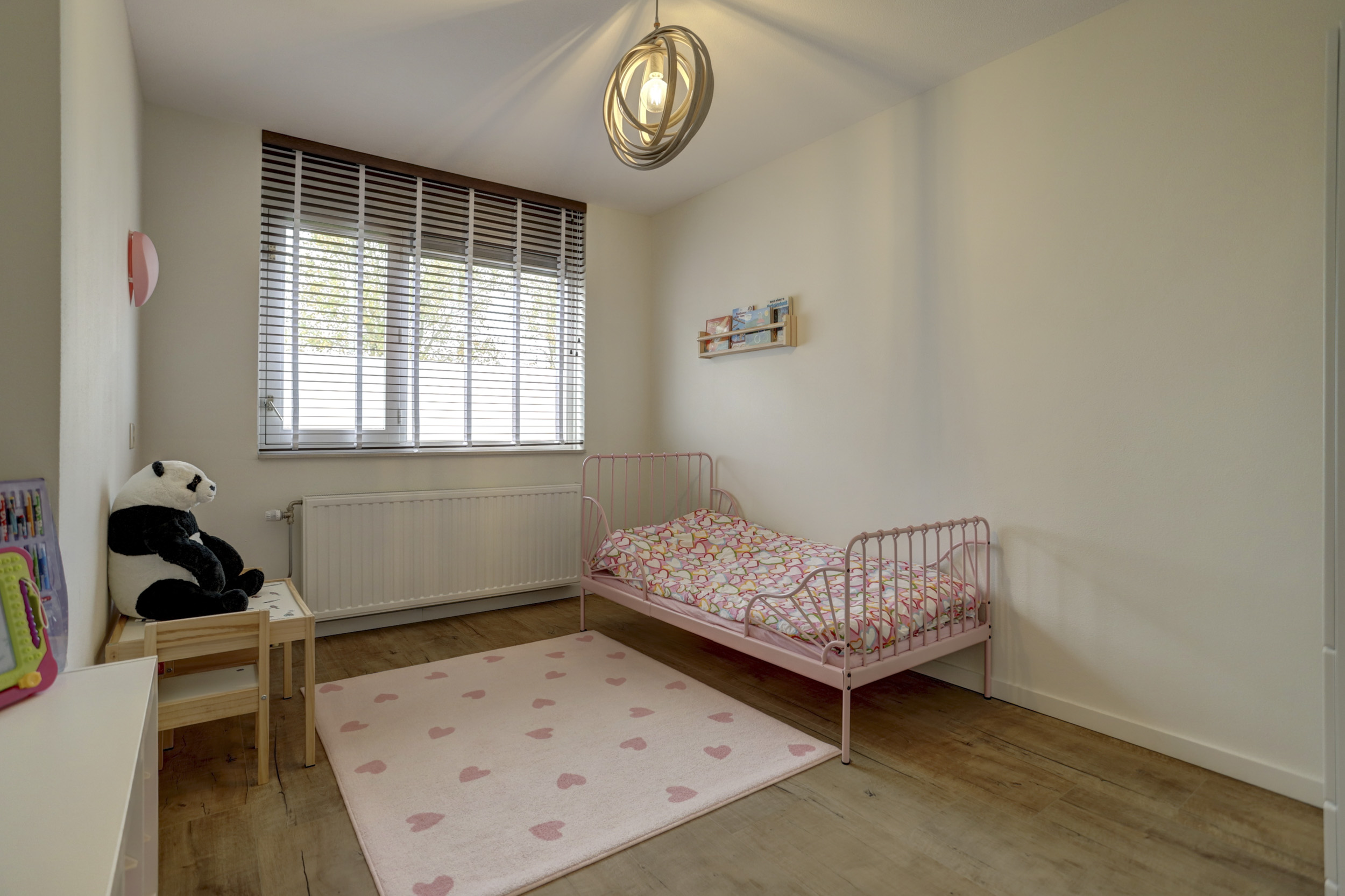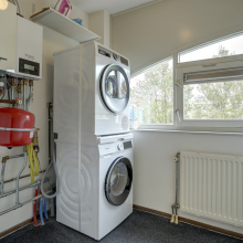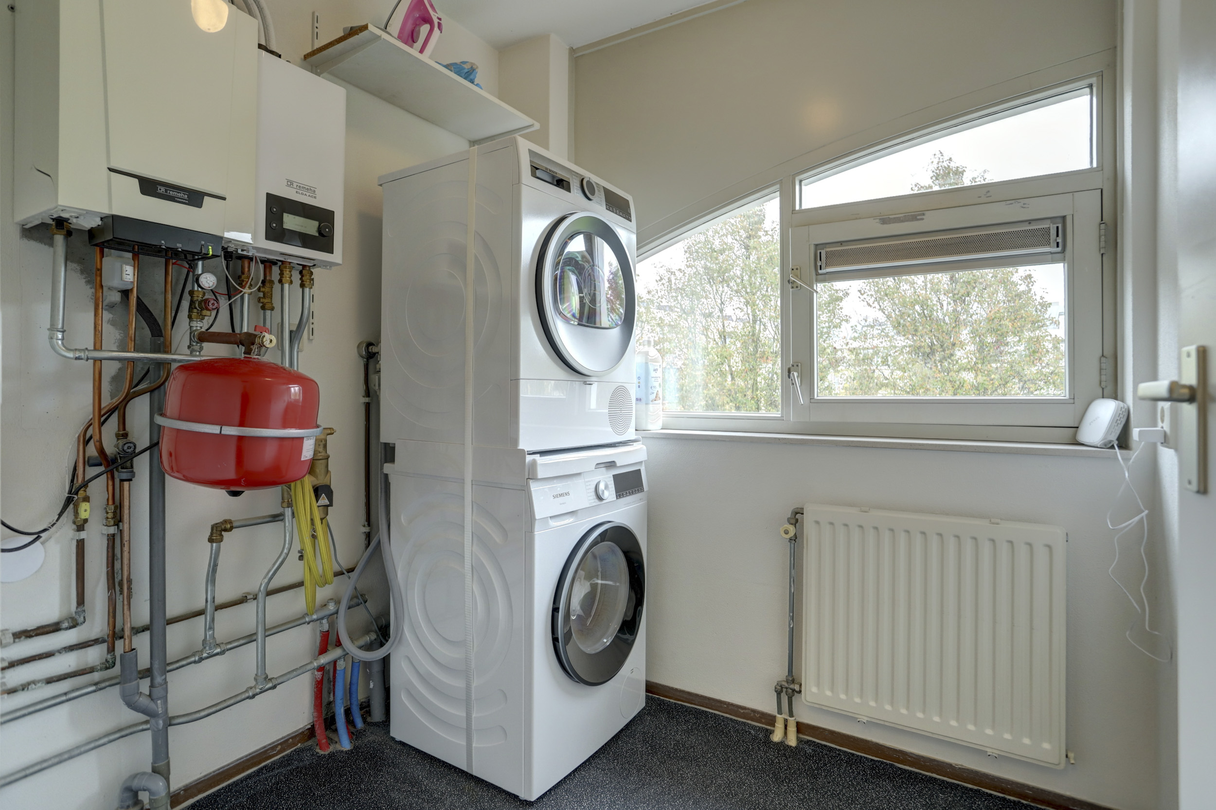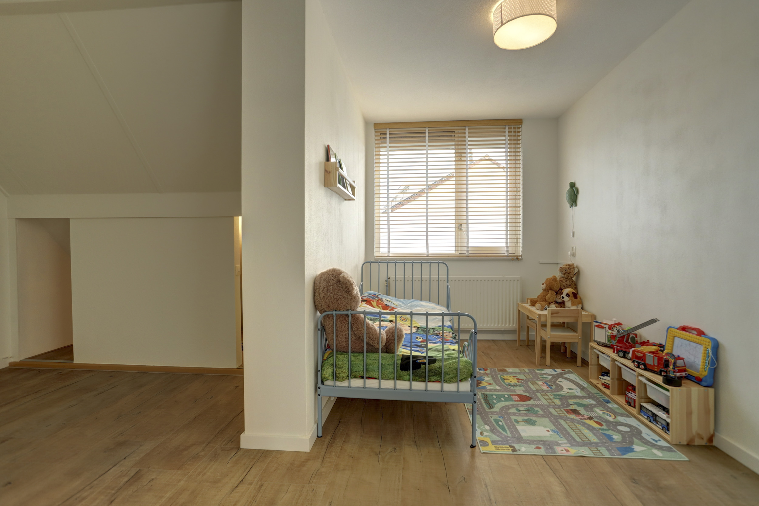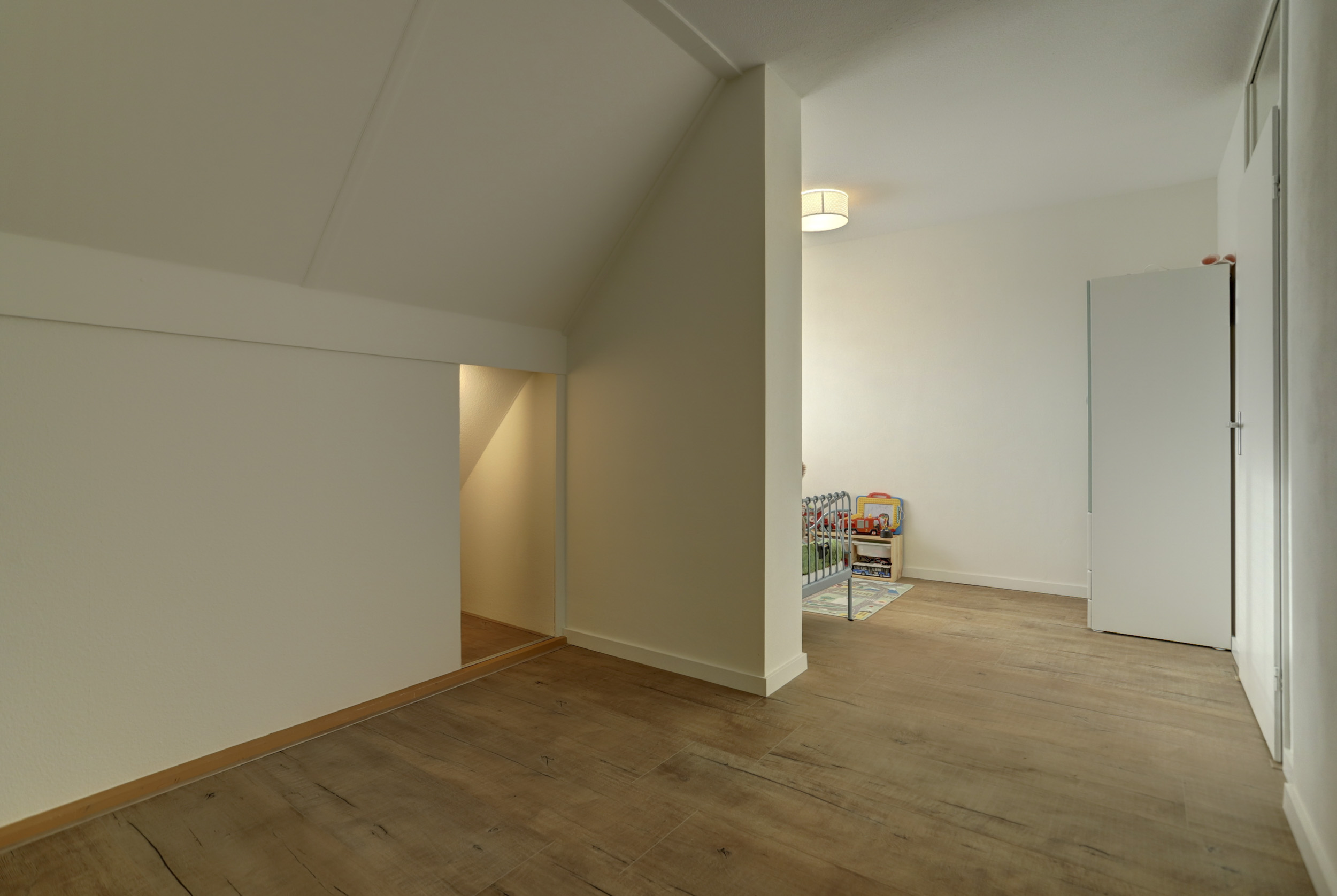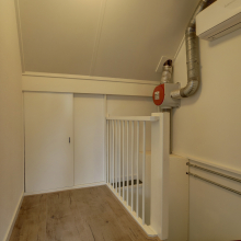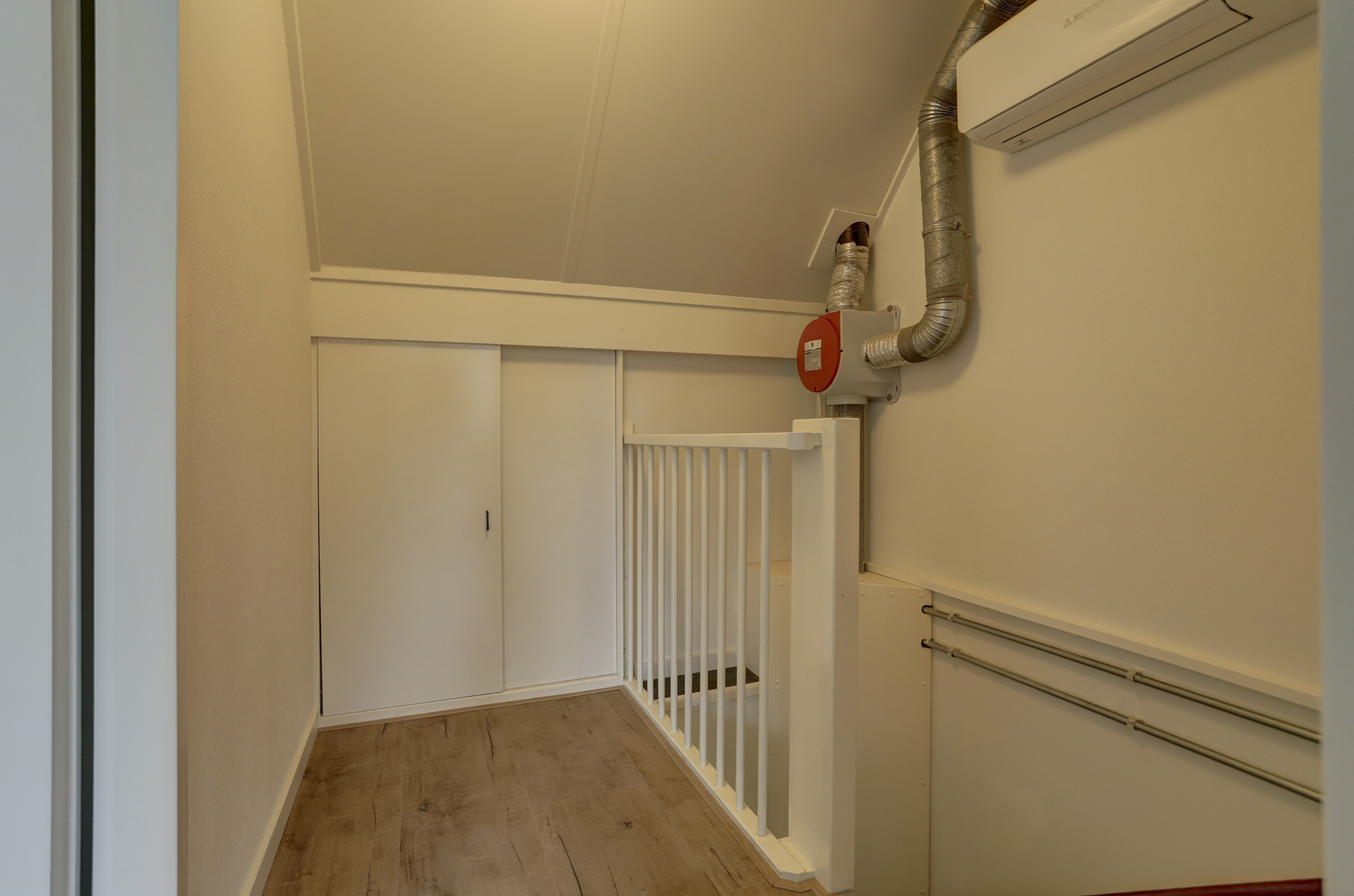 Vaste trap, overloop met airco, 3e slaapkamer met laminaatvloer en vaste schuifwandkast. Technische ruimte met wasmachine, en -droger aansluiting, Cv-ketel (Remeha Tzerra, eigendom, 2016), Remeha Elag Ace hybride warmtepomp (eigendom, 2023), omvormer voor de 15 zonnepanelen.