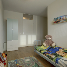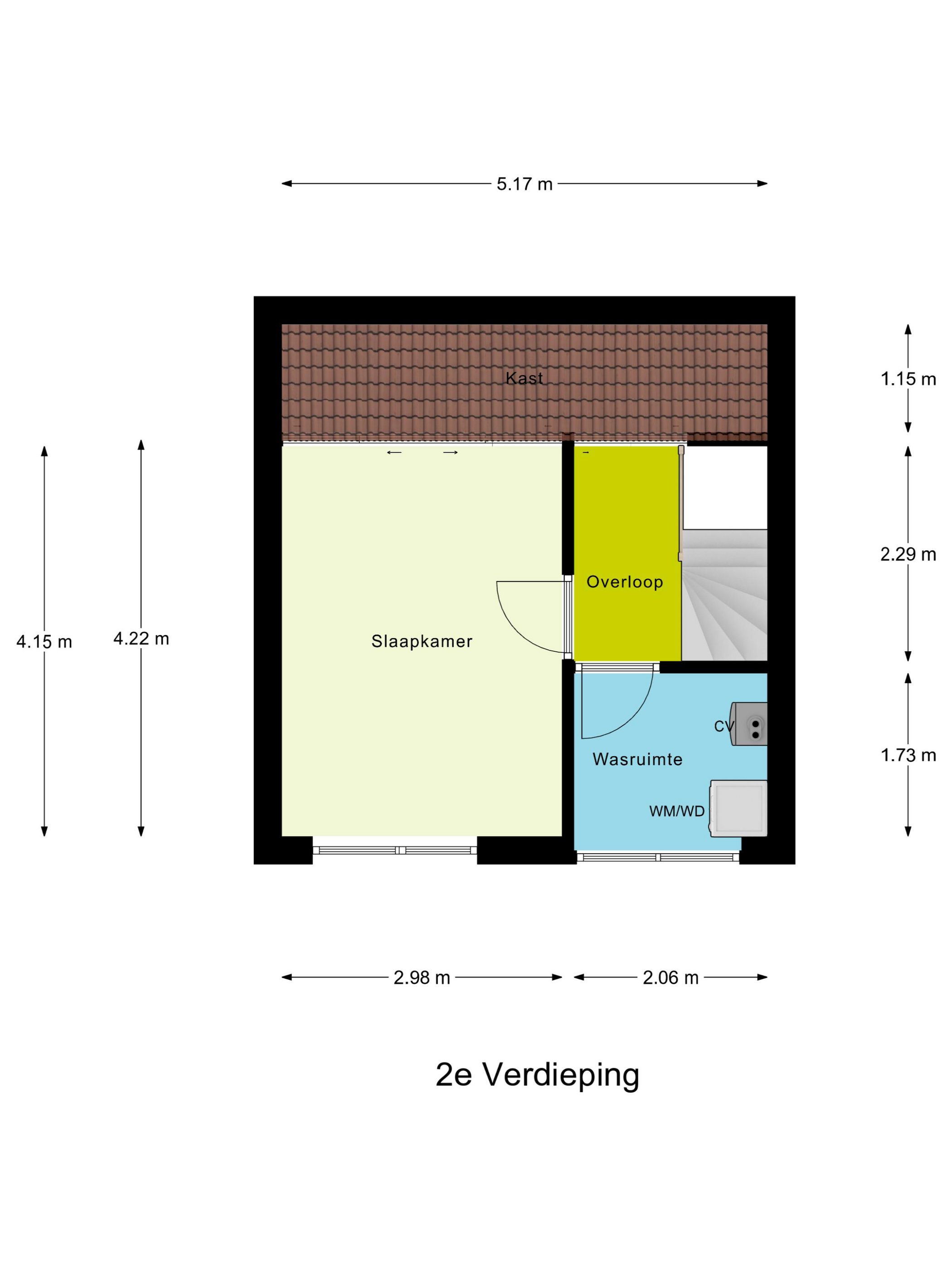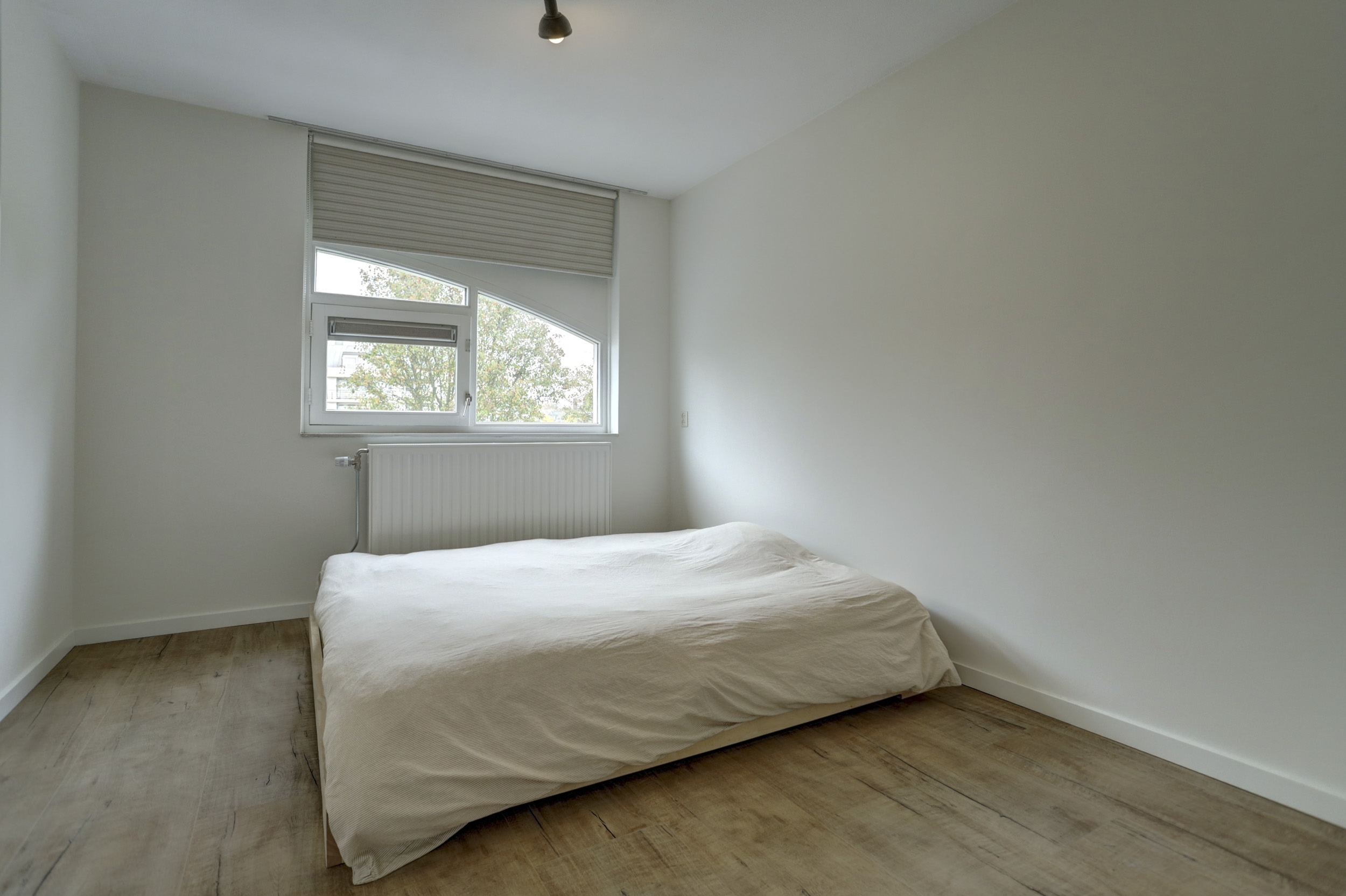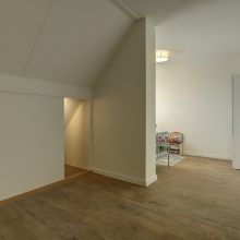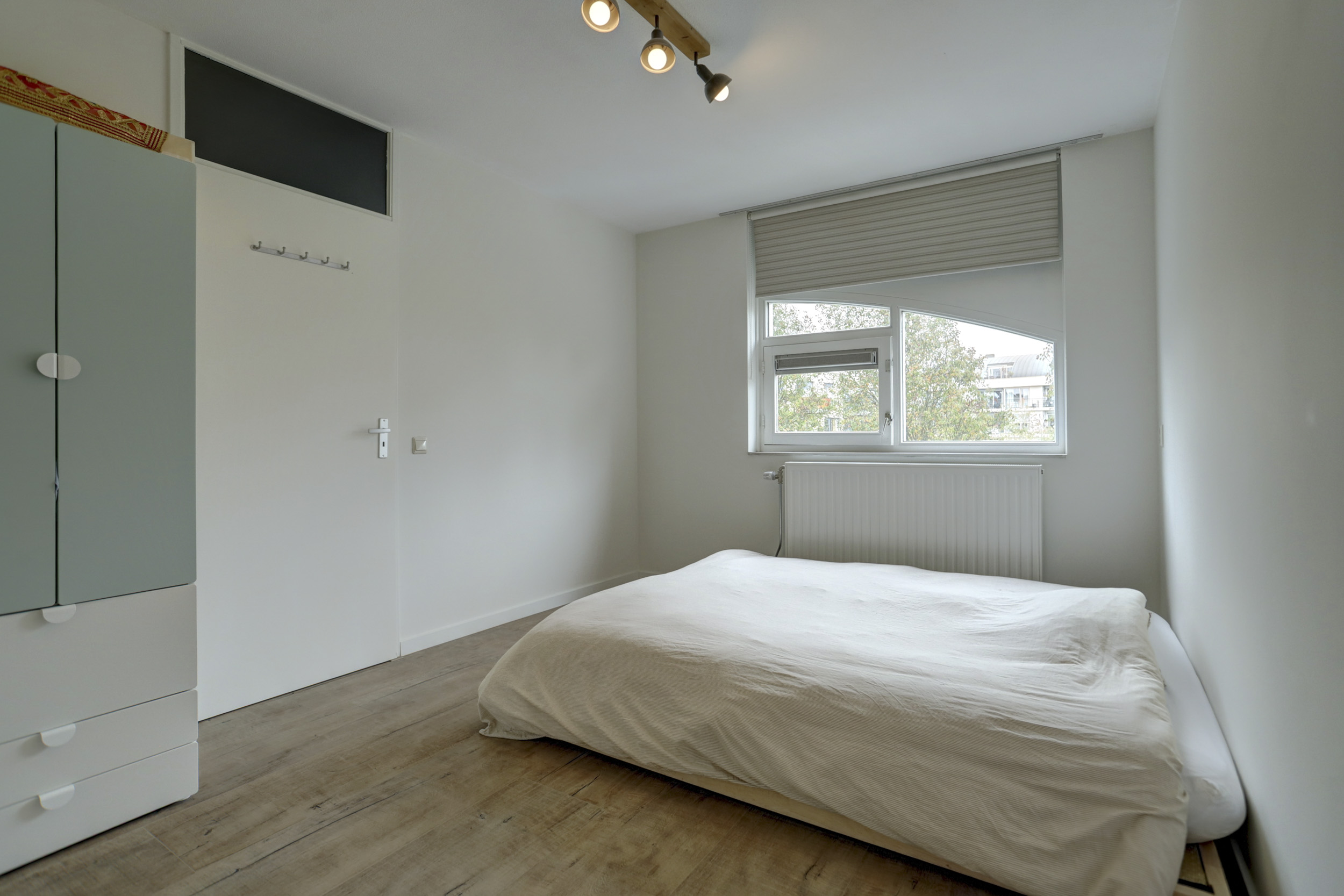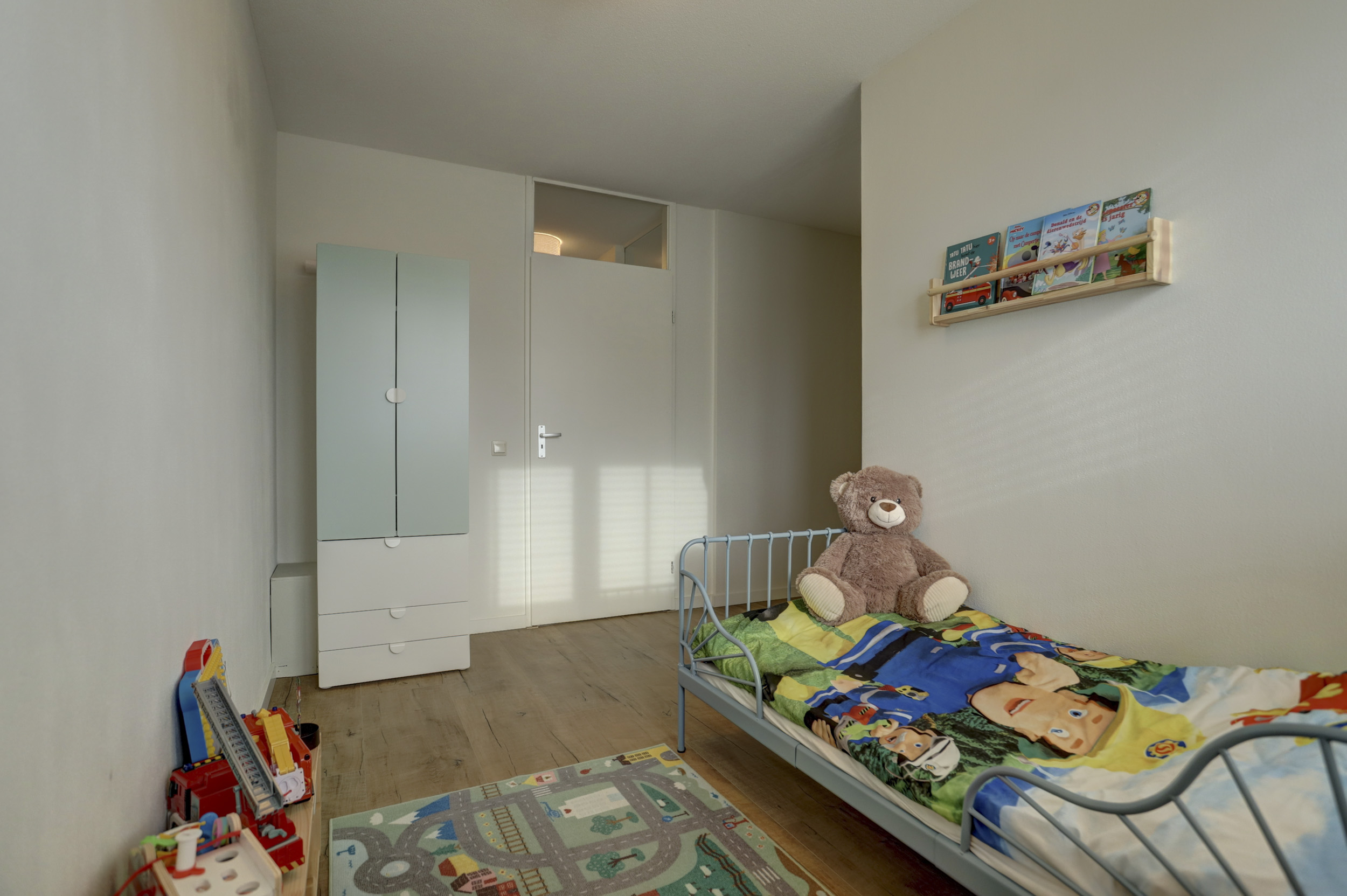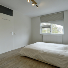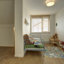 Vaste trap, overloop met airco, 3e slaapkamer met laminaatvloer en vaste schuifwandkast. Technische ruimte met wasmachine, en -droger aansluiting, Cv-ketel (Remeha Tzerra, eigendom, 2016), Remeha Elag Ace hybride warmtepomp (eigendom, 2023), omvormer voor de 15 zonnepanelen.