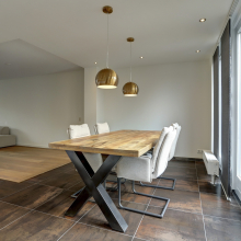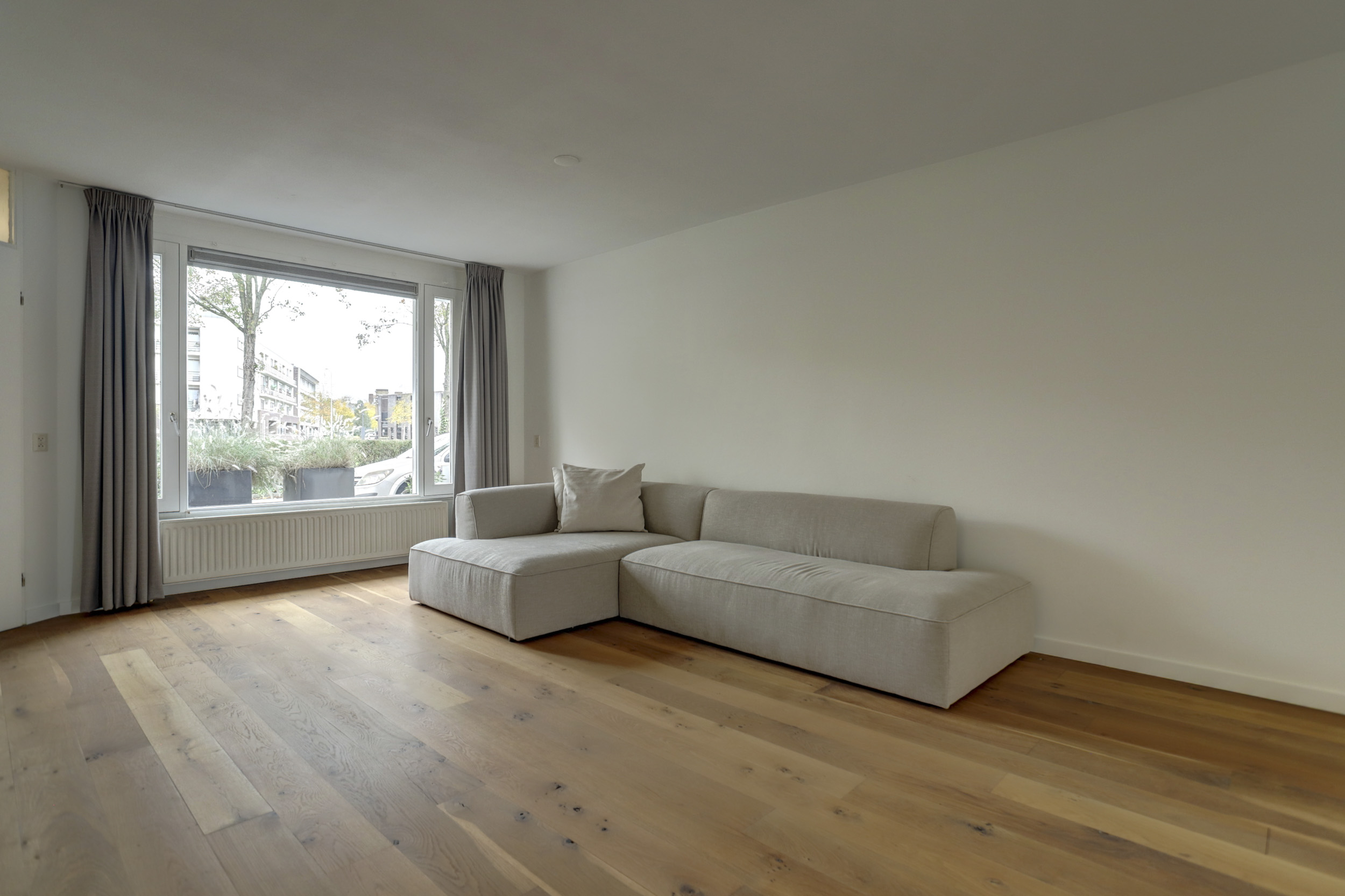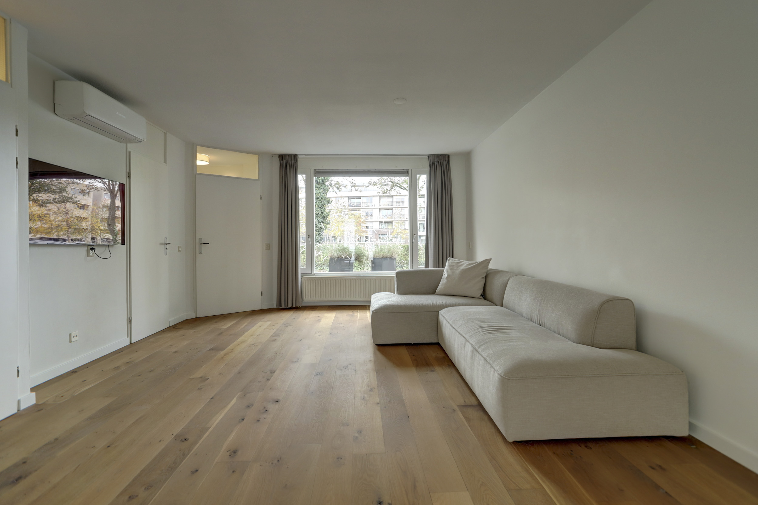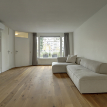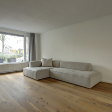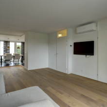 Woonkamer aan de voorzijde gelegen met ruime zithoek en airco. Warme eikenhouten vloer.