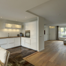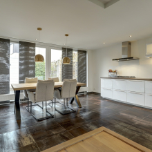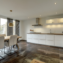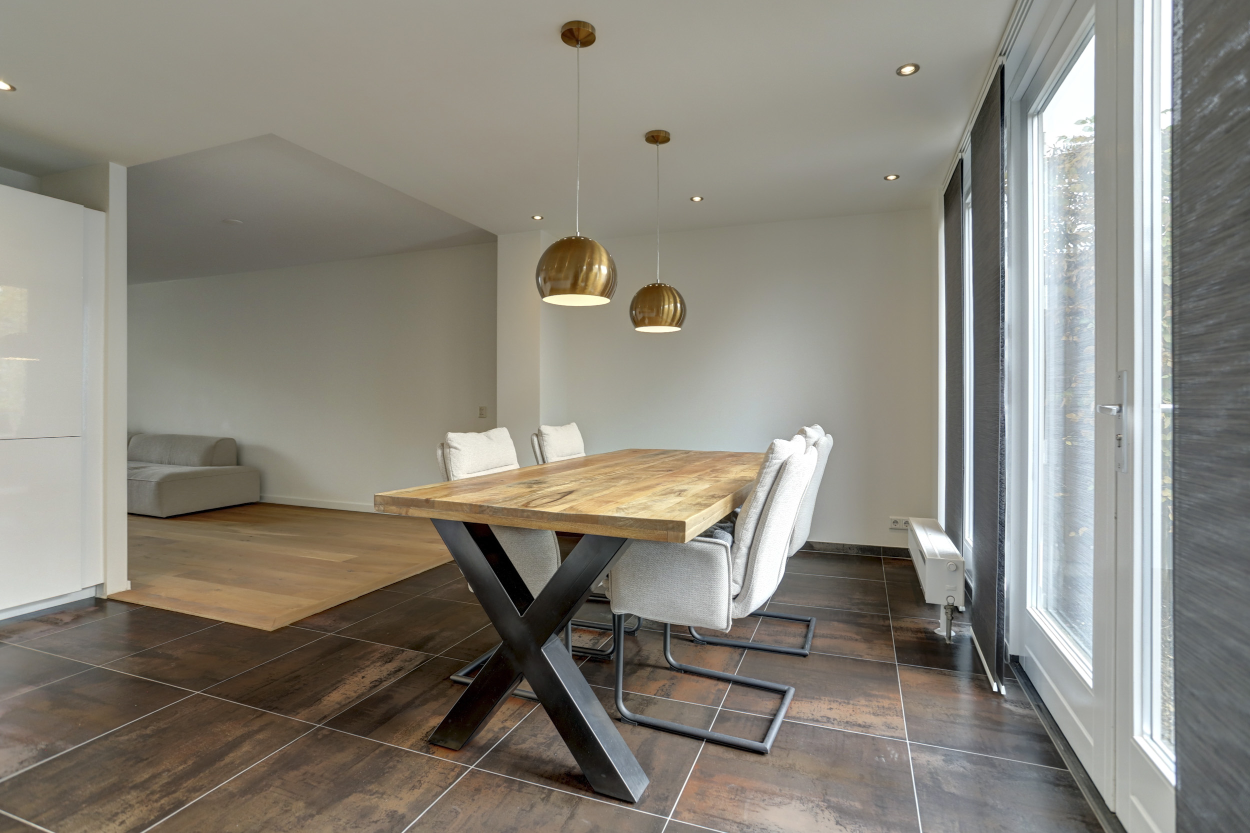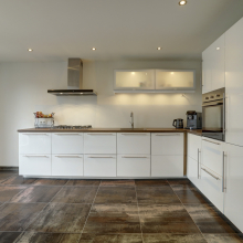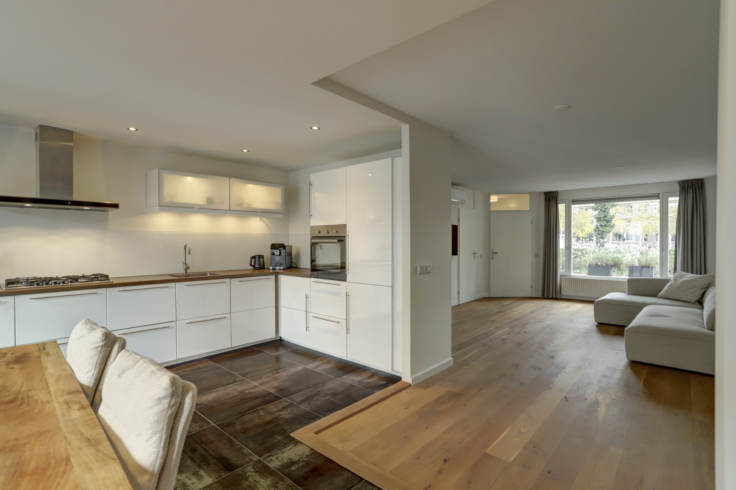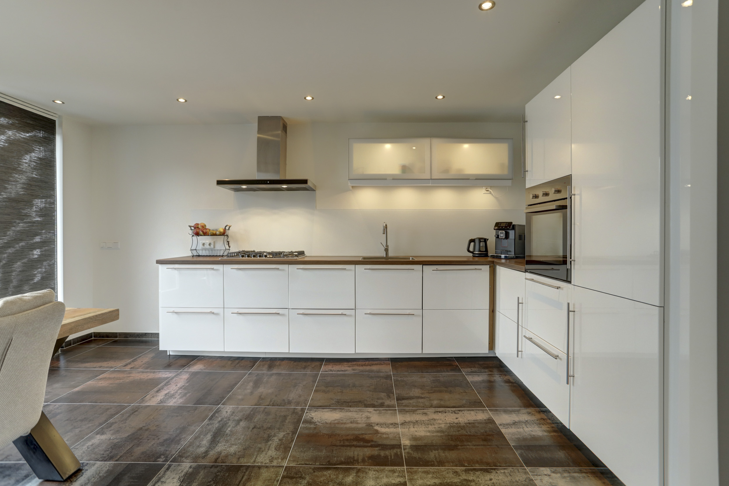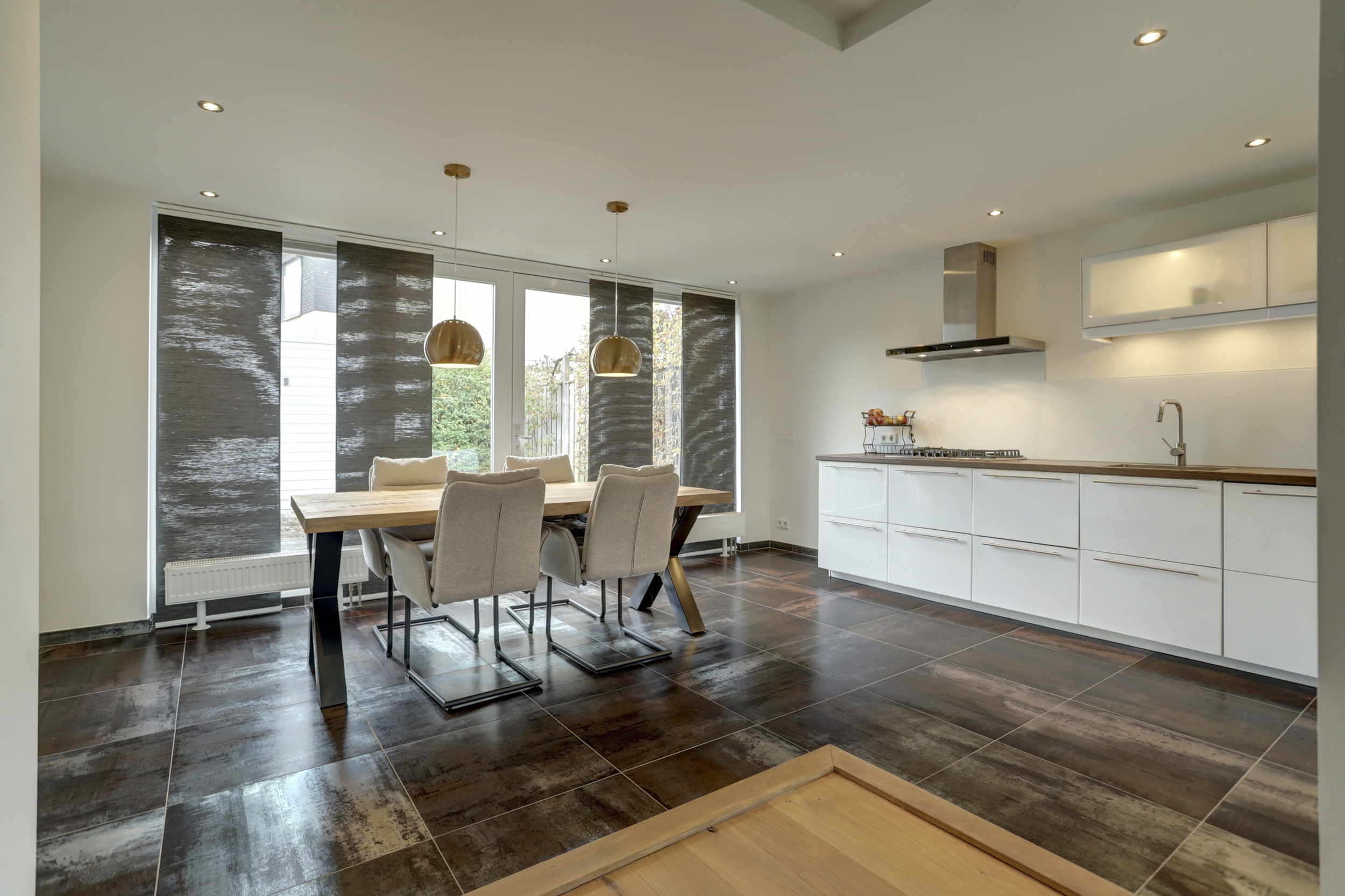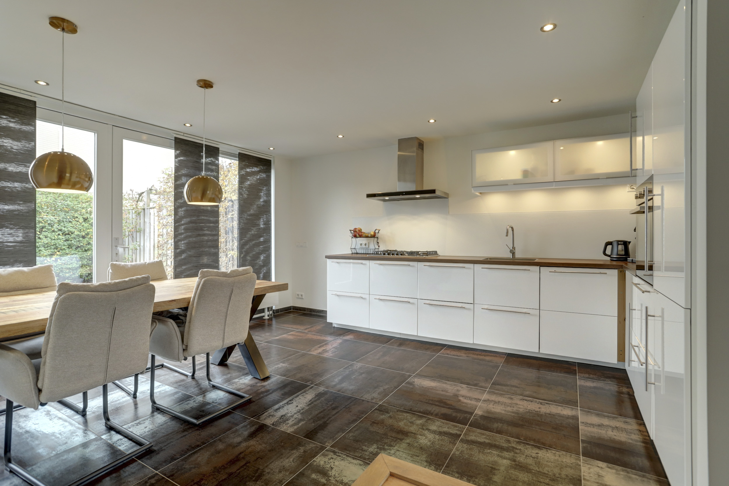 Ruime leefkeuken (’18) in de uitbouw met inbouw lichtsport en diverse inbouwapparatuur; 5-pits gaskomfoor, afzuigkap, spoelbak, vaatwasser, combi-oven, koelkast en vriezer. De keuken is voorzien van tegelvloer met vloerverwarming en openslaande deuren naar de tuin.
