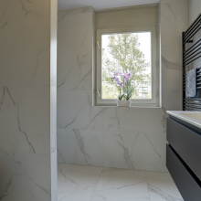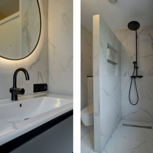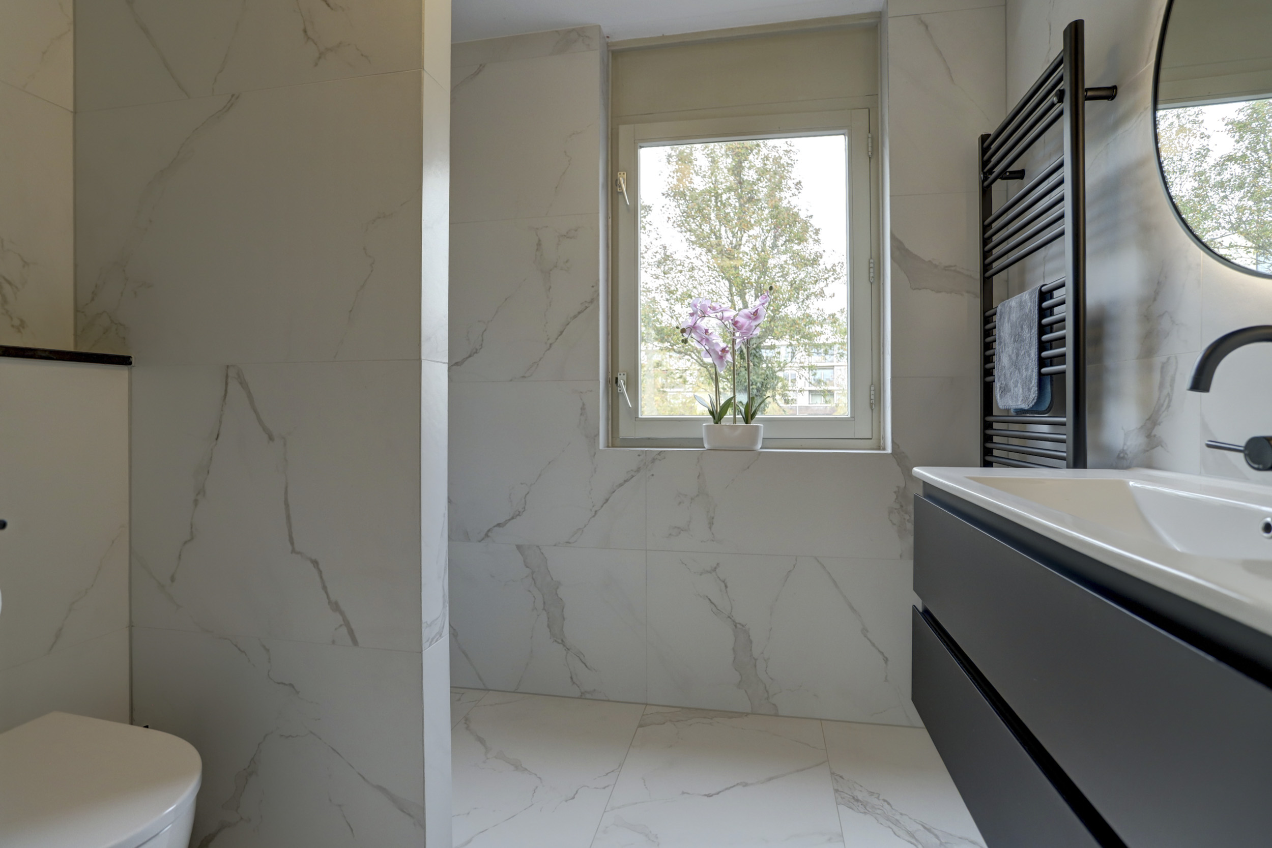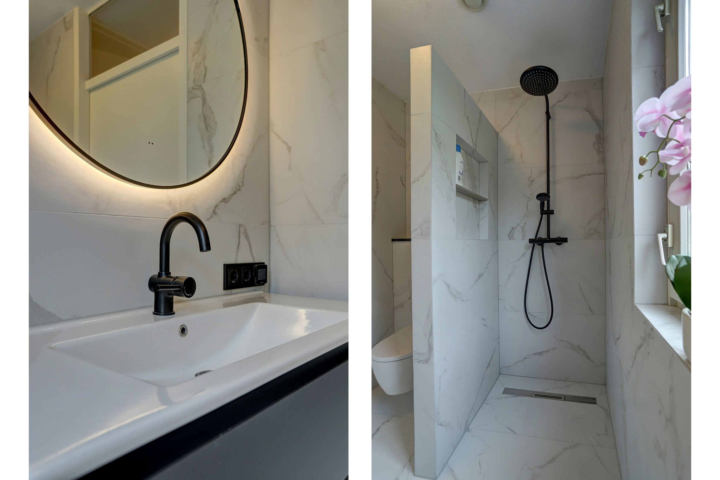 Overloop, 2 slaapkamers voorzien van laminaatvloer (ca. 19 en 11 m²) en nieuwe design badkamer (’24) met inloopdouche, wastafel met ombouw, spiegel, toilet en elektrische vloerverwarming.