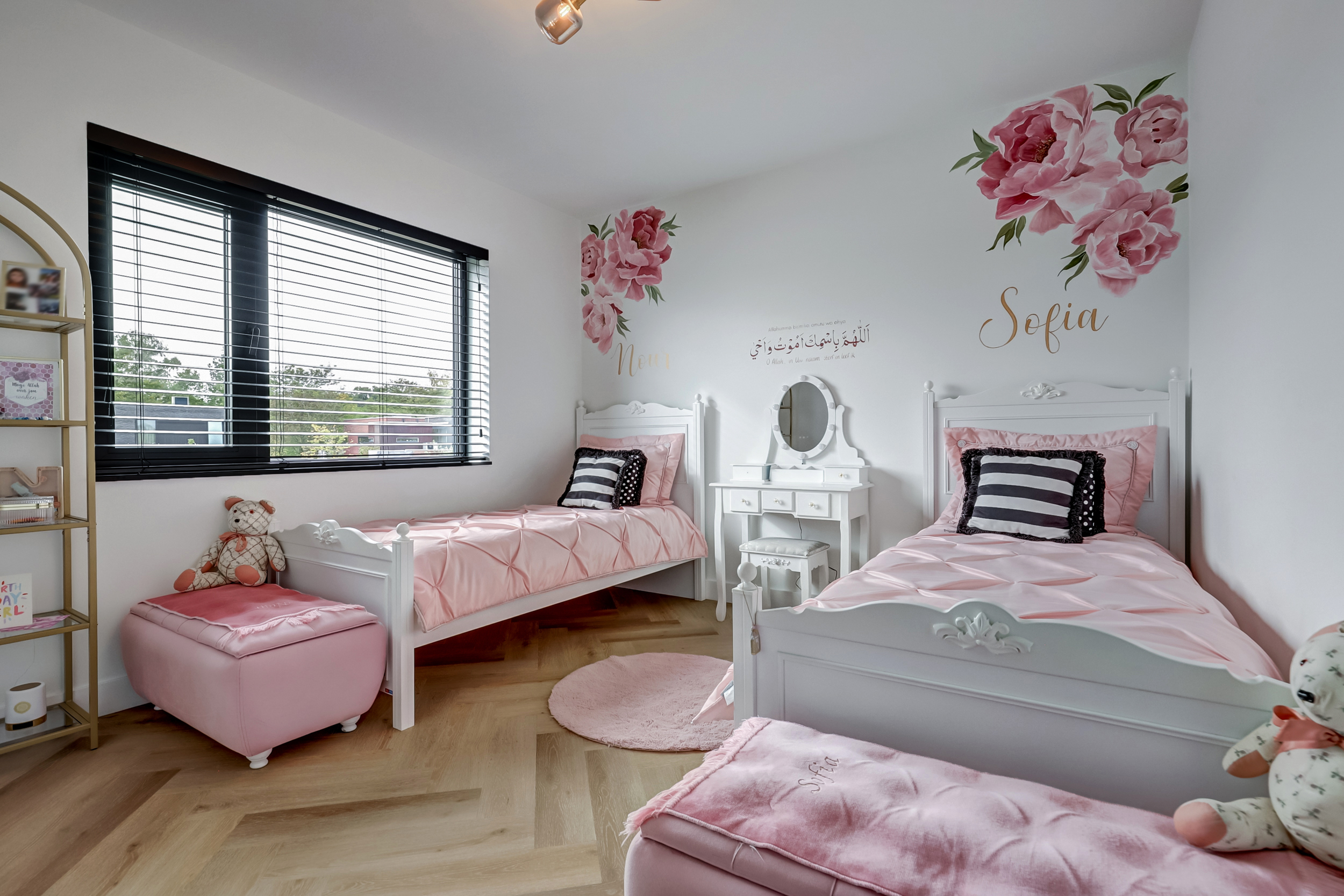 Via de mooie trappartij met op maat gemaakte trap kom je op de overloop van de eerste verdieping. Op deze verdieping vind je de royale masterbedroom met inloopkast en eigen badkamer voorzien van inloopdouche, wastafel met meubel en toilet. De overige 3 slaapkamers zijn eveneens ruim. Er is een 2e familie badkamer met inloopdouche, vrijstaand ligbad, dubbele wastafel met meubel, toilet en bidet. Er is een aparte waskamer aanwezig en er is een grote inloopkast via de overloop bereikbaar.