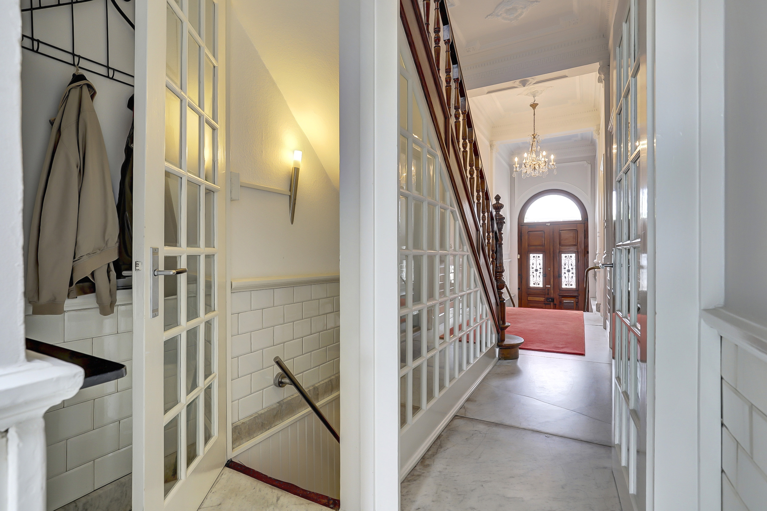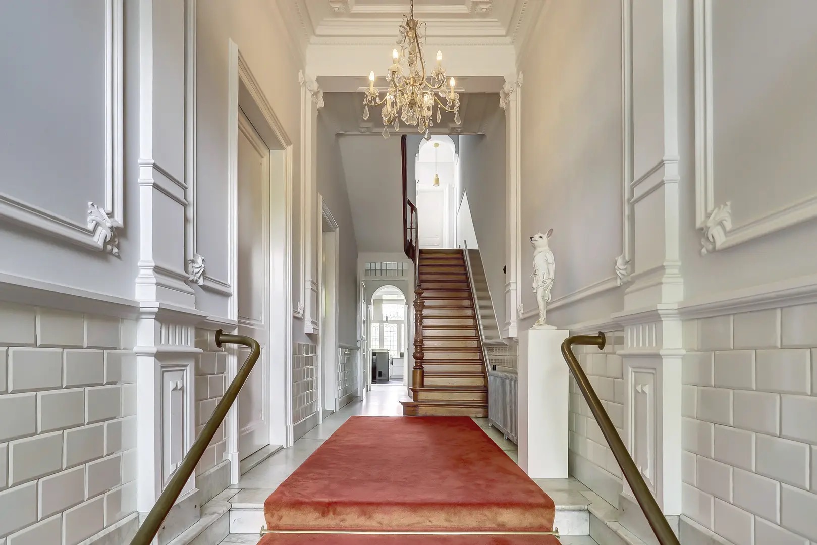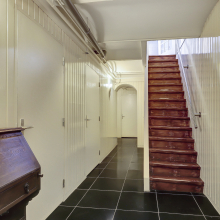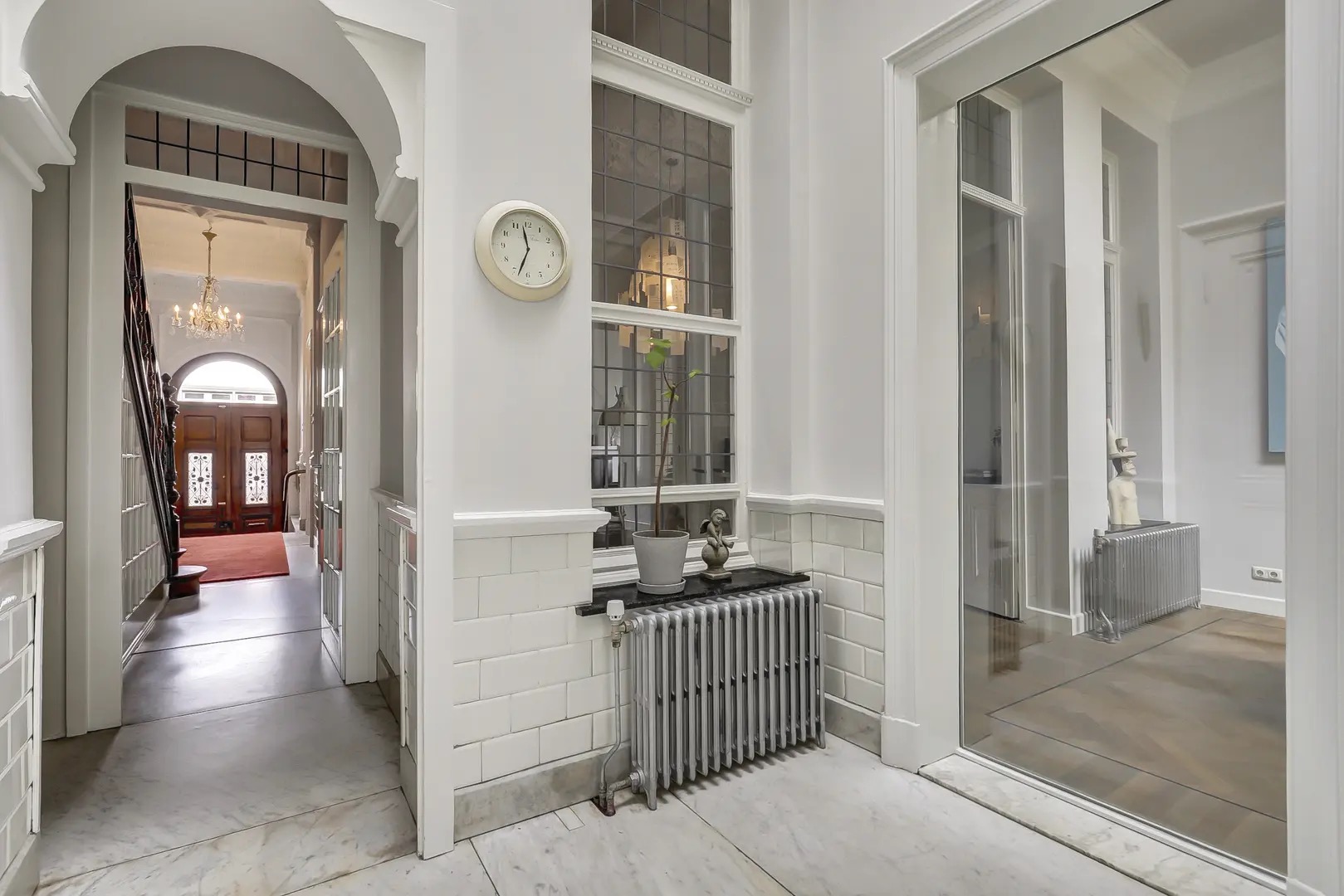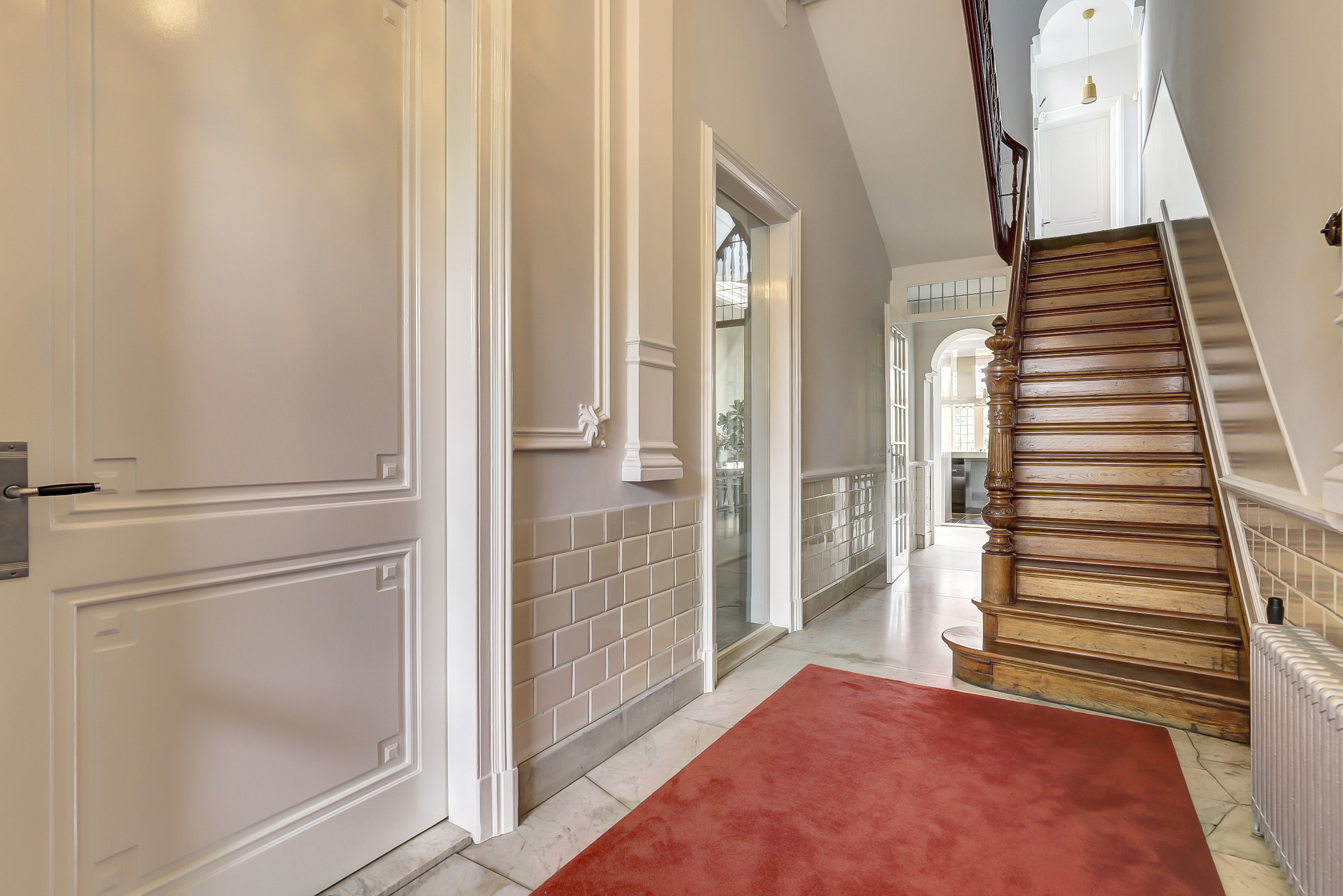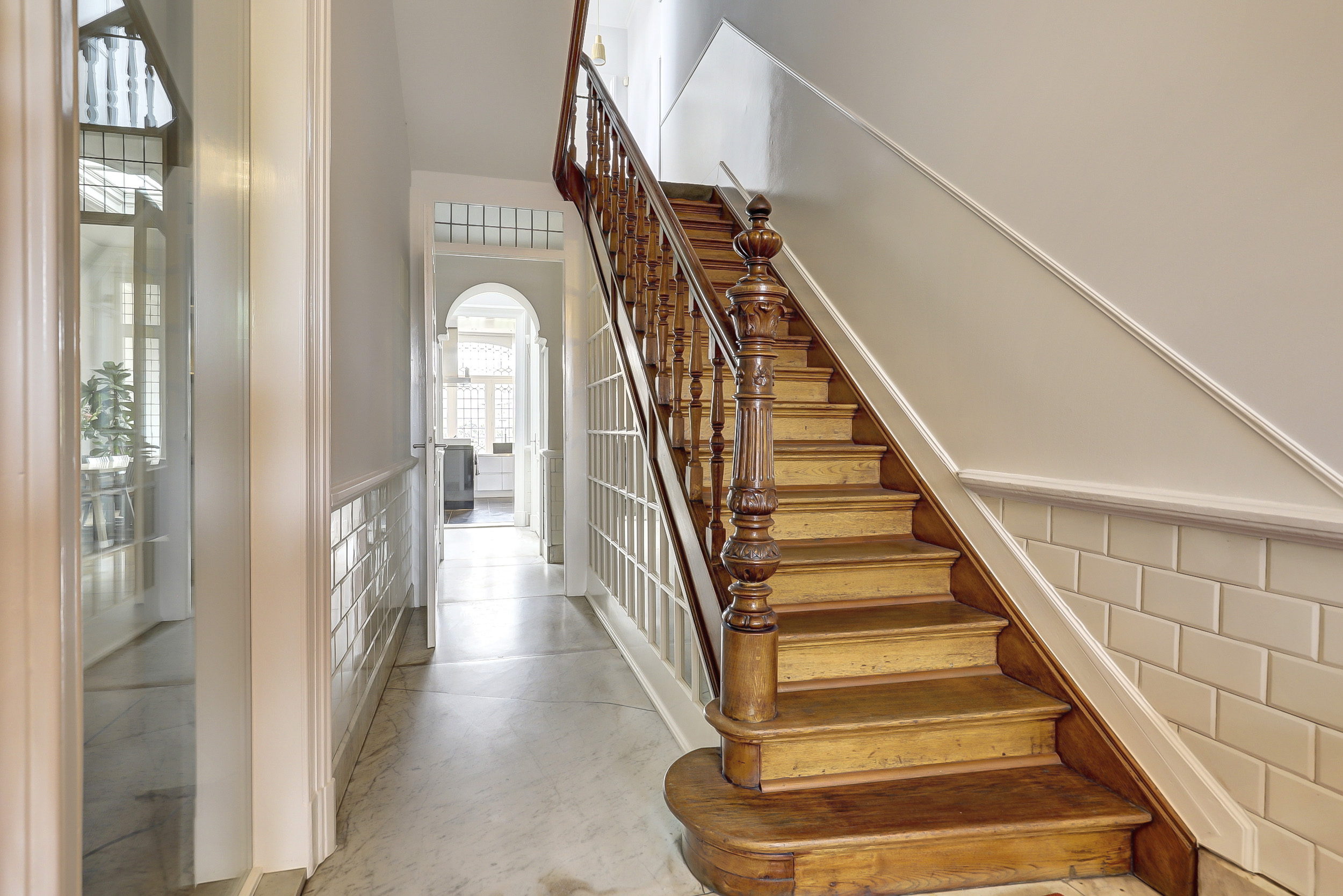 Entree met massief houten dubbele deur en bovenlicht, centrale hal met marmeren vloer en originele stucwerk ornamenten, origineel trappenhuis met rijk geornamenteerd baluster. Deze hal ademt authenticiteit en neemt je mee naar eind 19e eeuw!