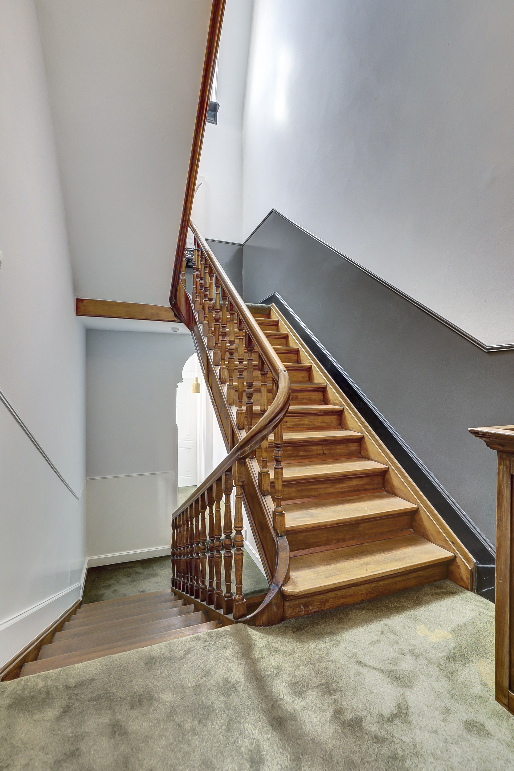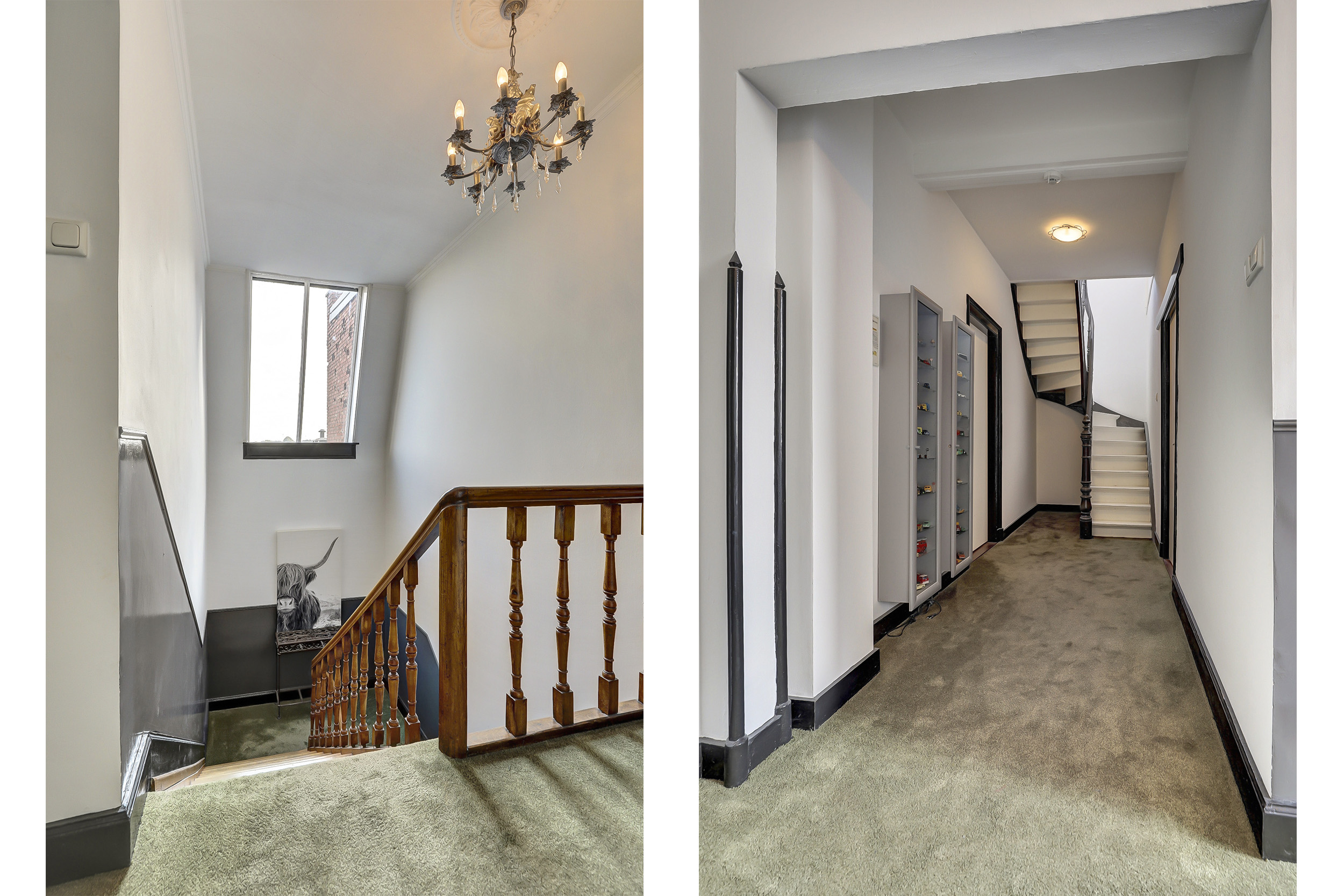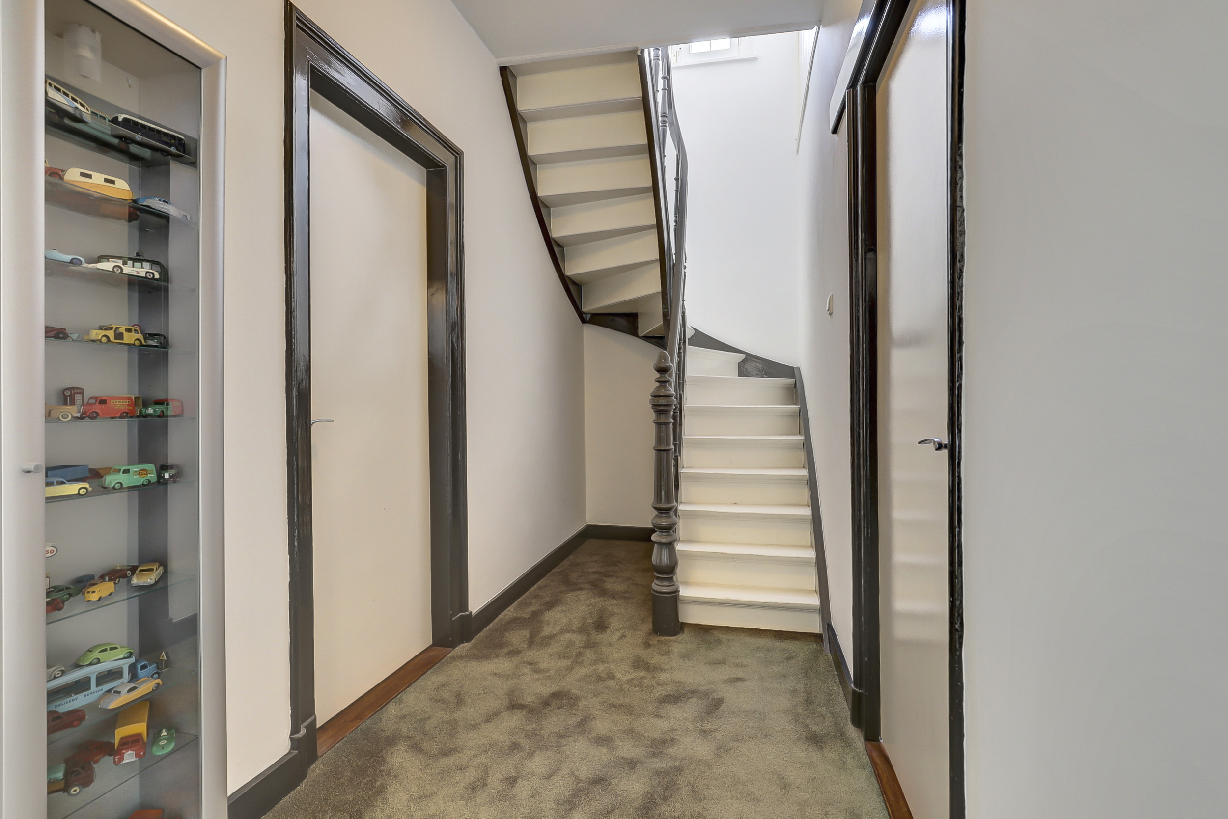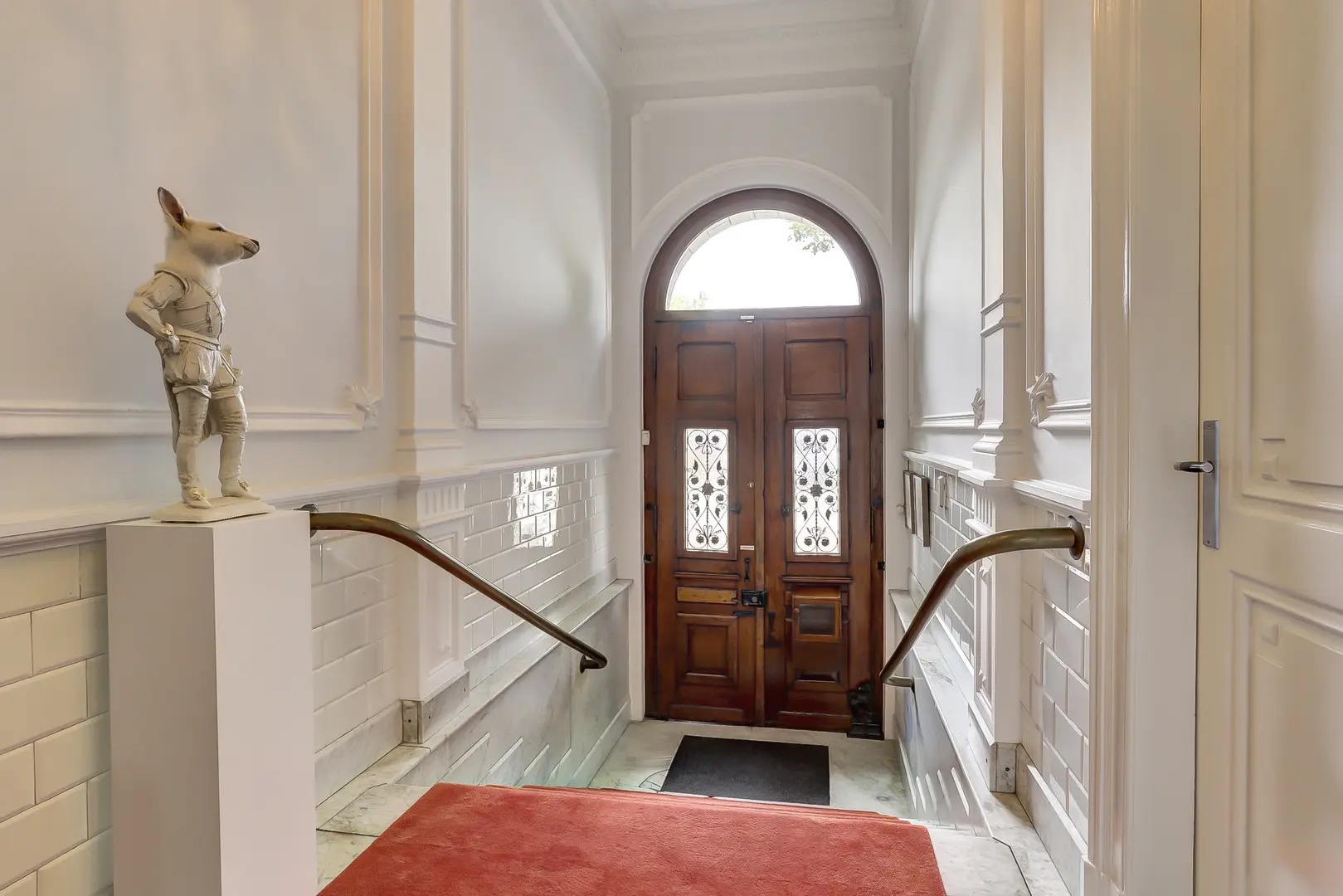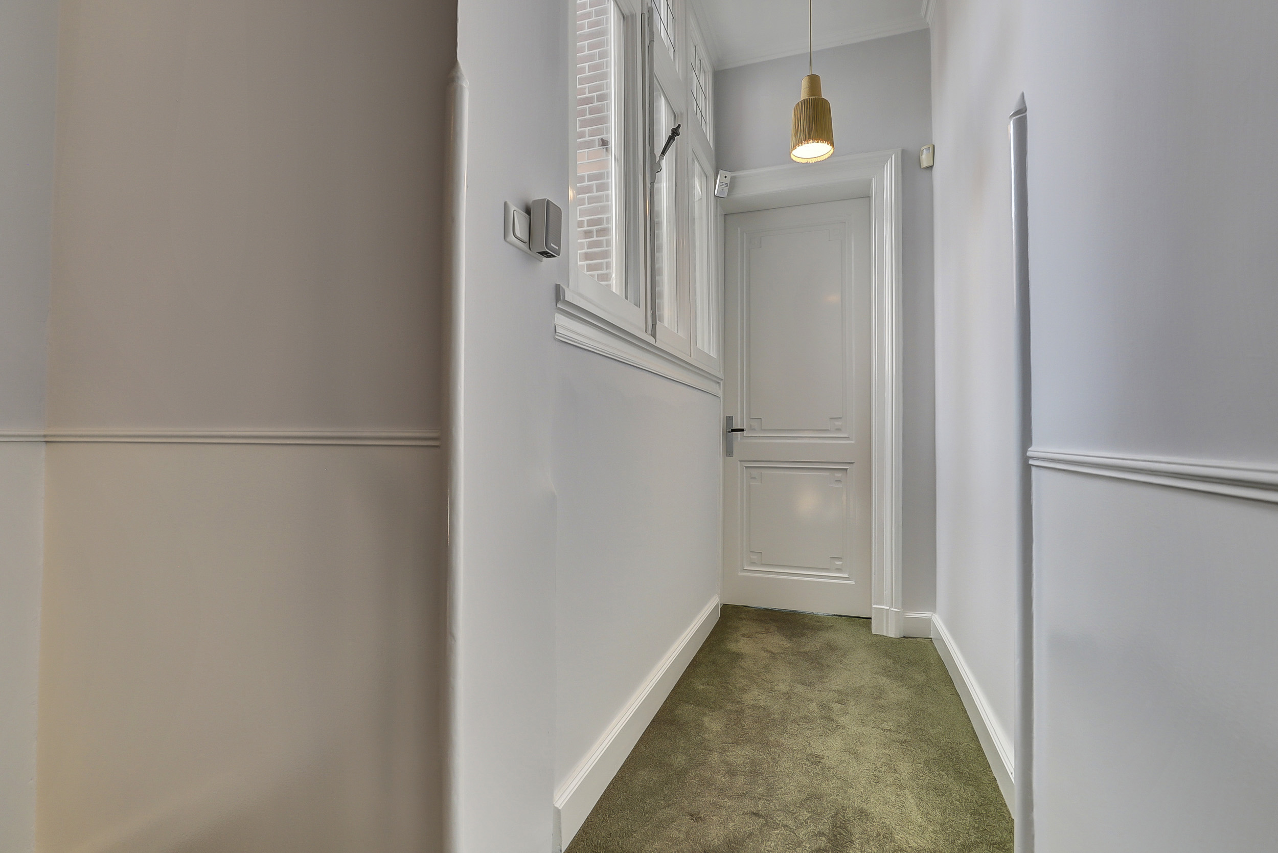 Entree met massief houten dubbele deur en bovenlicht, centrale hal met marmeren vloer en originele stucwerk ornamenten, origineel trappenhuis met rijk geornamenteerd baluster. Deze hal ademt authenticiteit en neemt je mee naar eind 19e eeuw!