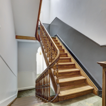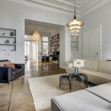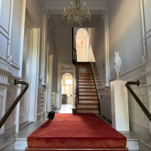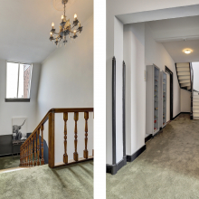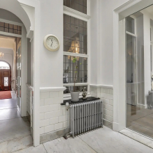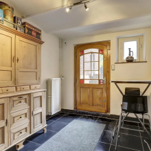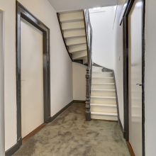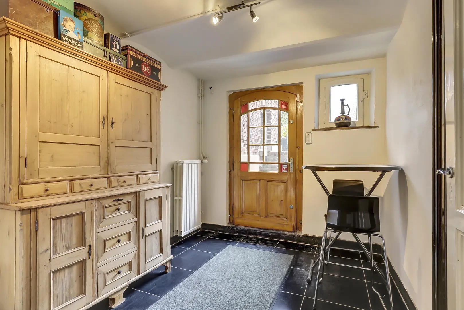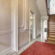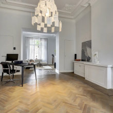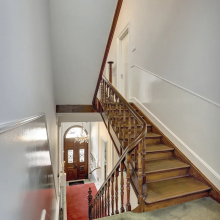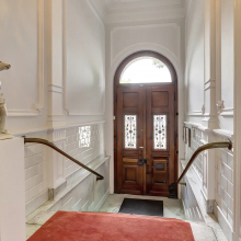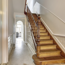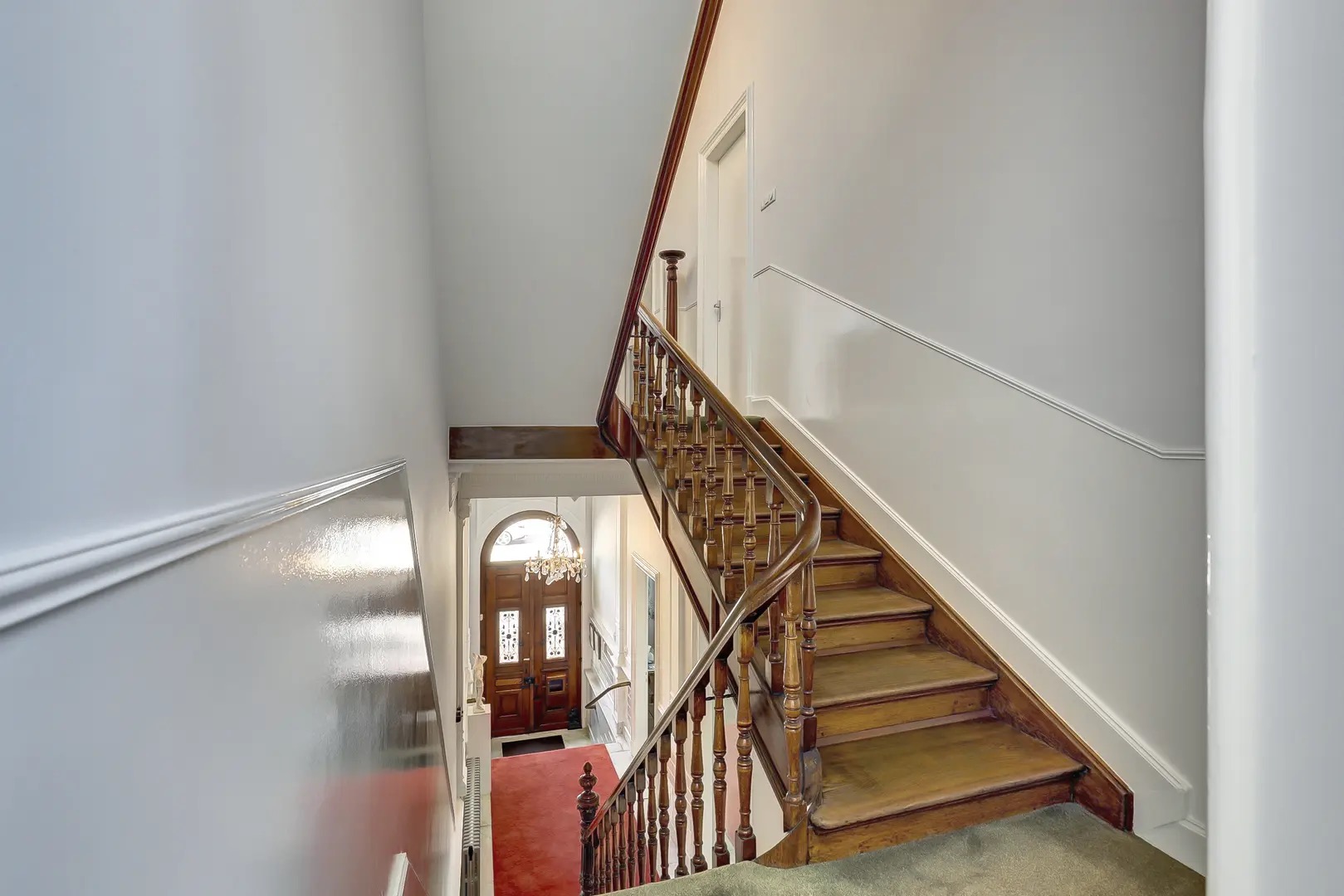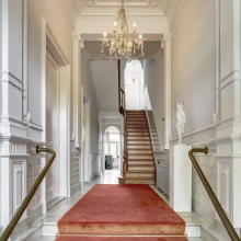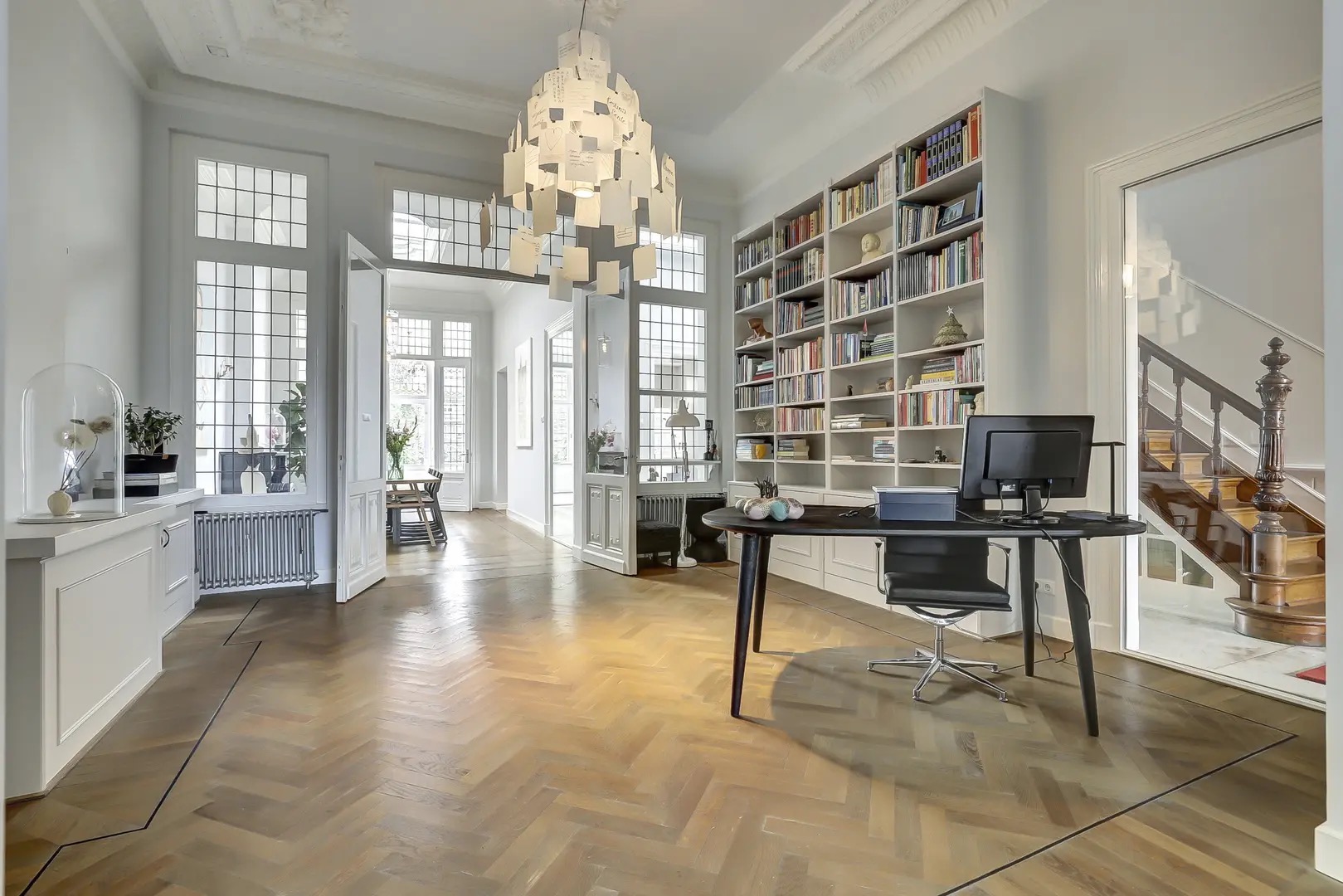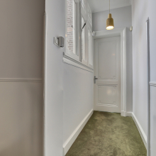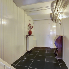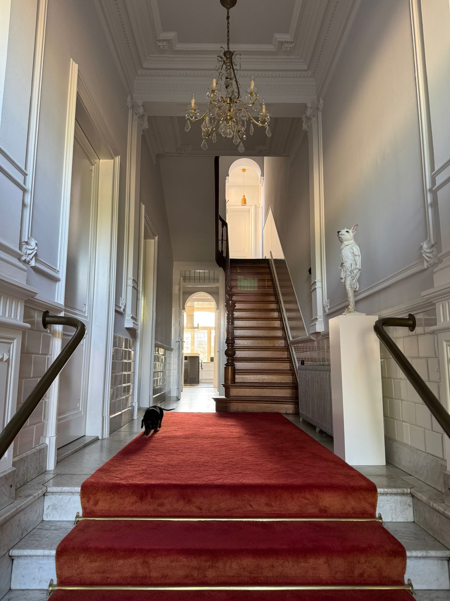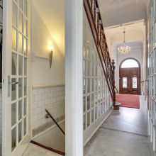 Entree met massief houten dubbele deur en bovenlicht, centrale hal met marmeren vloer en originele stucwerk ornamenten, origineel trappenhuis met rijk geornamenteerd baluster. Deze hal ademt authenticiteit en neemt je mee naar eind 19e eeuw!
