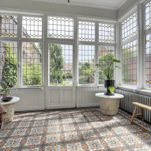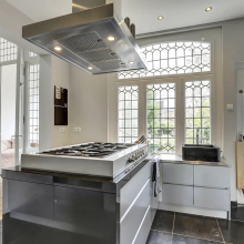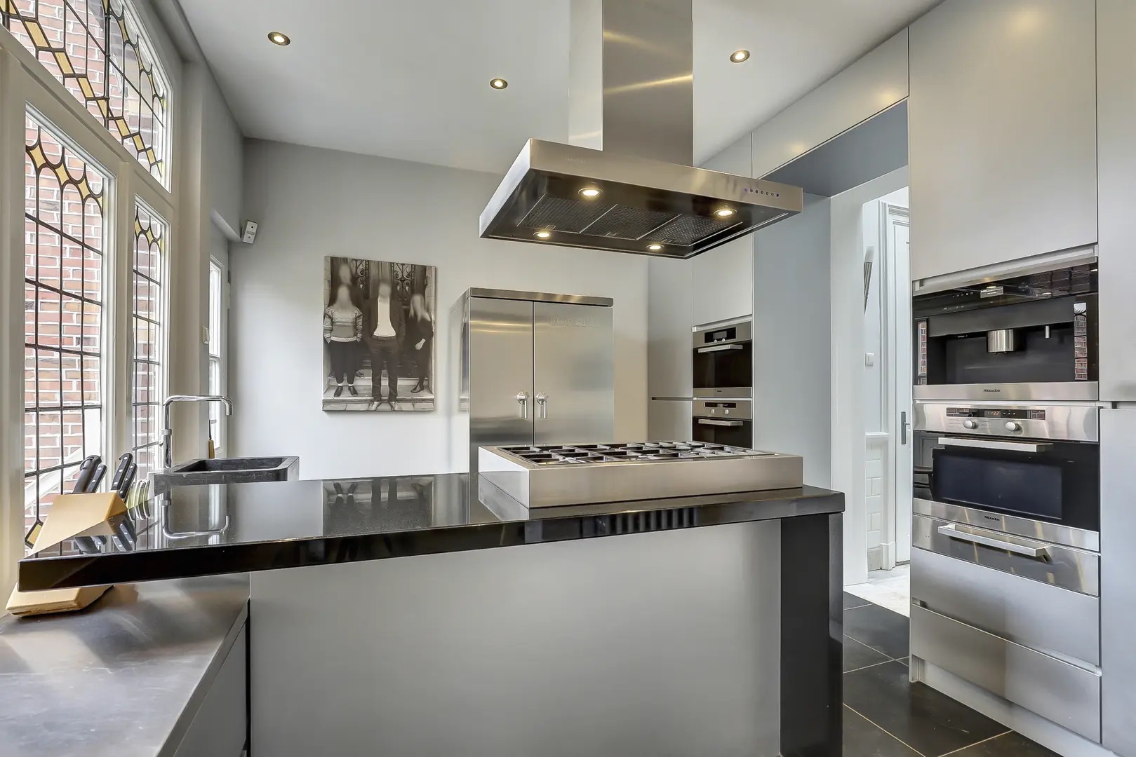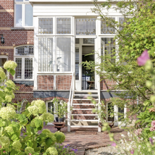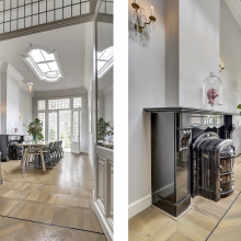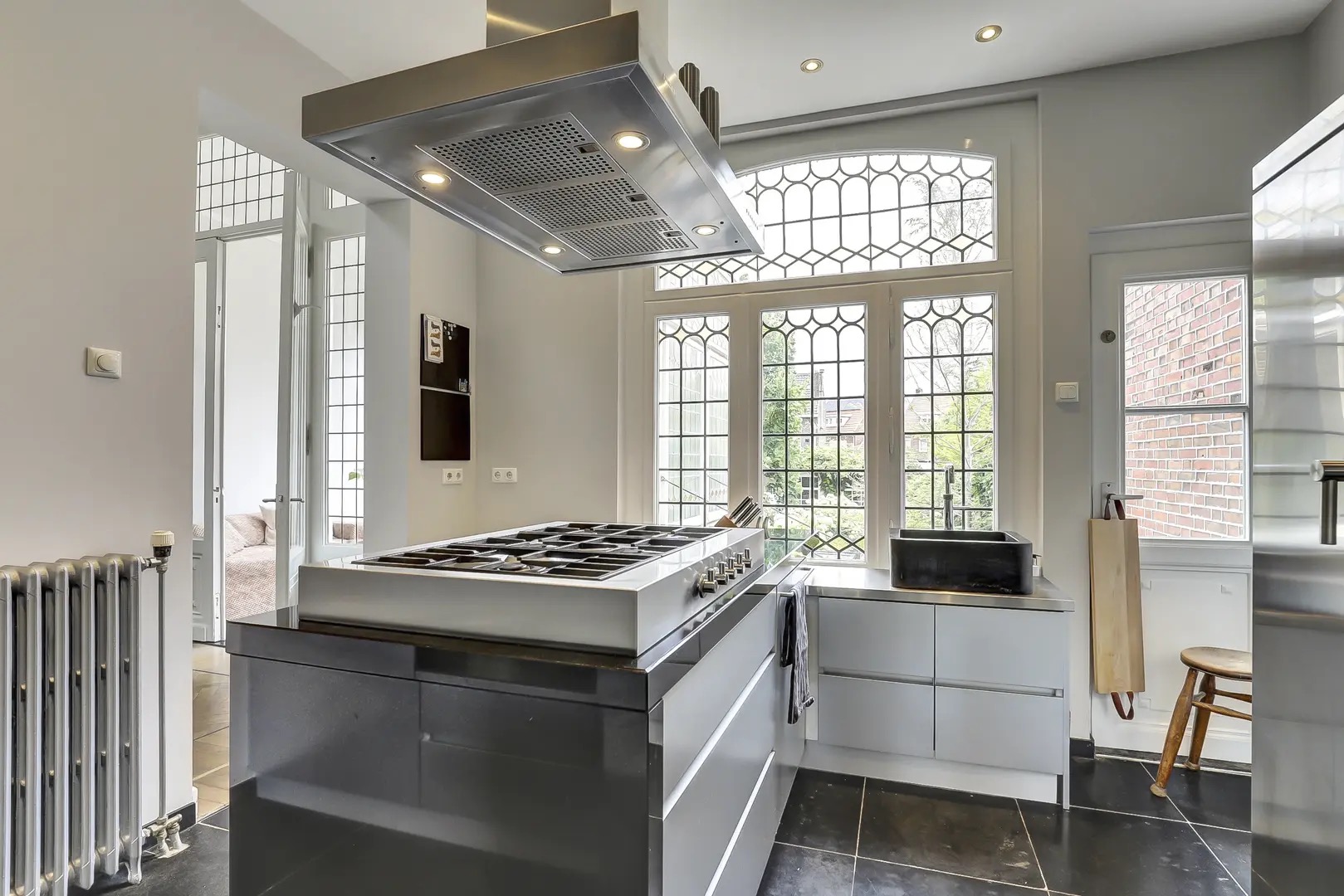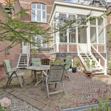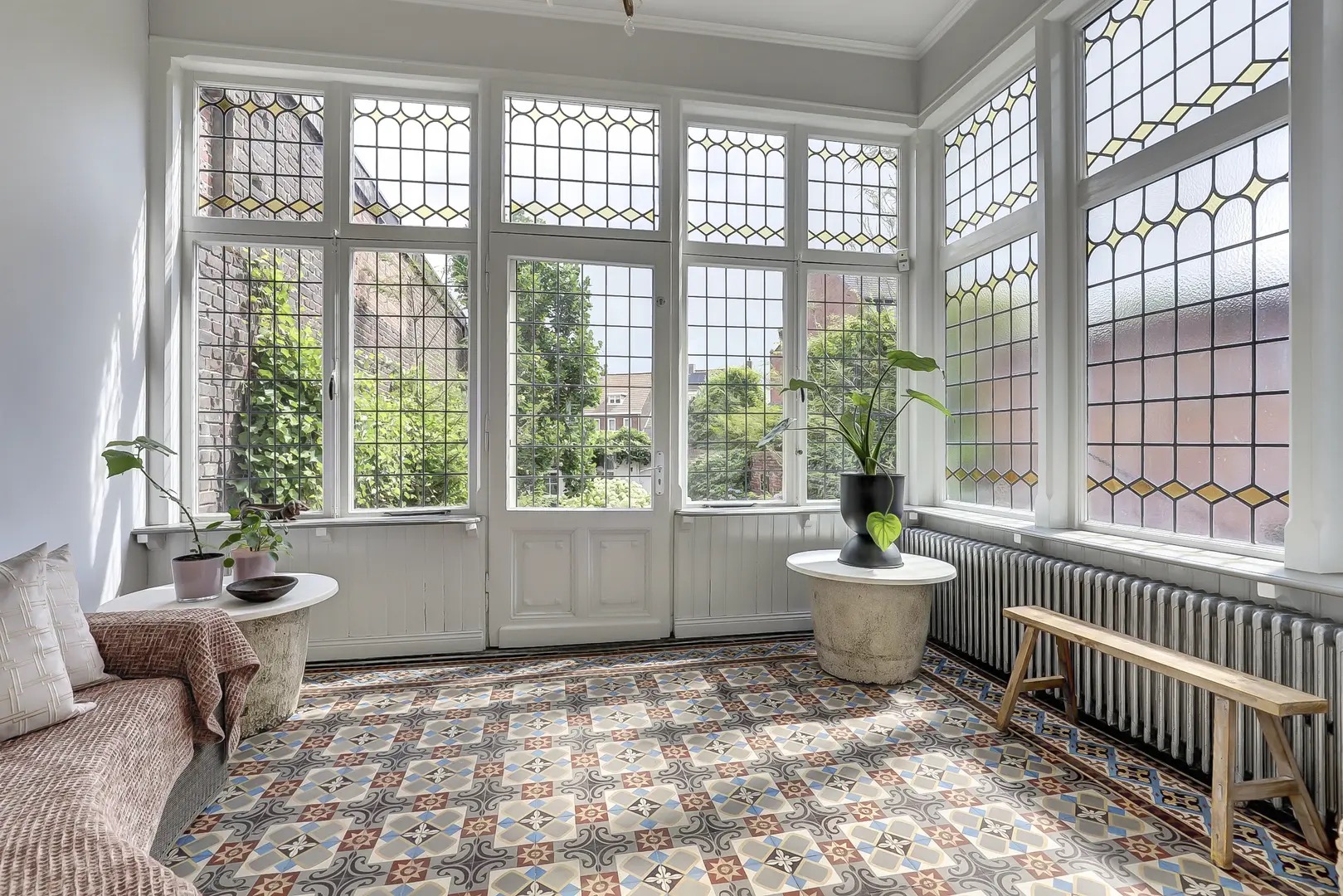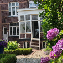 Riante woonkamer verdeeld in 3 ruimtes; zitkamer, leeskamer een eetkamer voorzien van eikenhouten vloer in visgraatmotief met sierbies. Mooi lichtspel door glas-in-loodinzet en glazen wanden in ‘oude’ deuropeningen naar de hal. De lichte eetkamer is voorzien van lichtkoepel, authentieke kachel en natuurstenen schouw. De keuken staat in verbinding met de eetkamer. Hoogwaardige keuken met schiereiland en alle aanwezige Miele inbouwapparatuur, waaronder 3 ovens (stoom-, oven,- en magnetron), een inbouw koffieapparaat en rechaudlade! Fijne keuken voor de (hobby)chef! Via portaal apart gastentoilet met fontein. De serre is voorzien van hoge ramen met prachtige glas-in-loodinzet en Portugese tegels. Mooie lichte ruimte met trap naar de tuin.
