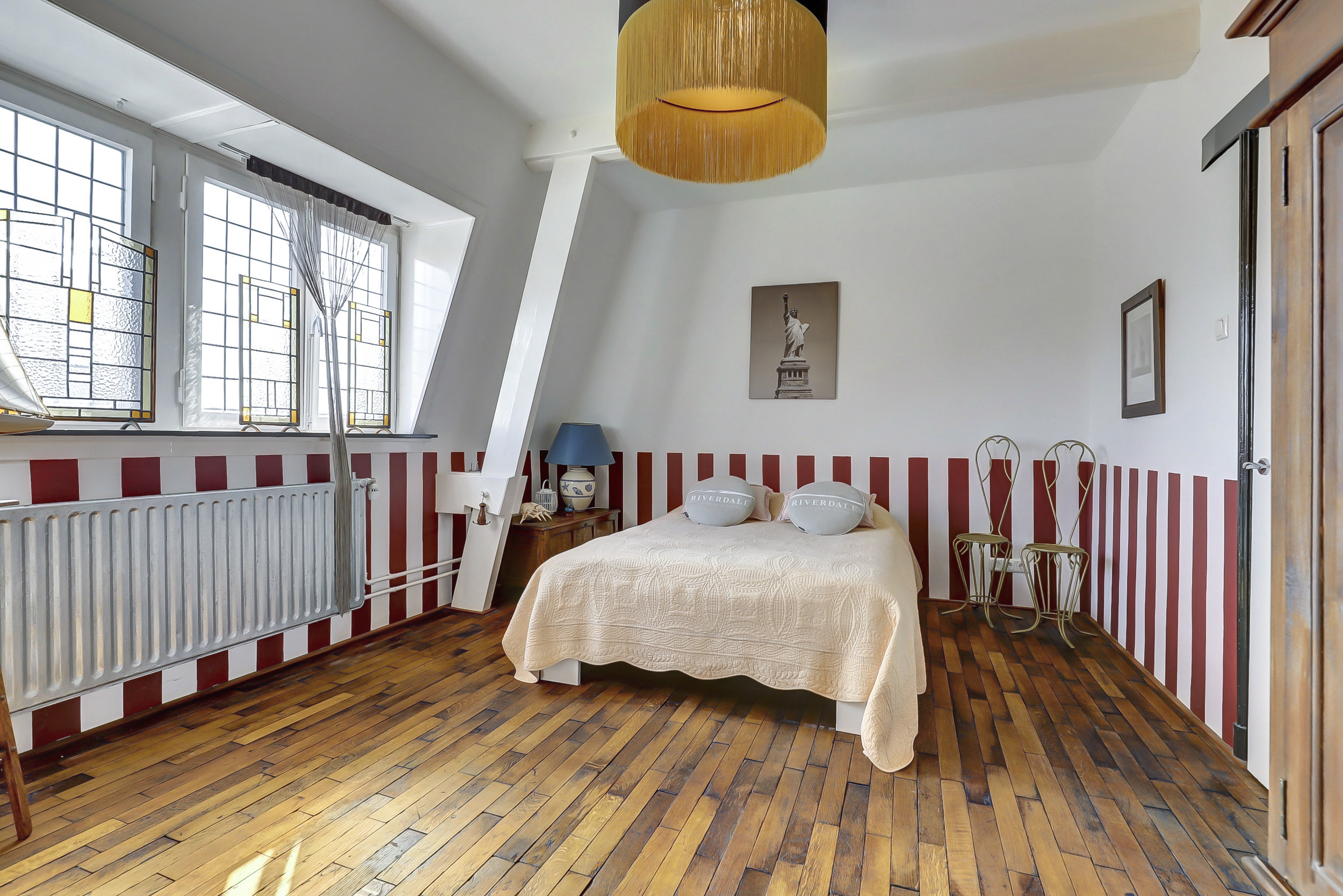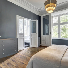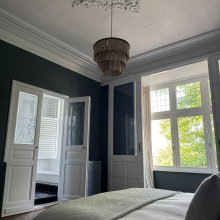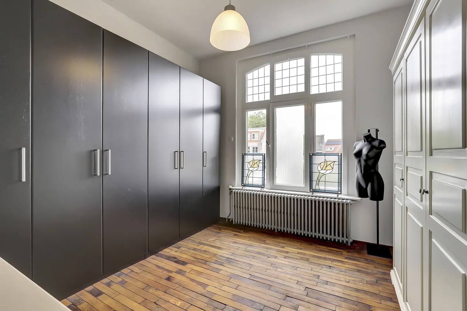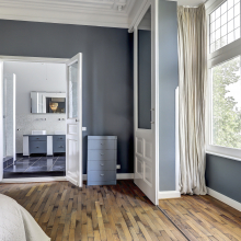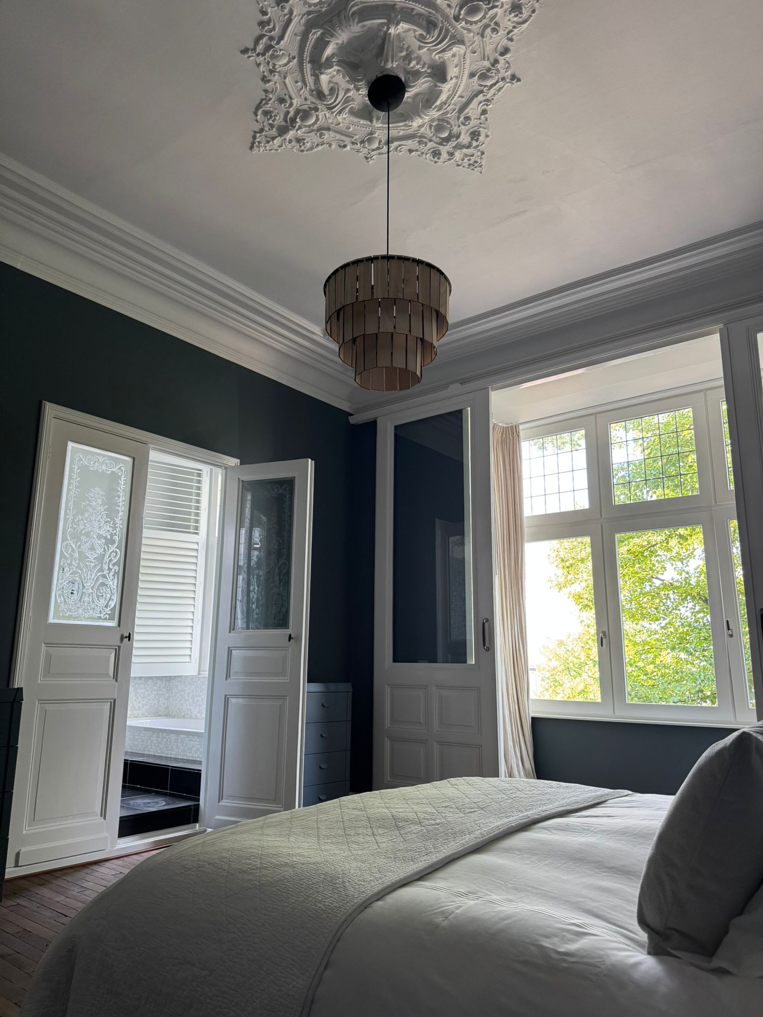 Overloop, riante masterbed room met ensuite badkamer. Slapen en baden in stijl! Statige kamer met hoge plafonds, stucwerk ornamenten en originele (gerestaureerde) erker voorzien van schuifdeuren. Airco aanwezig. De badkamer is voorzien van dubbele design wastafel met meubel, ligbad, inloopdouche en hangcloset. Wederom lichte ruimte met luiken en glas-in-lood elementen.