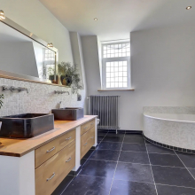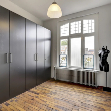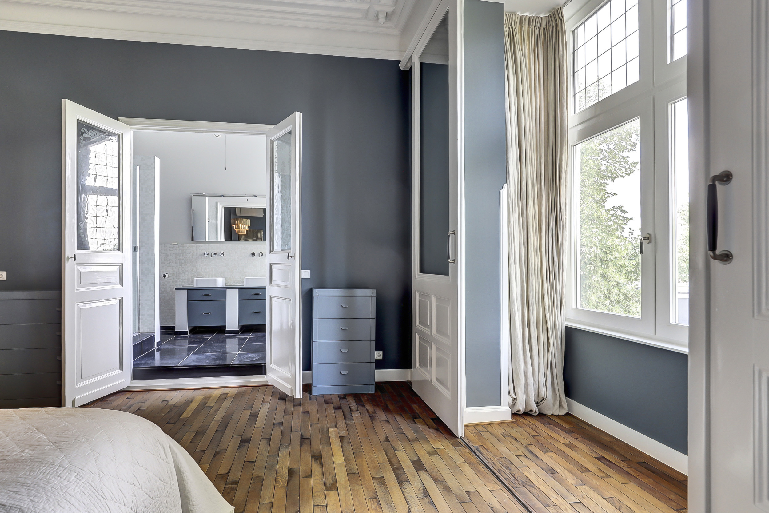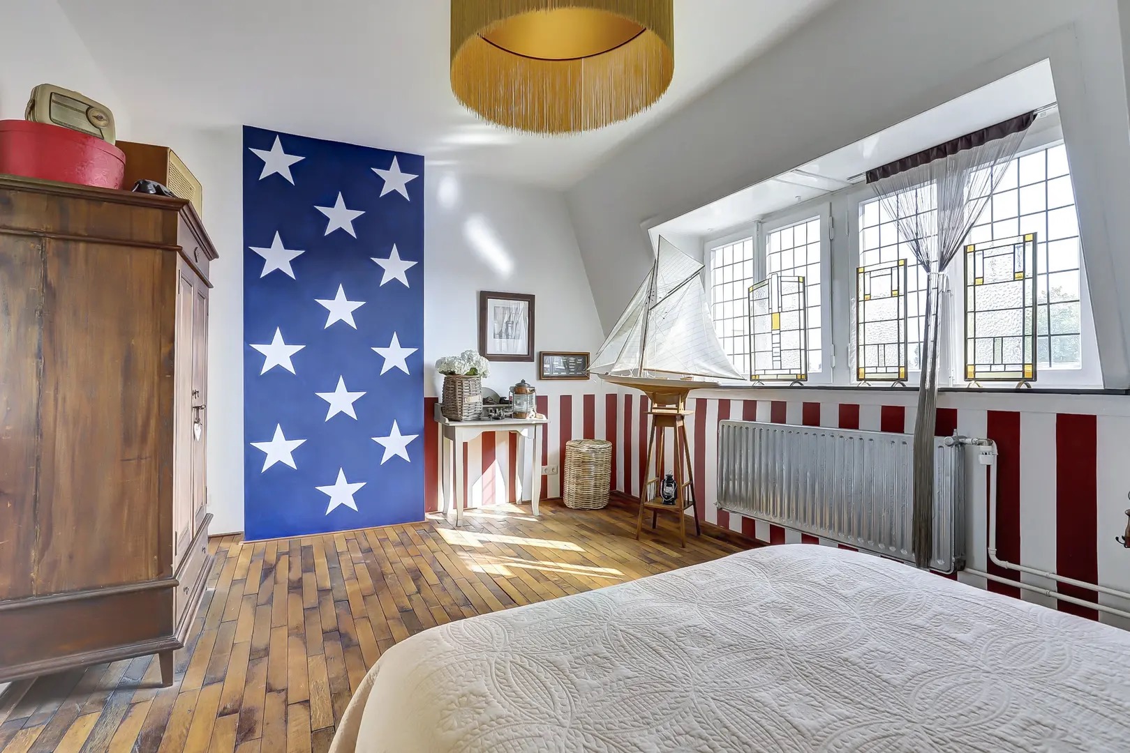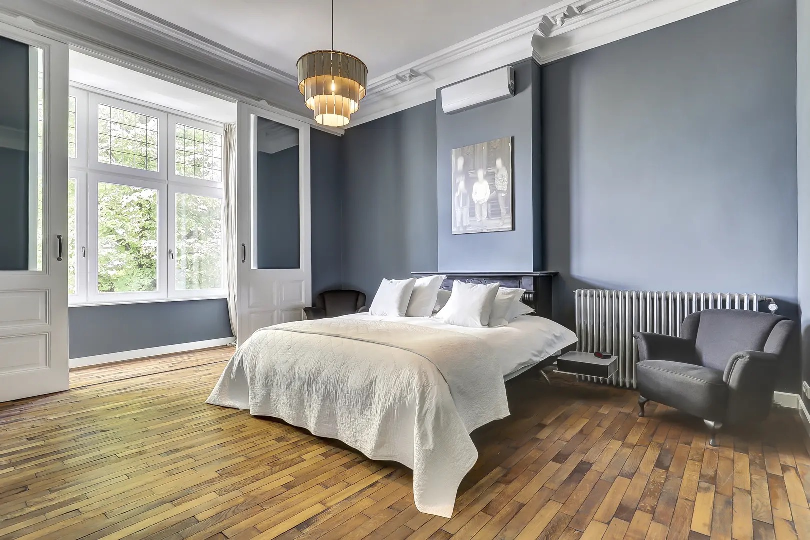 Overloop, riante masterbed room met ensuite badkamer. Slapen en baden in stijl! Statige kamer met hoge plafonds, stucwerk ornamenten en originele (gerestaureerde) erker voorzien van schuifdeuren. Airco aanwezig. De badkamer is voorzien van dubbele design wastafel met meubel, ligbad, inloopdouche en hangcloset. Wederom lichte ruimte met luiken en glas-in-lood elementen.