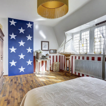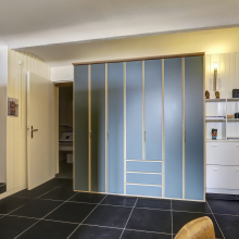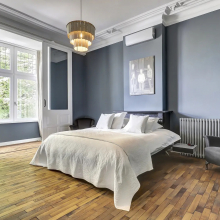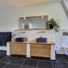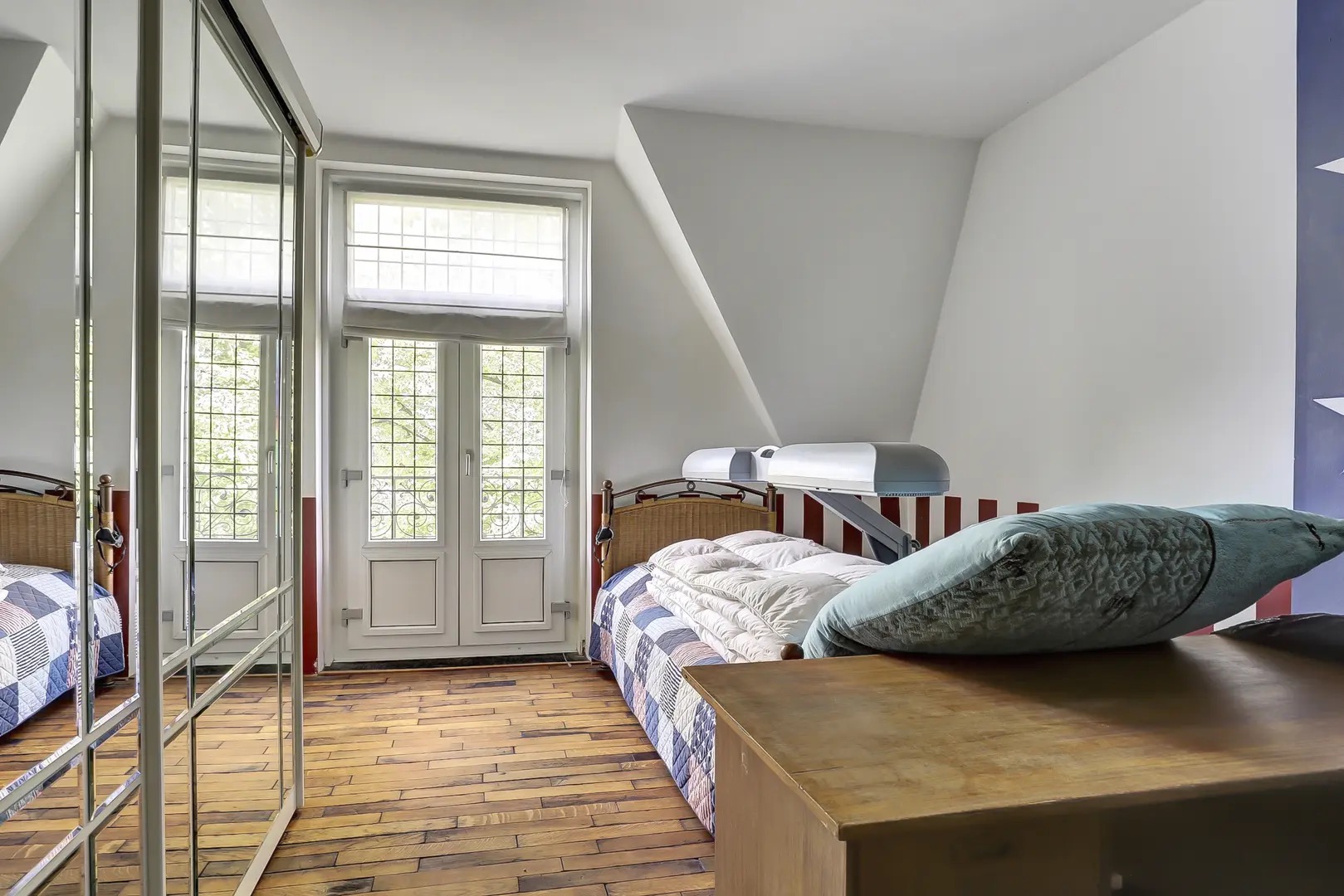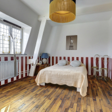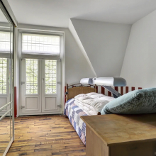 Tweede (Franse) slaapkamer met wastafel. Beide slaapkamers zijn voorzien van massief houten vloer. Middels borden te bereiken 3e slaapkamer in de uitbouw.