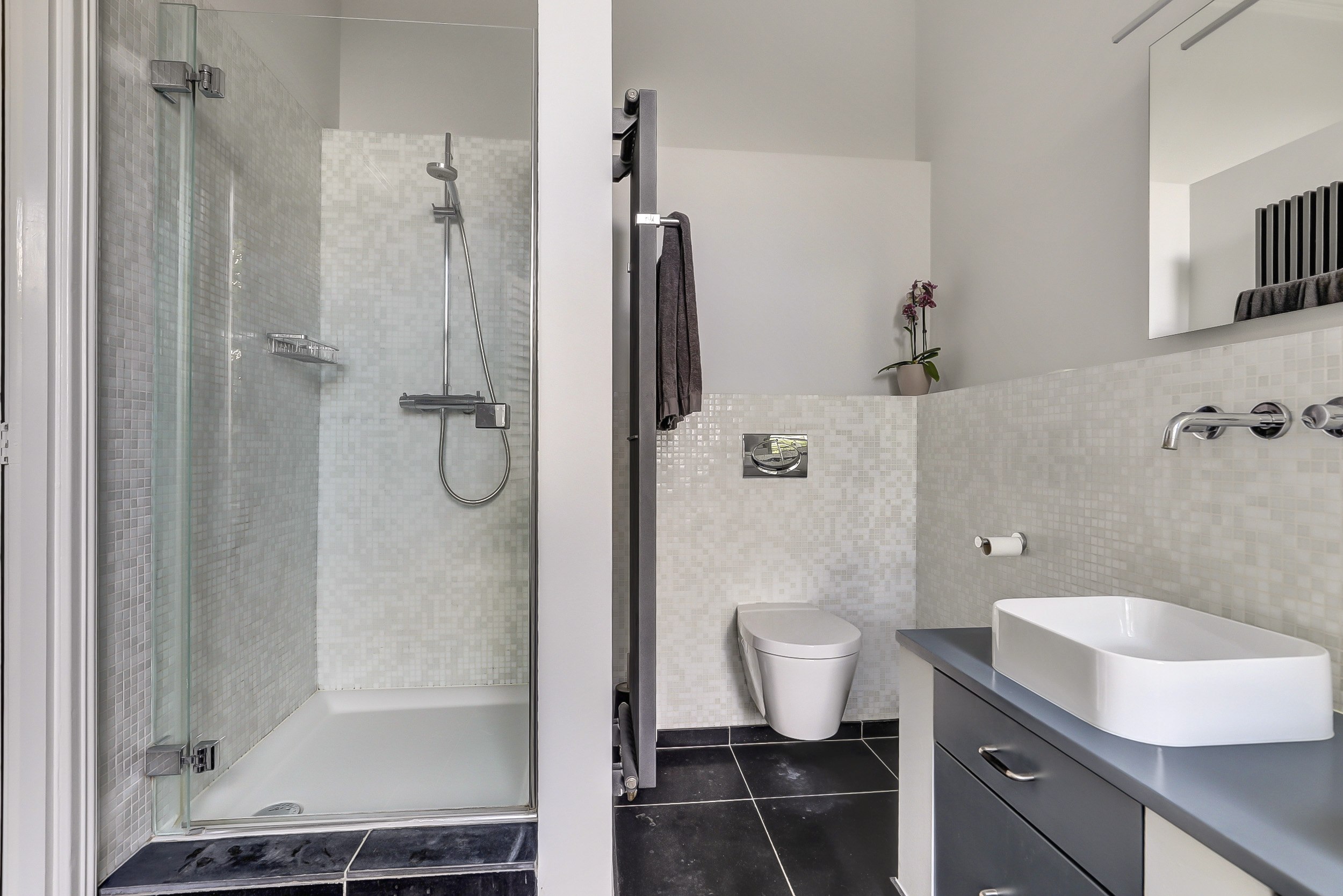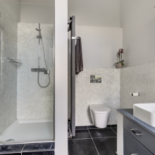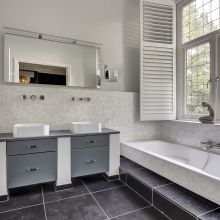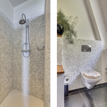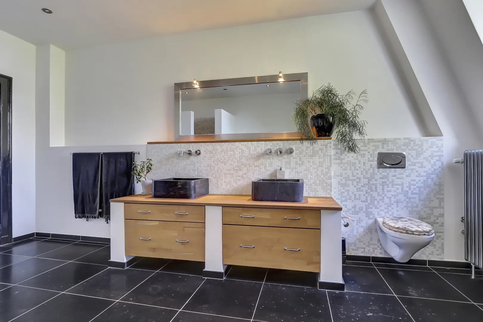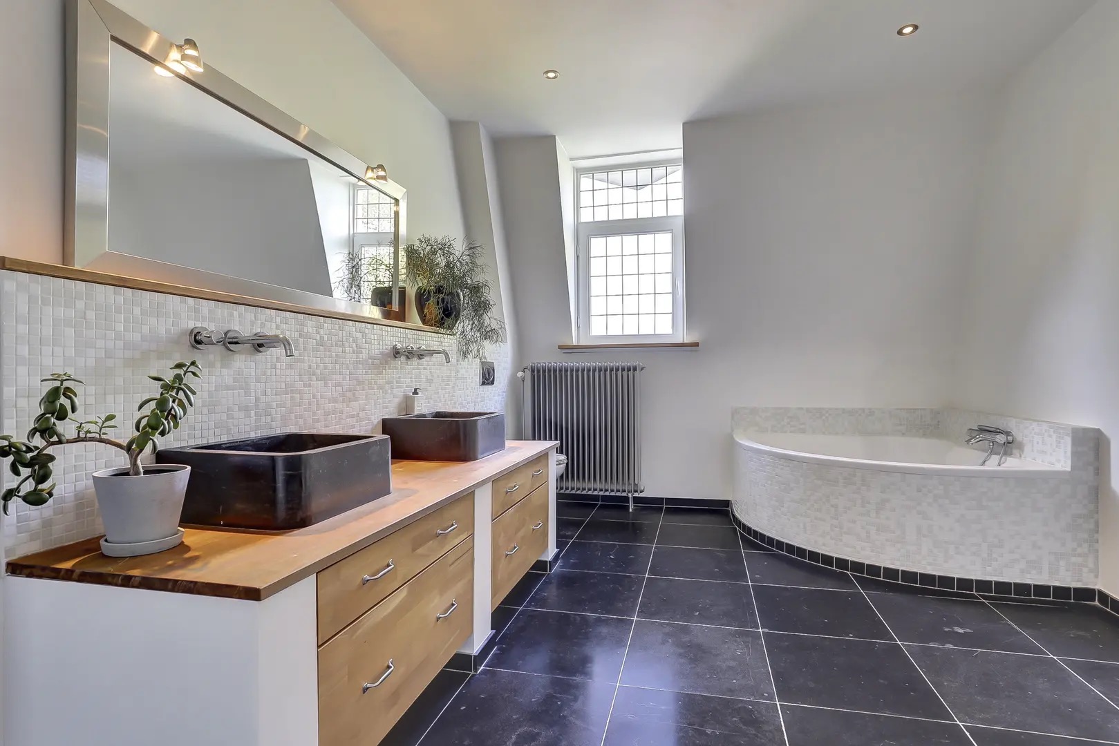 Overloop, 2 slaapkamers en ruime 2e badkamer met dubbele wastafel, inloopdouche, hoekbad en hangcloset.