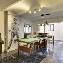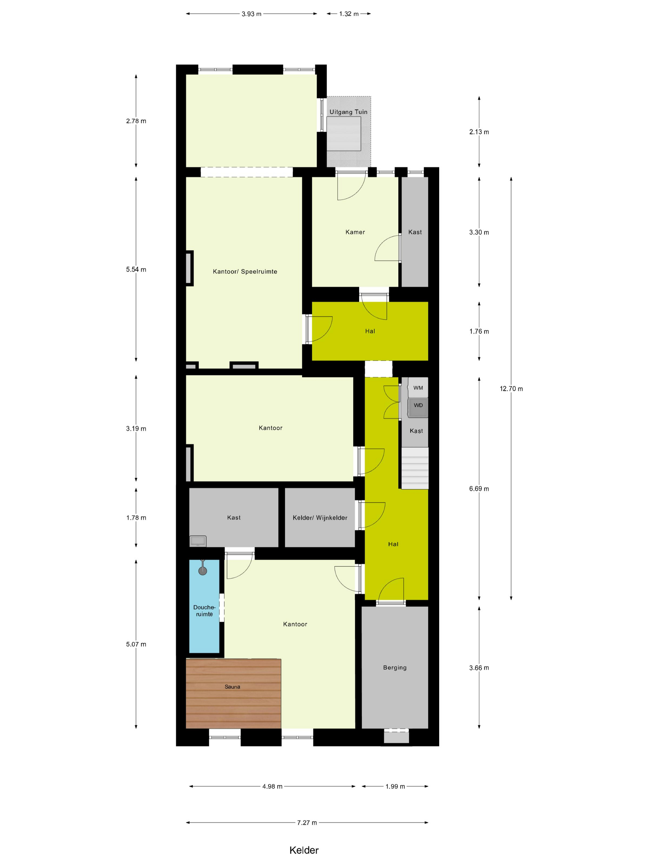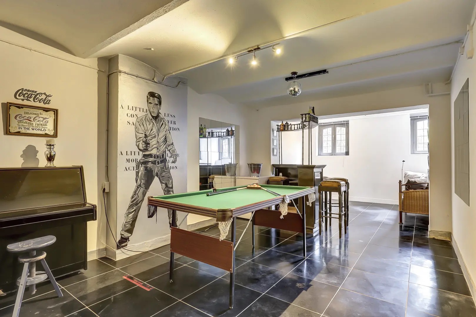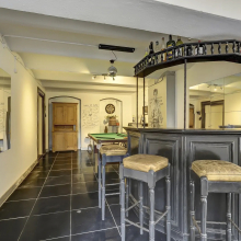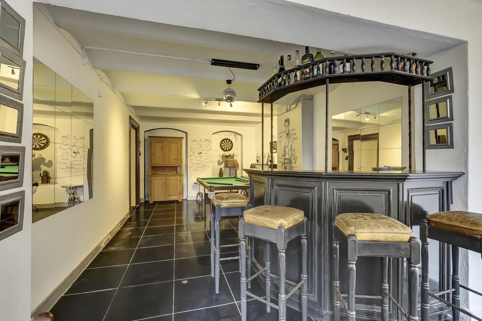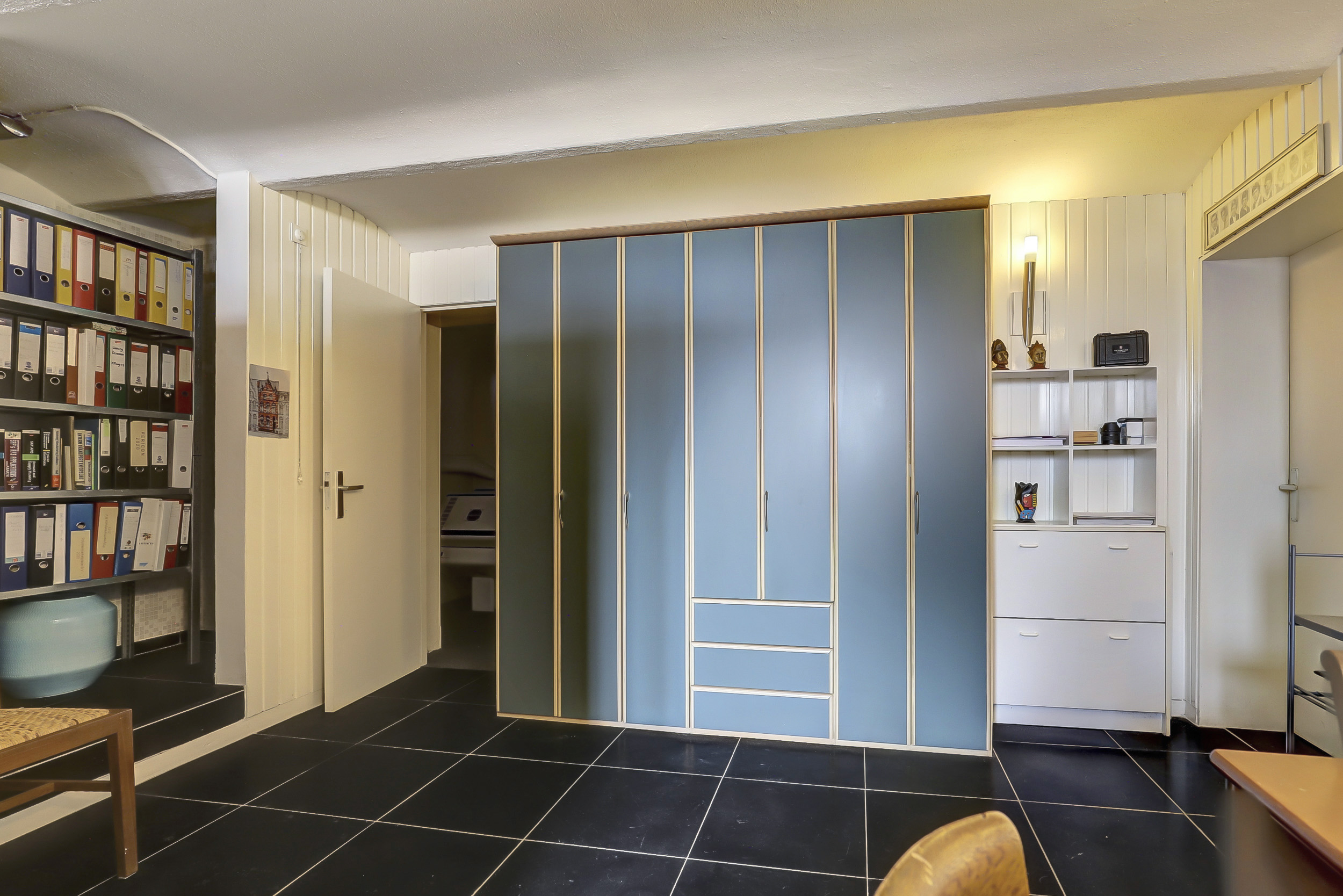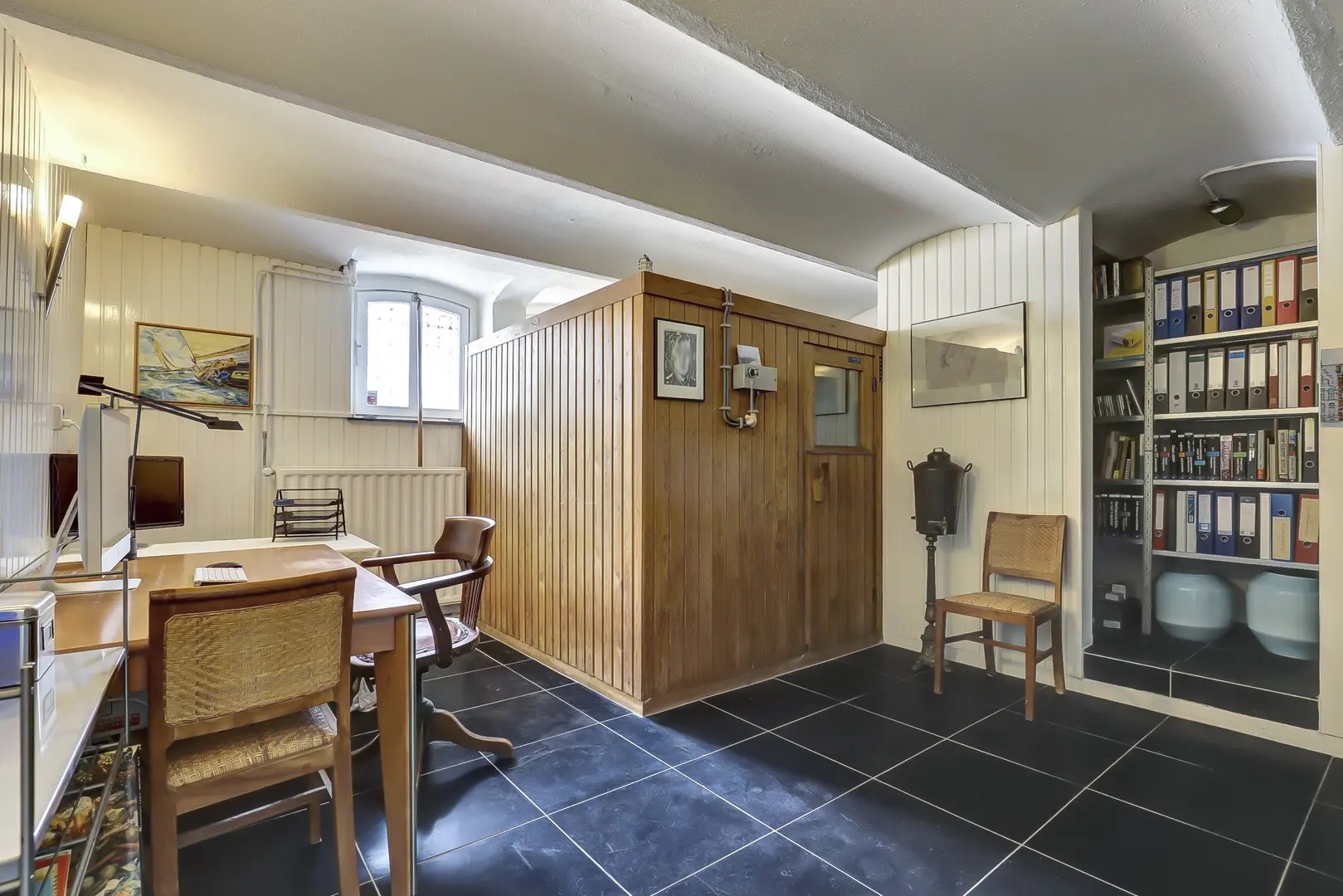 Inpandig en via tuinzijde te bereiken souterrain, hobbyruimte met bar, kantoor, bergruimte, wijnlager, en multifunctionele ruimte met sauna en zonnestudio. De gehele kelder heeft een hoog gewelfd plafond en hardstenen vloer.