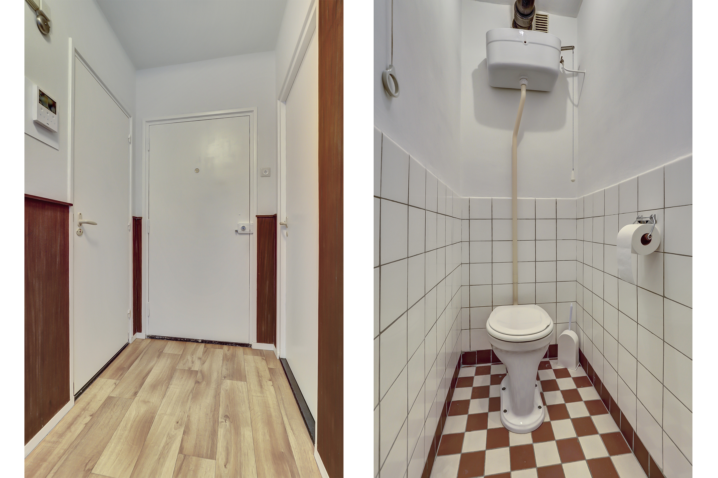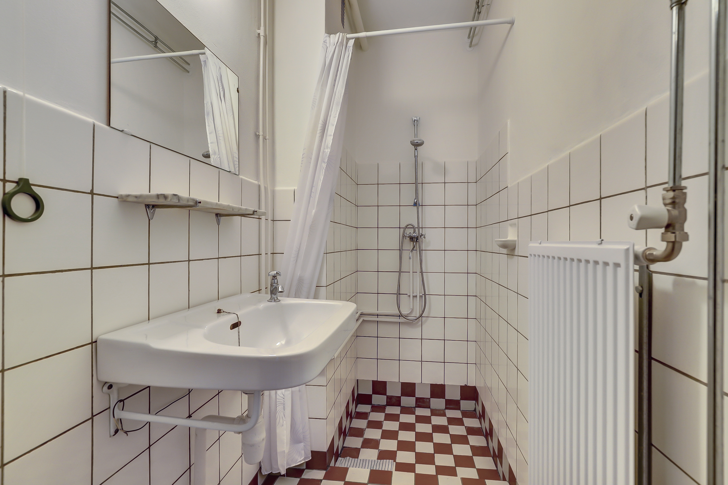 Via de hal 2 slaapkamers (13 en 10 m²), apart toilet, badkamer met douche en wastafel met authentieke tegels.