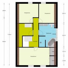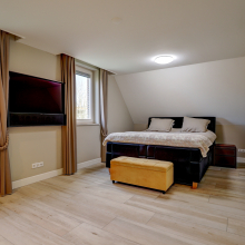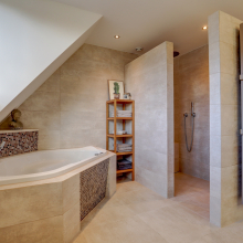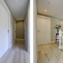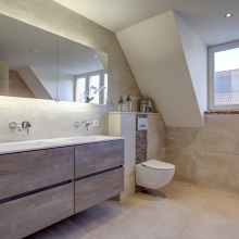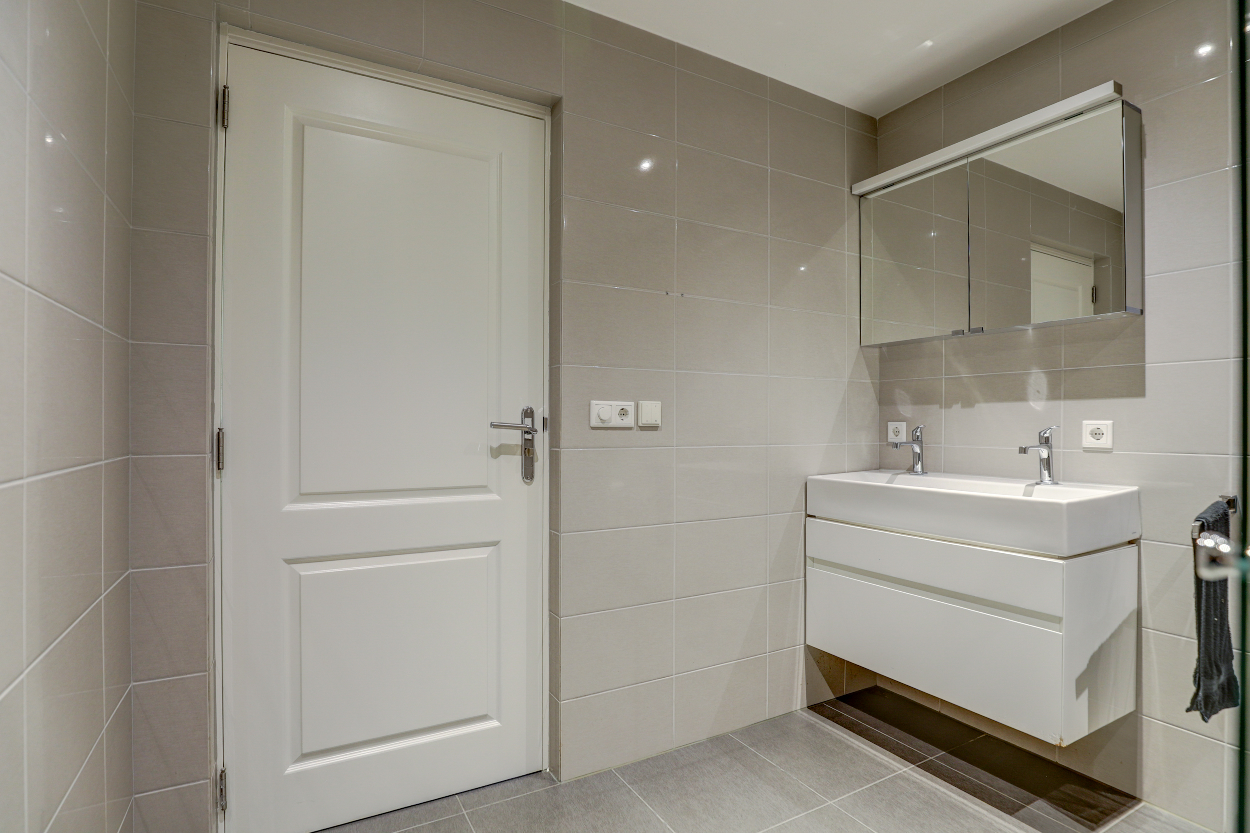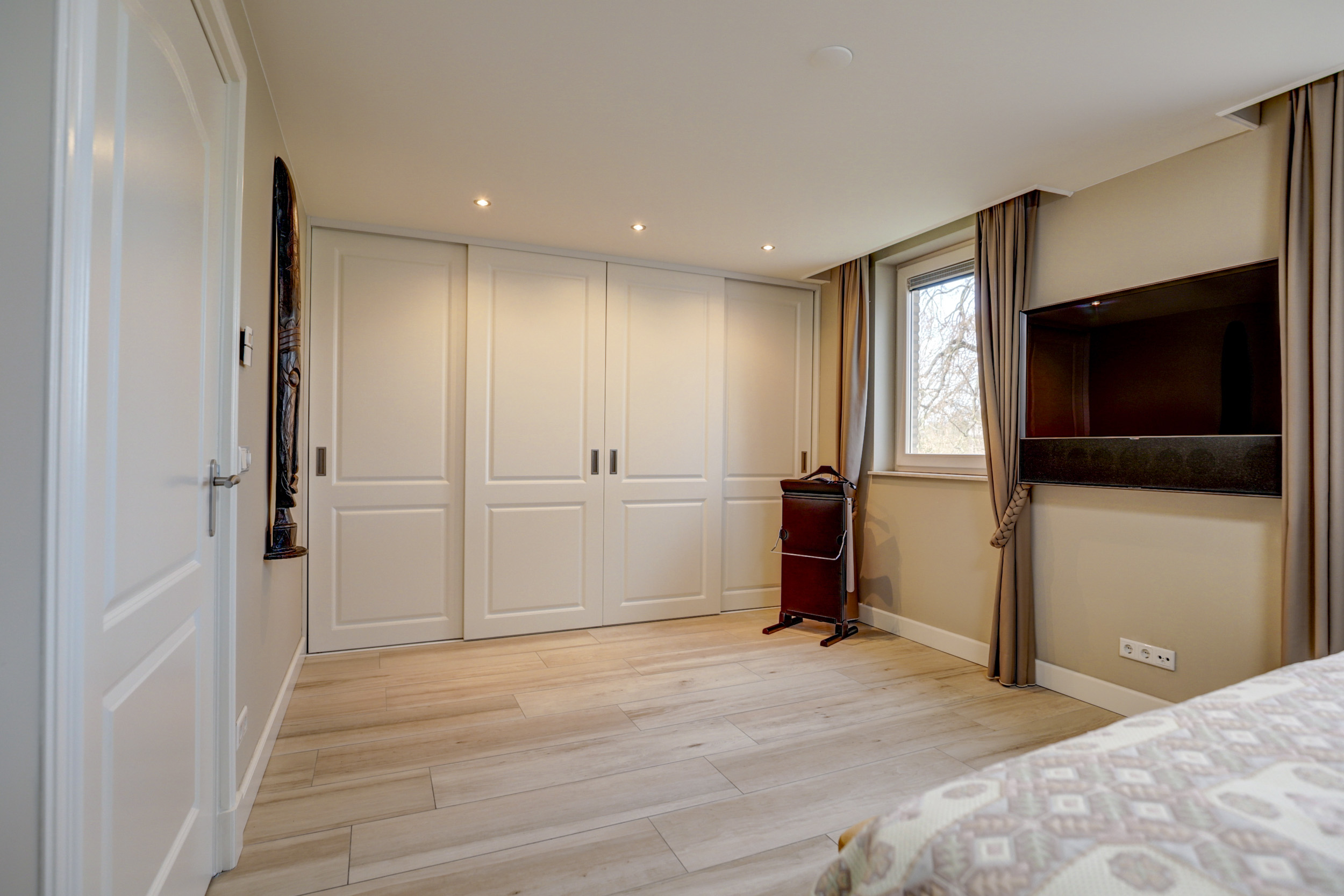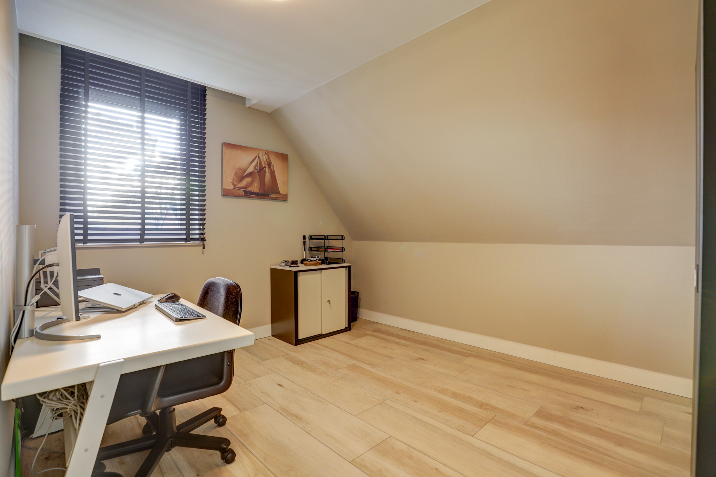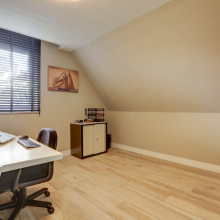 Overloop met automatisch geschakelde inbouwspots, airco, bergkamer, 3 slaapkamers (ca. 24, 15 en 12m²) waaronder de master bedroom met vaste maatwerk schuifkasten en inbouw verlichting. Royale badkamer met whirlpool hoekbad, inloopdouche met inbouw regenkop, toilet en dubbele wastafel. De gehele 1e verdieping is voorzien van een tegelvloer met houtstructuur en voor iedere ruimte apart regelbare vloerverwarming.
