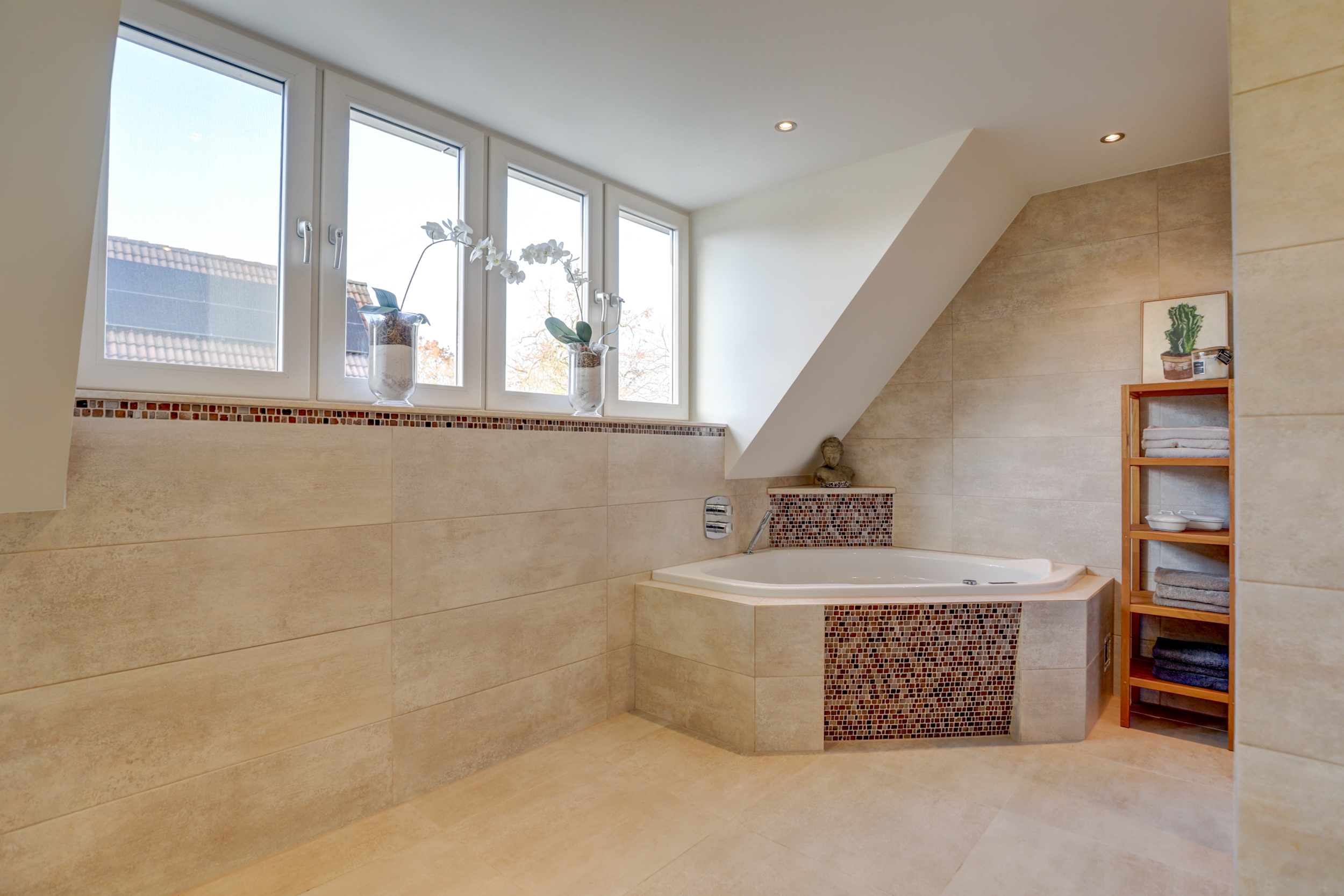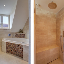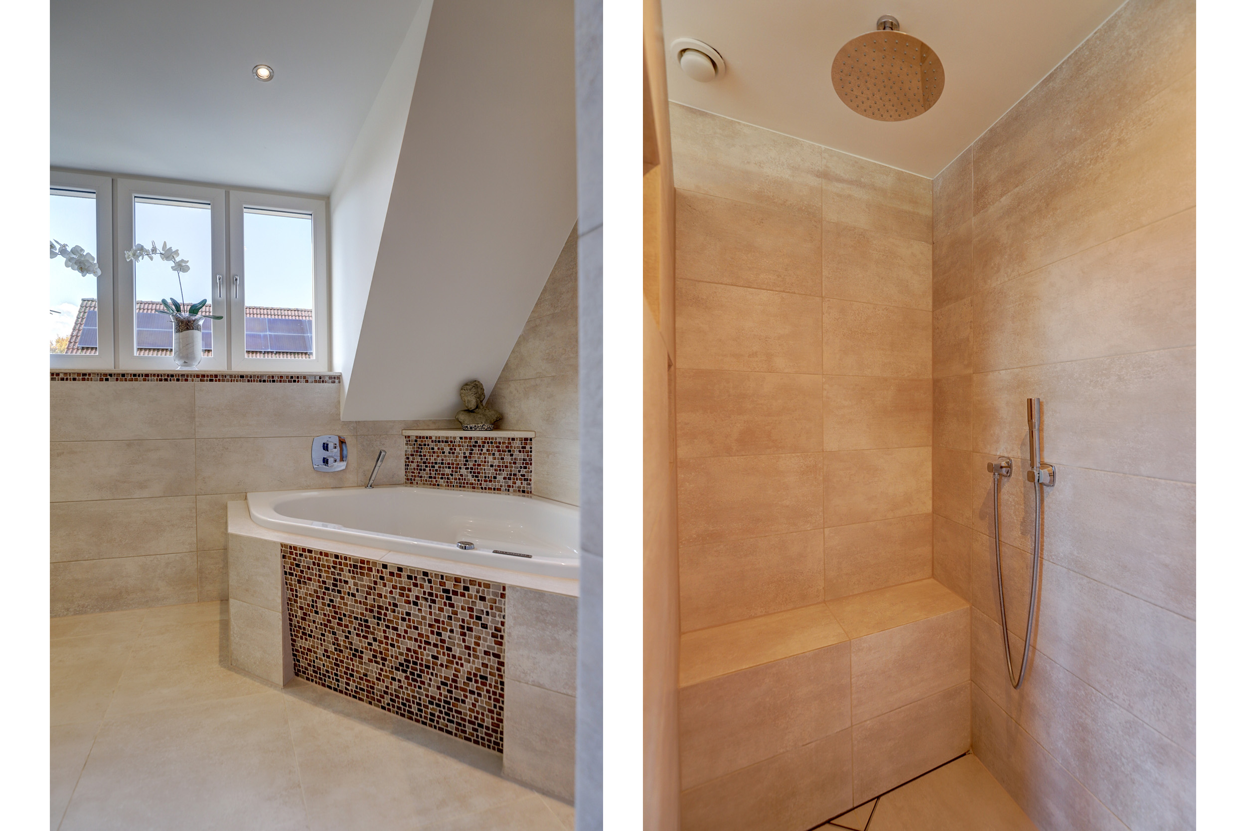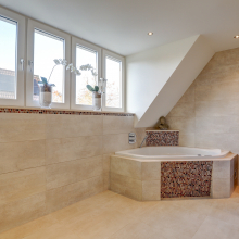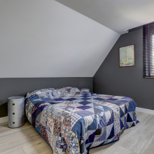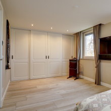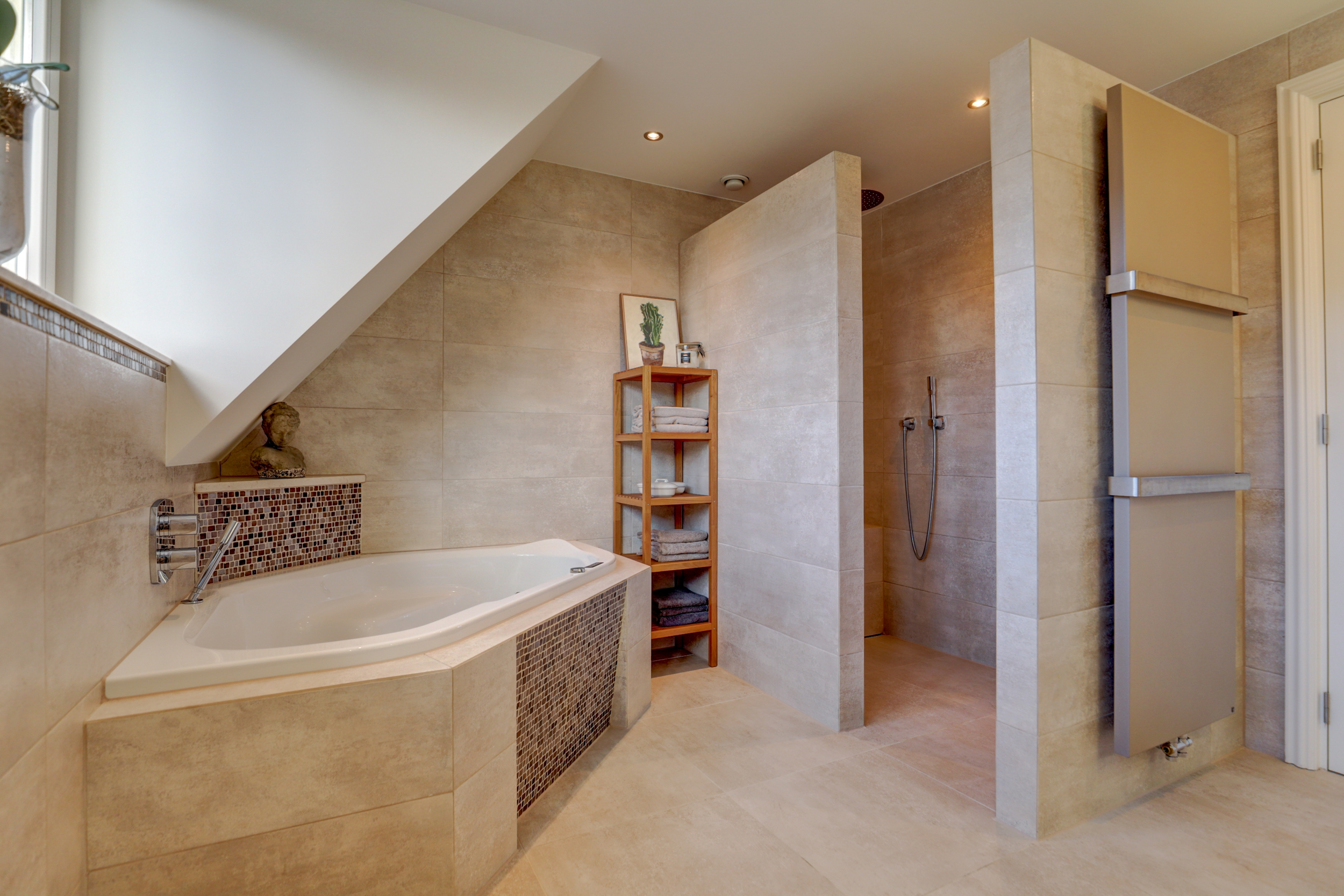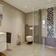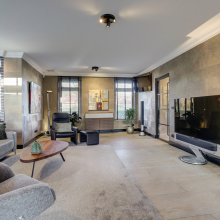Overloop met automatisch geschakelde inbouwspots, airco, bergkamer, 3 slaapkamers (ca. 24, 15 en 12m²) waaronder de master bedroom met vaste maatwerk schuifkasten en inbouw verlichting. Royale badkamer met whirlpool hoekbad, inloopdouche met inbouw regenkop, toilet en dubbele wastafel. De gehele 1e verdieping is voorzien van een tegelvloer met houtstructuur en voor iedere ruimte apart regelbare vloerverwarming.