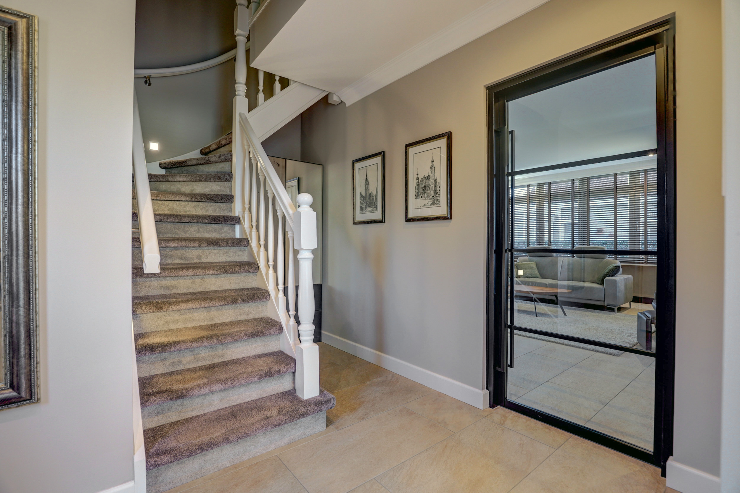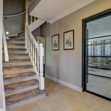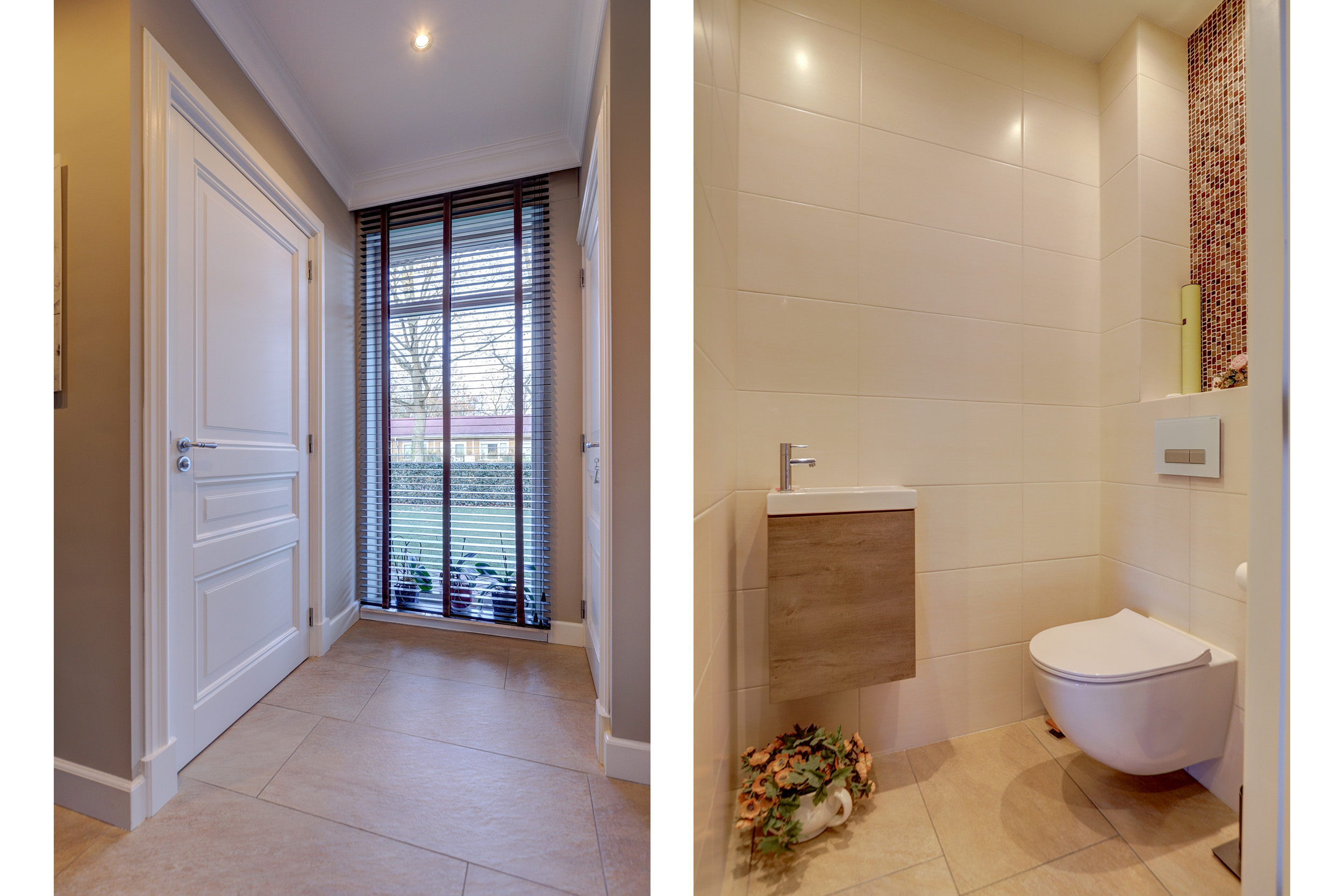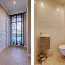 Entree, hal met automatisch geschakelde inbouwspots, meterkast, gastentoilet met fonteintje, trapopgang, garderobe en een fraaie industriële deur naar de woonkamer.