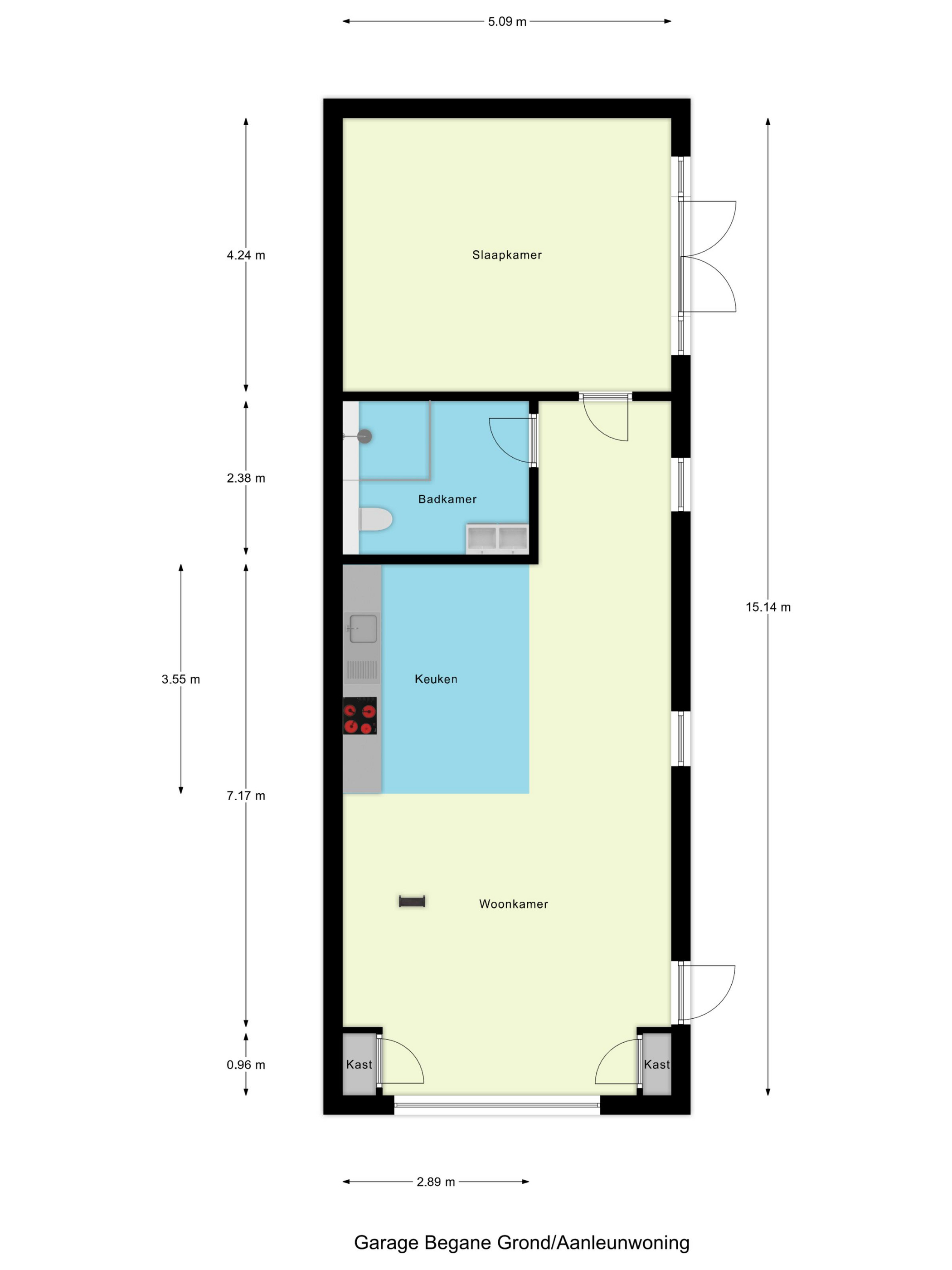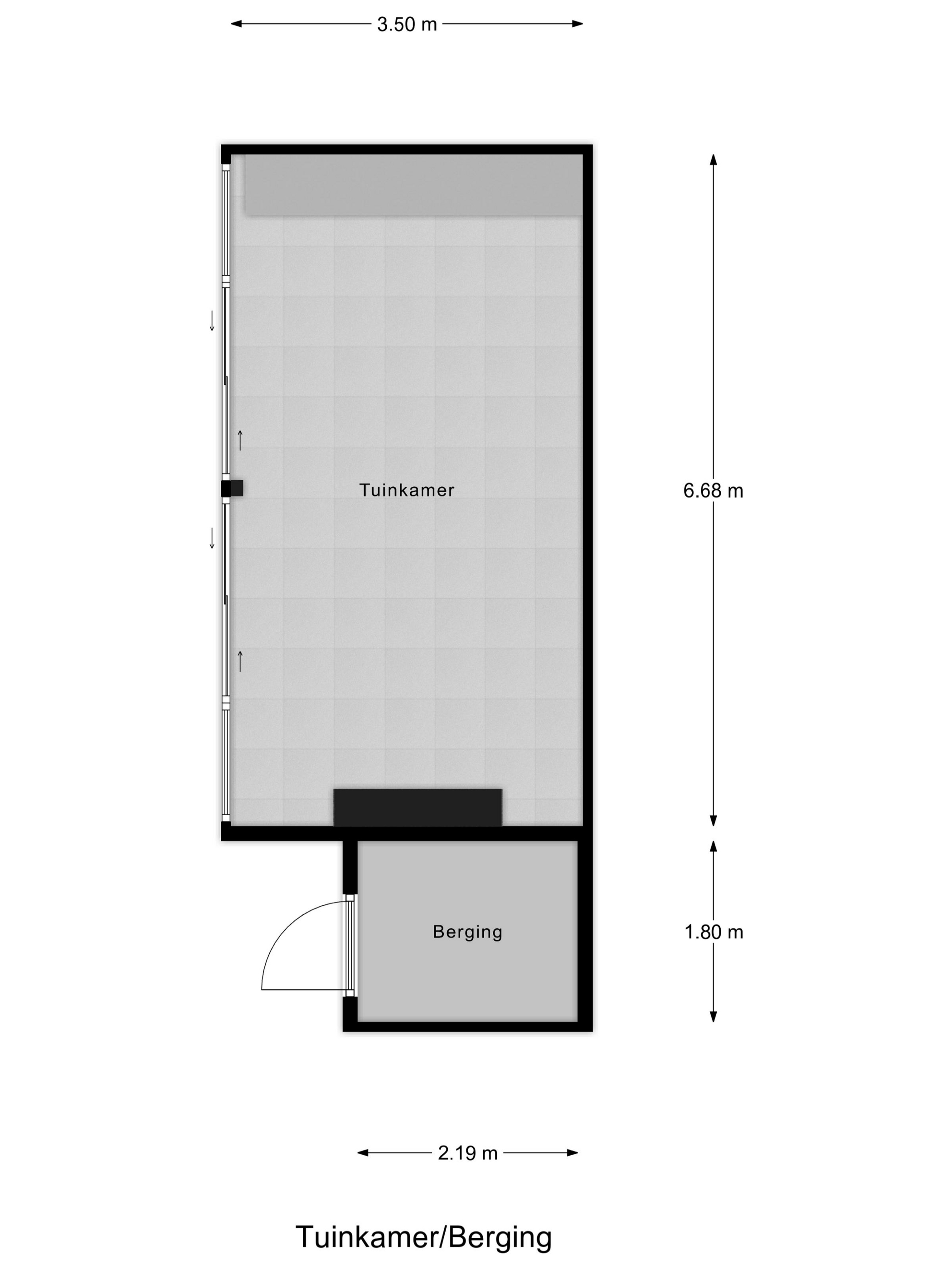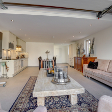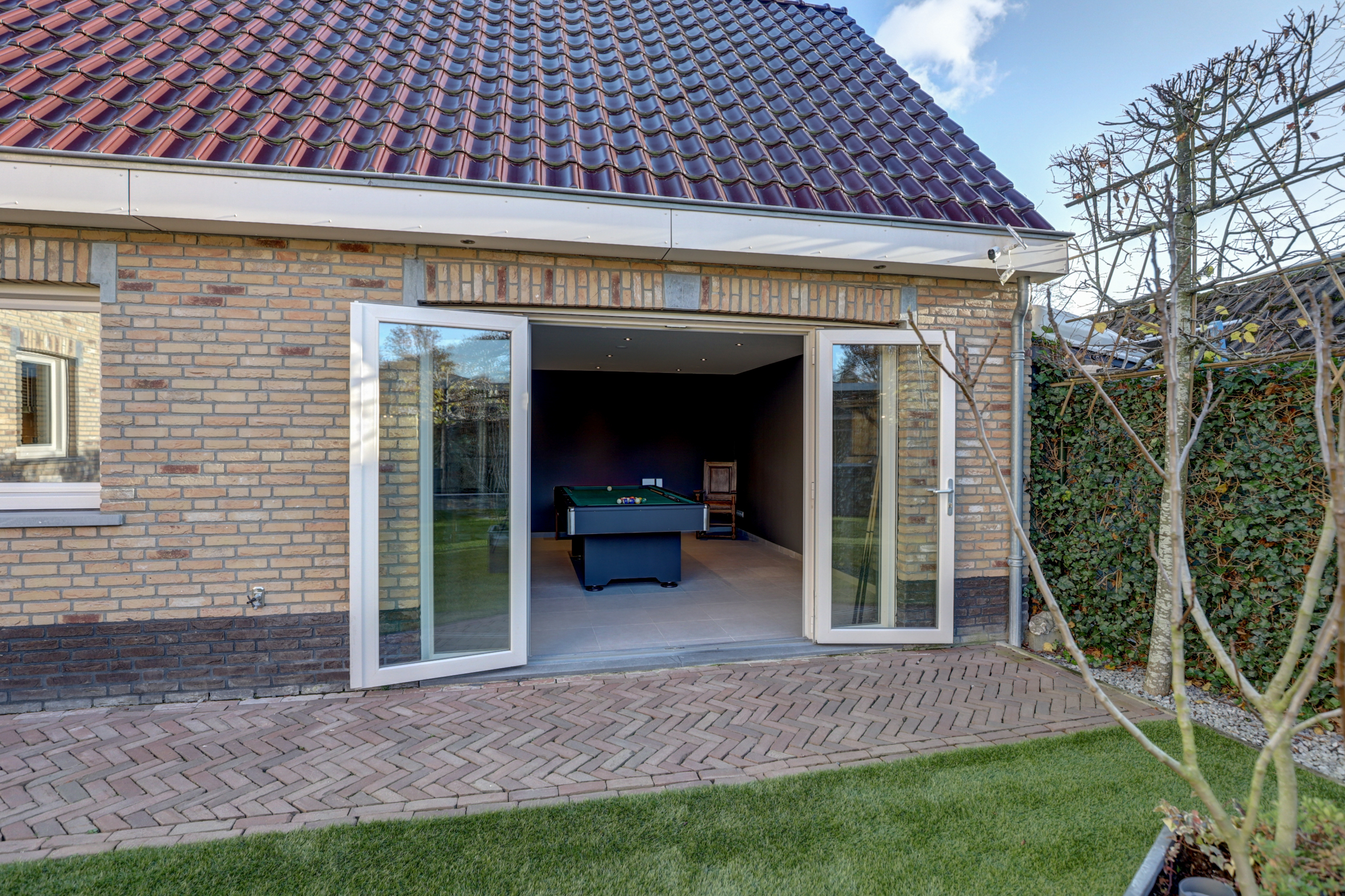 Het bijgebouw is voorzien van elektrische sectionaalpoort zodat de ruimte als garage kan dienen en dubbele openslaande deuren aan de zijkant die toegang geven tot de tuin.