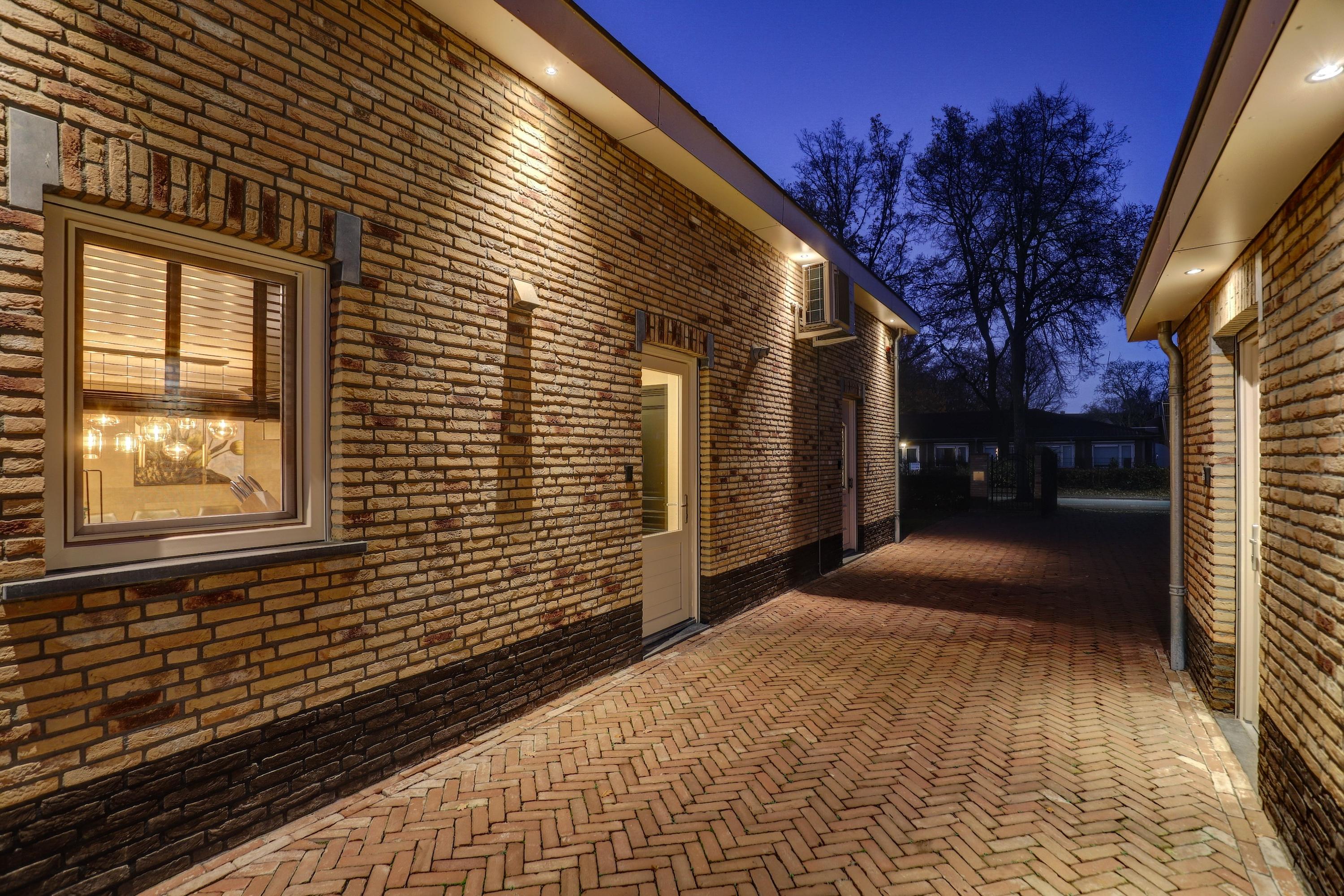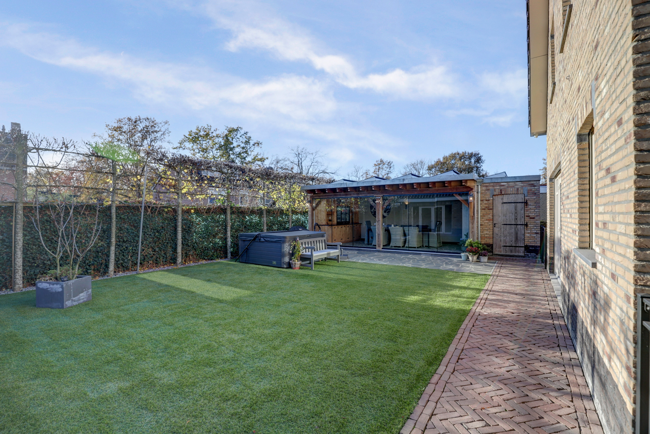 Het volledig omheinde perceel is bereikbaar via de elektrisch bedienbare dubbele poort en aparte looppoort. De voortuin beschikt over een beklinkerde oprit/parkeerplaats met ruimte voor meerdere voertuigen, een strak gazon en rondom toegang, via smeedijzeren hekwerk met afsluitbare looppoortjes, tot de achtertuin.
