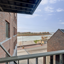 Lichte woonkamer met tijdloze, moderne keukenopstelling en diverse inbouwapparatuur; inductiekookplaat, recirculatieafzuigkap, spoelbak, vaatwasser, koelkast, combi-oven. Vanuit de woonkamer te bereiken balkon met prachtig uitzicht over de Maas! Hier is het heerlijk vertoeven en genieten van het stadse leven.