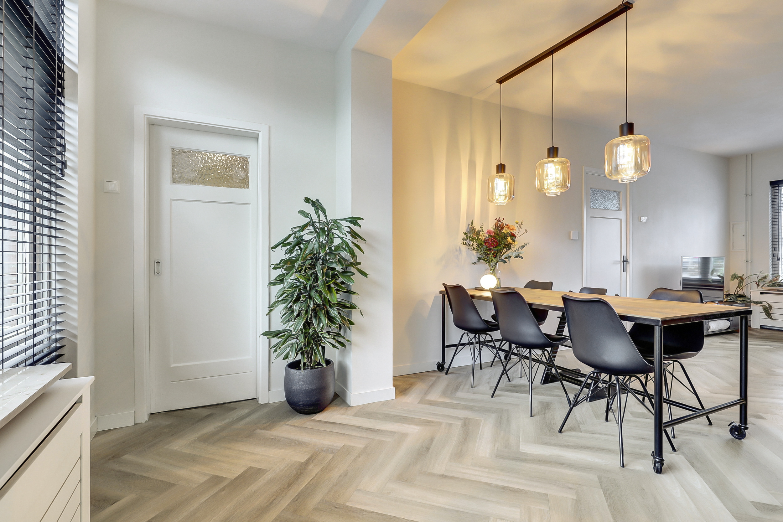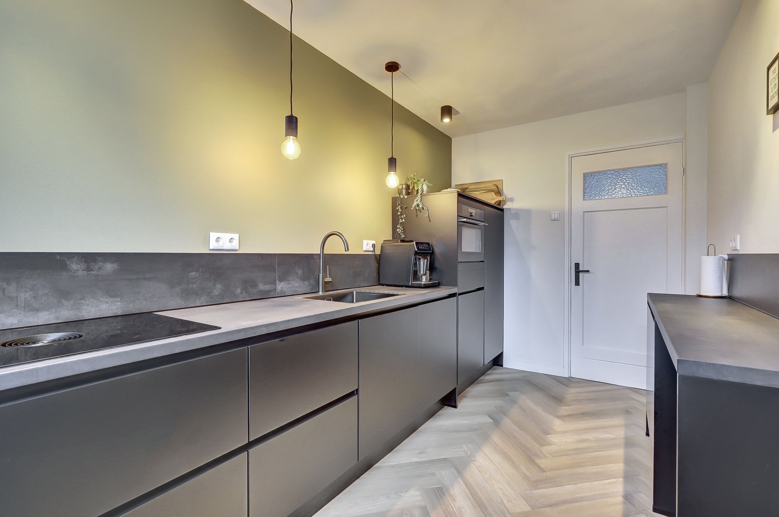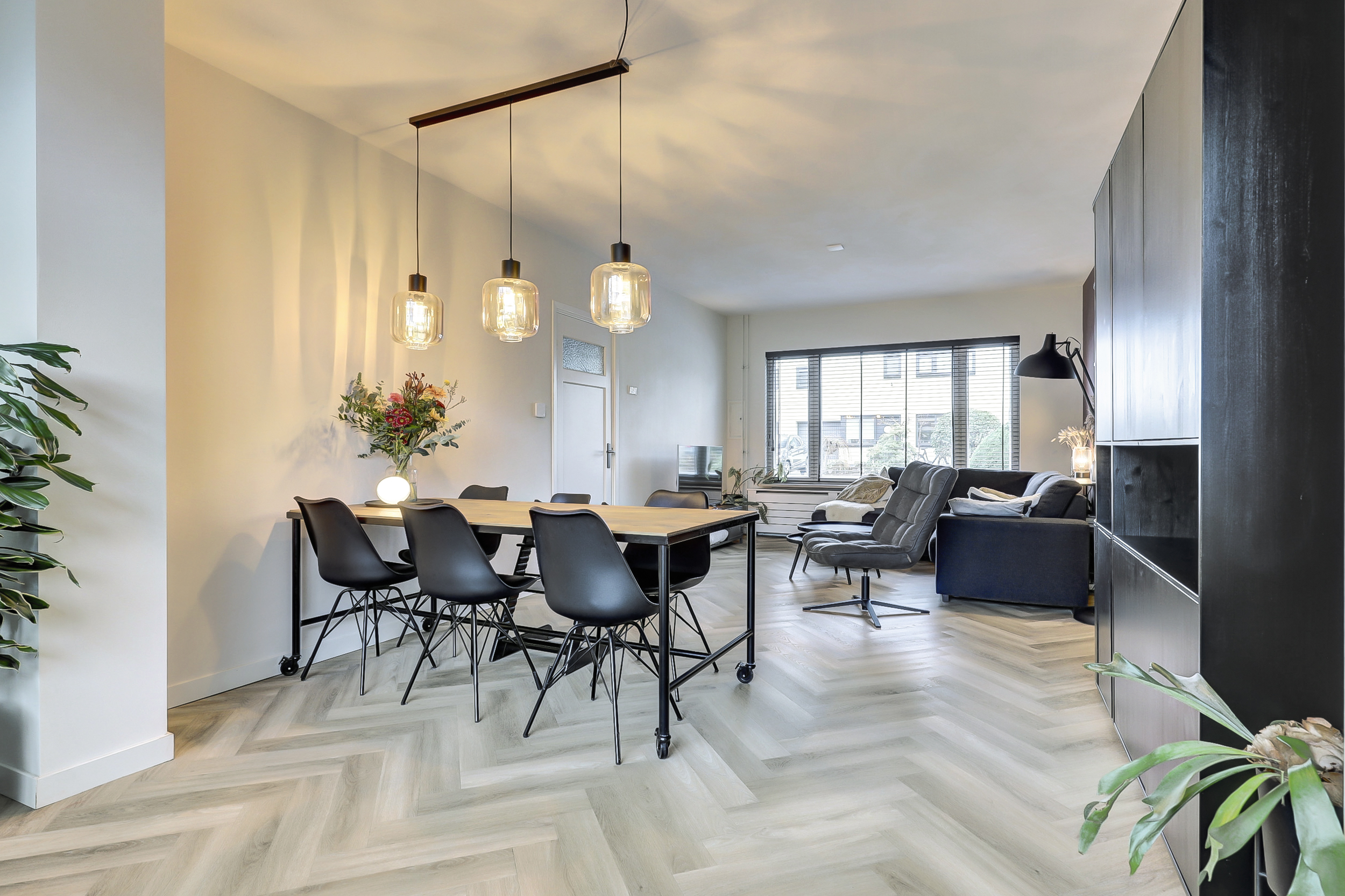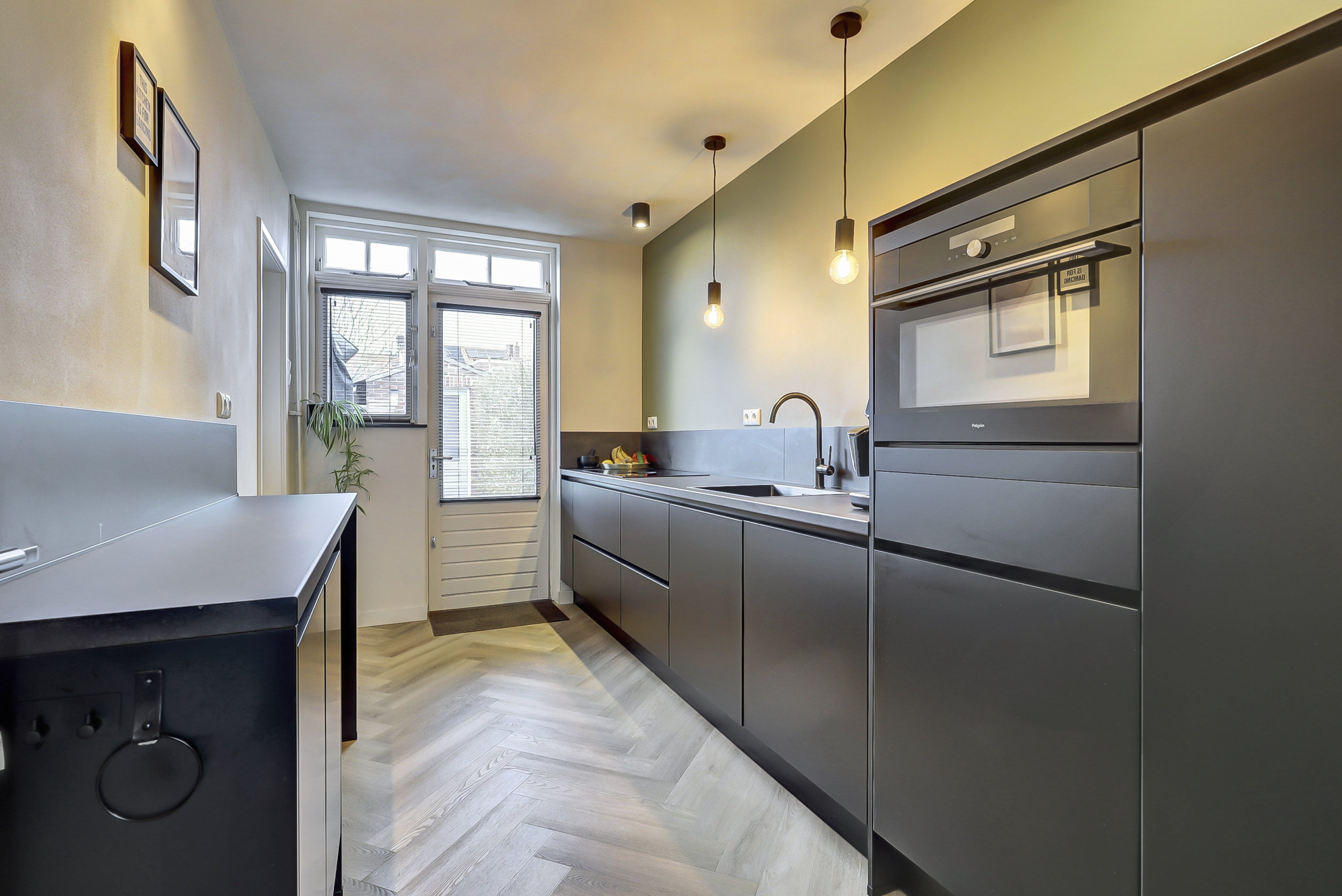 Ruime hal, toilet. Lichte en ruime woonkamer met uitbouw. Via de schuifdeur is de gesloten keuken bereikbaar. De keuken is in 2020 voorzien van een mooie zwarte inbouwkeuken inclusief apparatuur; inductiekookplaat met Bora afzuiging, vaatwasser, koelkast, combi oven, plint boiler voor directe beschikbaarheid van heet water. De begane grond is voorzien van een mooie PVC visgraat vloer.