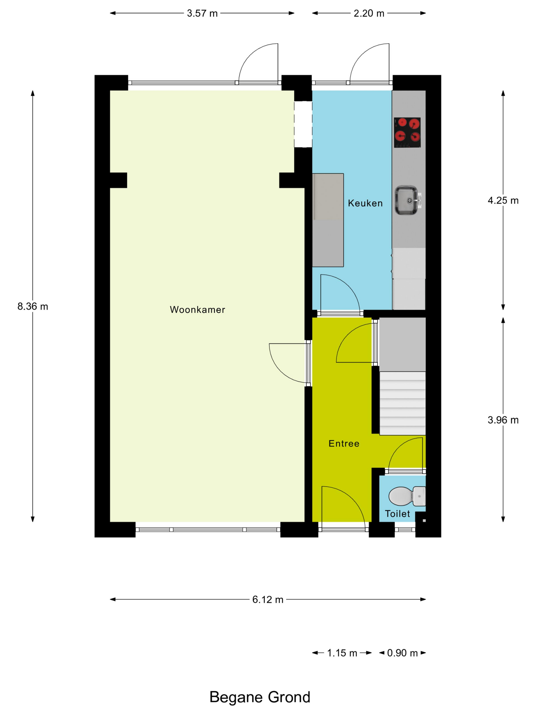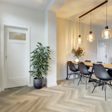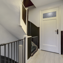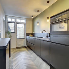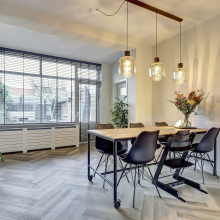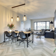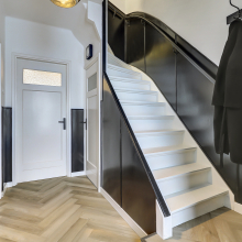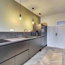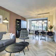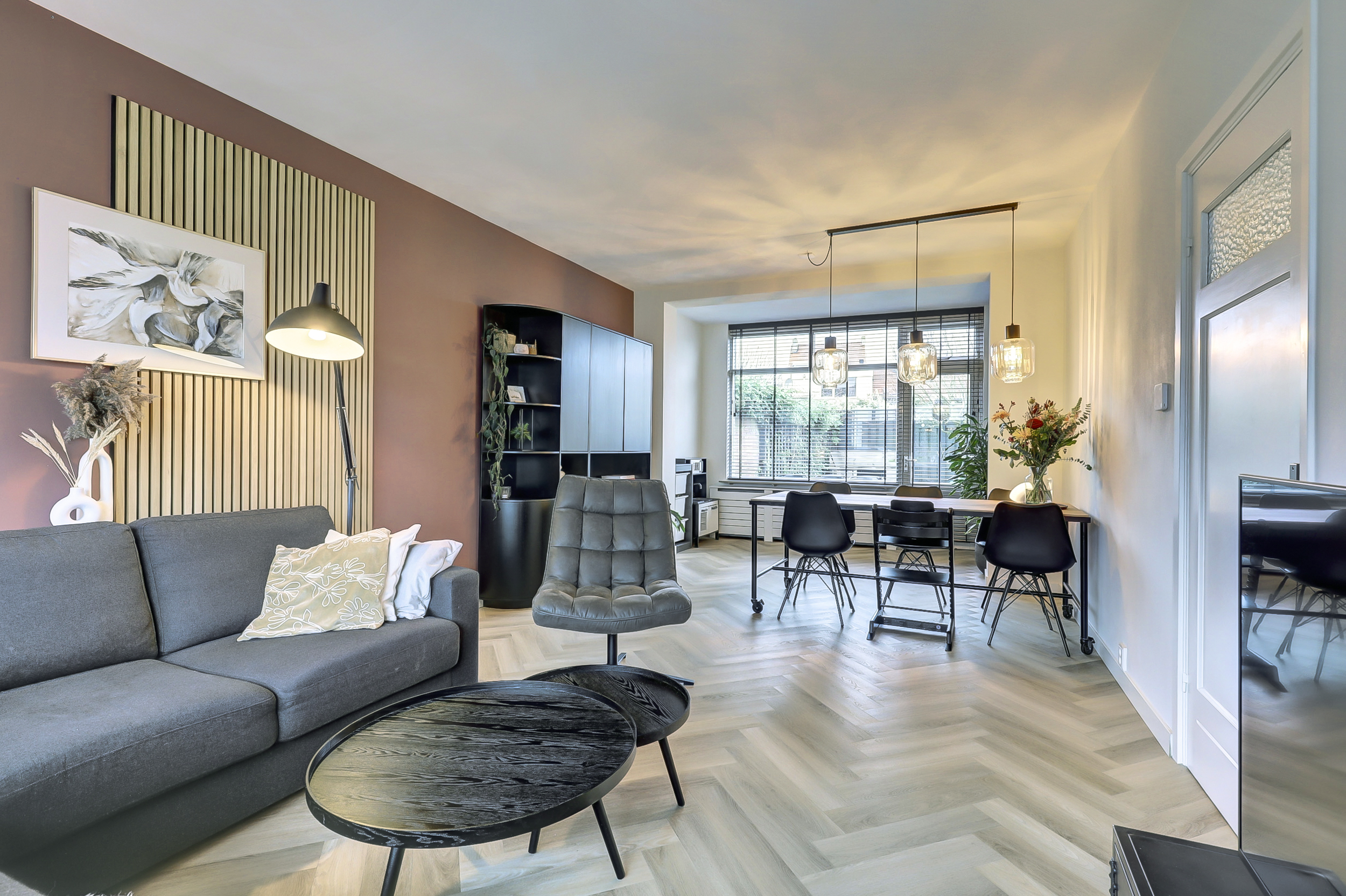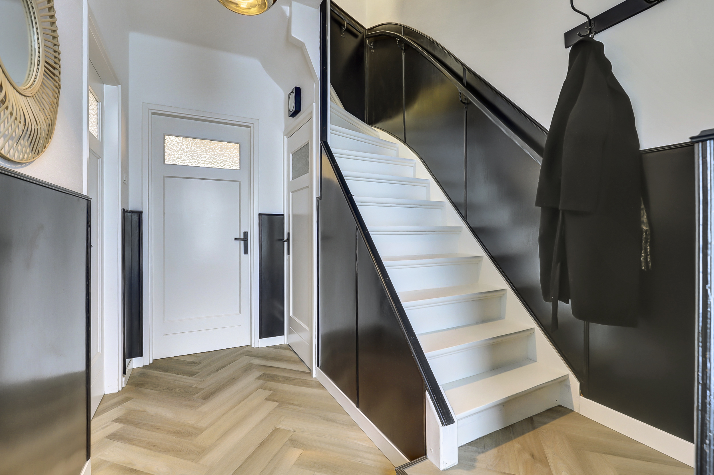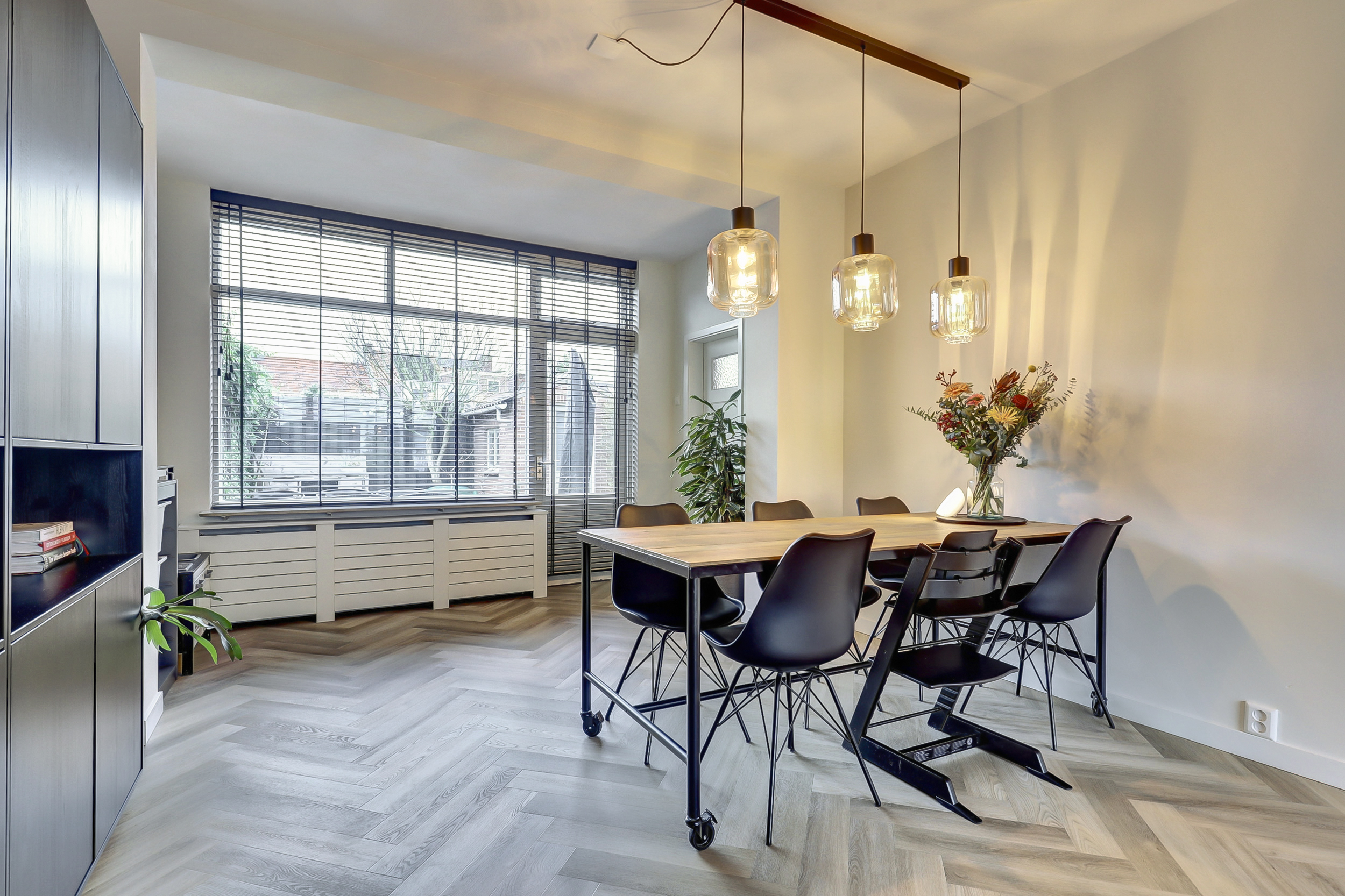 Ruime hal, toilet. Lichte en ruime woonkamer met uitbouw. Via de schuifdeur is de gesloten keuken bereikbaar. De keuken is in 2020 voorzien van een mooie zwarte inbouwkeuken inclusief apparatuur; inductiekookplaat met Bora afzuiging, vaatwasser, koelkast, combi oven, plint boiler voor directe beschikbaarheid van heet water. De begane grond is voorzien van een mooie PVC visgraat vloer.
