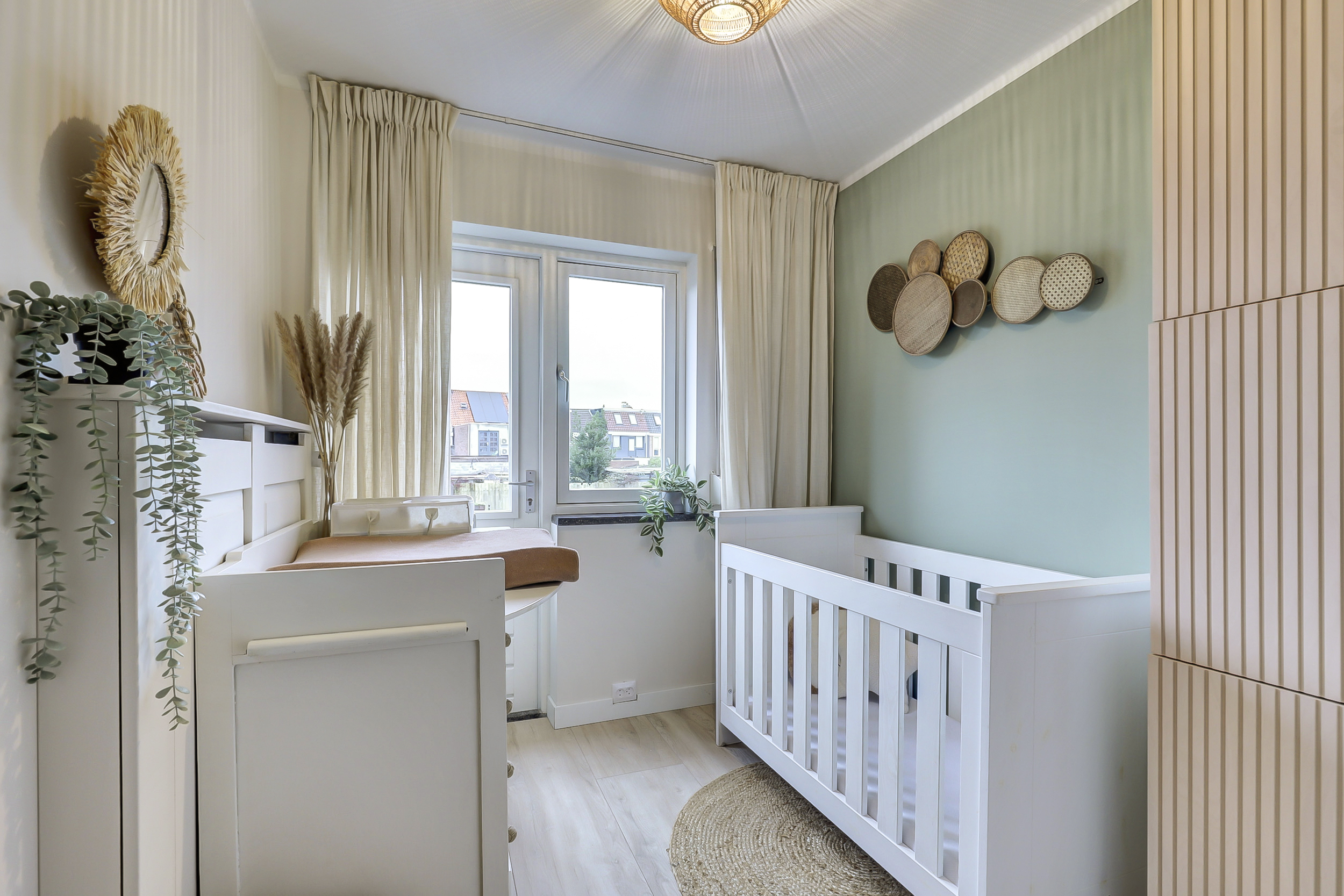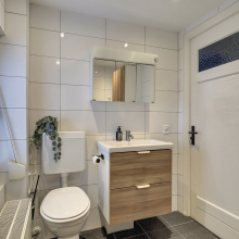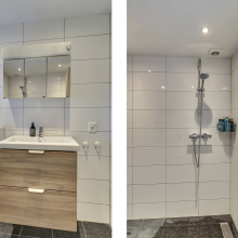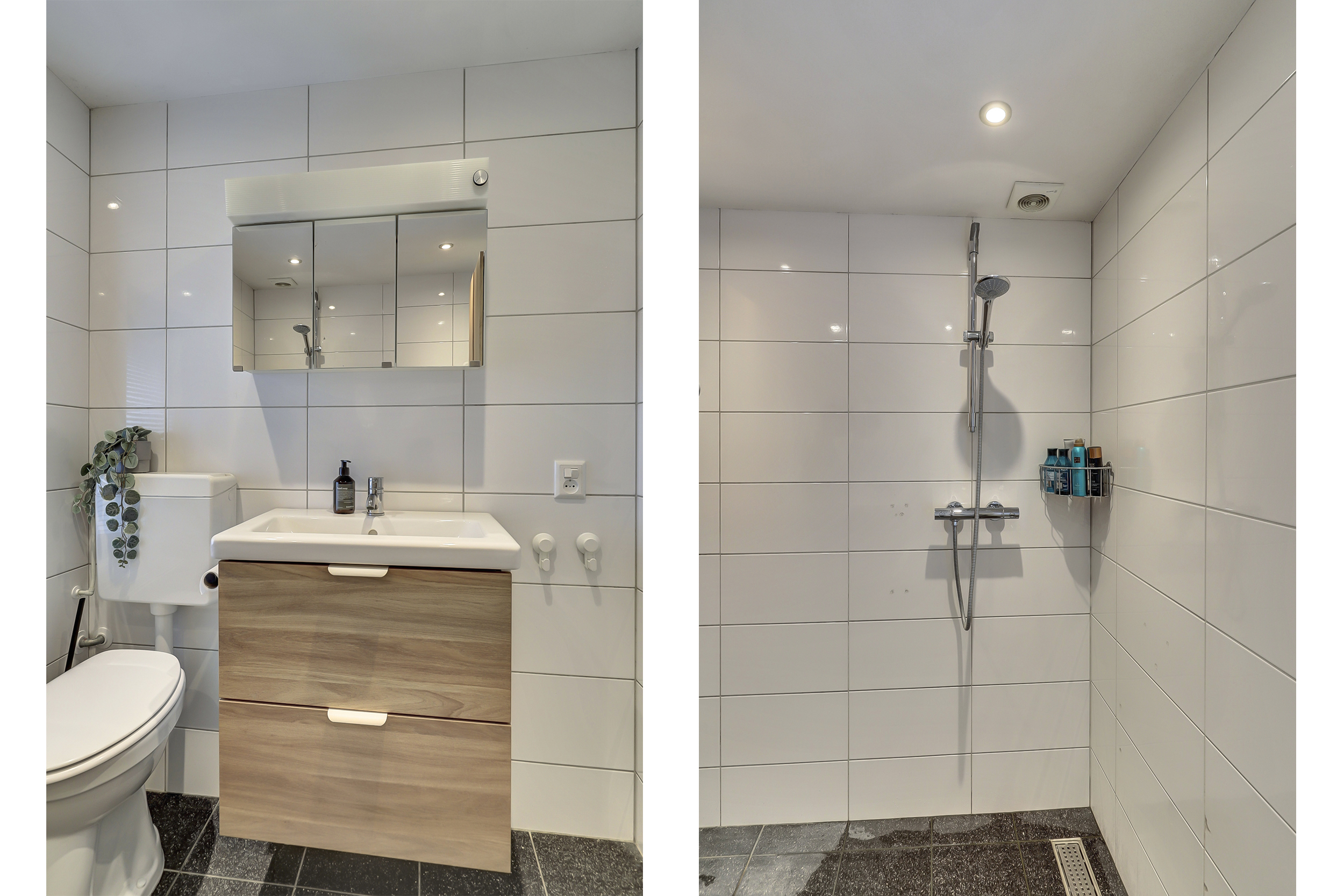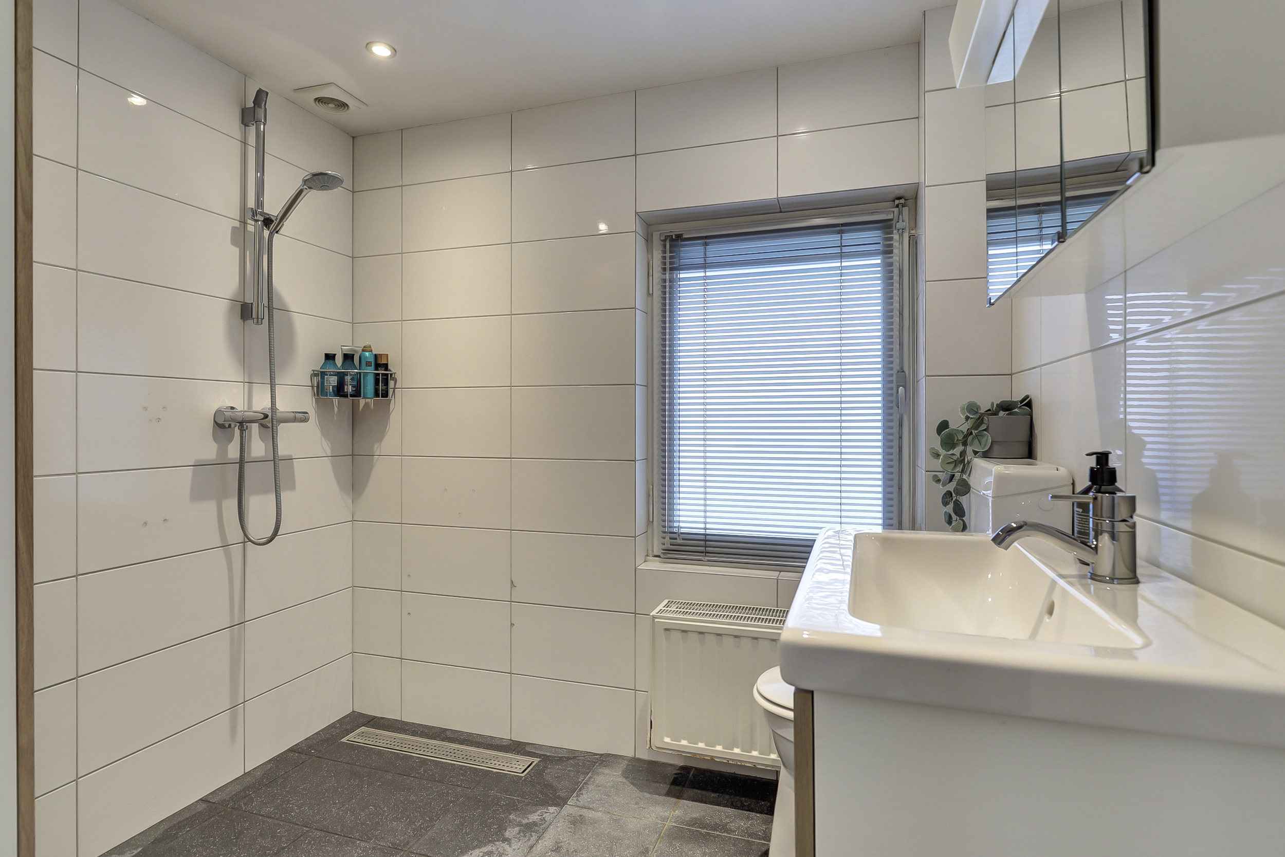 Overloop, 3 slaapkamers, balkon. Badkamer met inloopdouche, wastafel met meubel en toilet. Deze verdieping is voorzien van een mooie laminaatvloer.