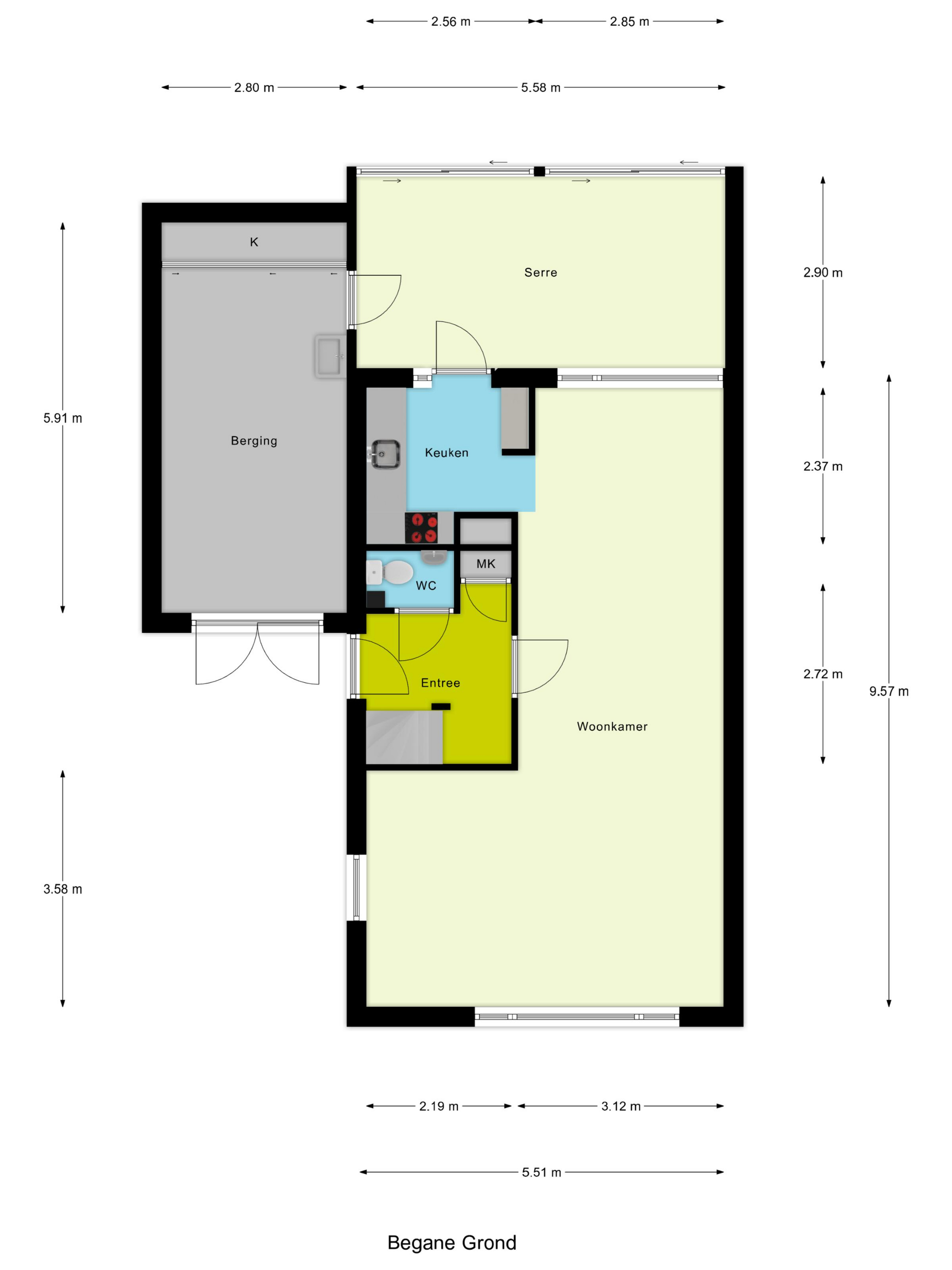Via de voordeur aan de zijkant kom je binnen in de entree met toilet en meterkast. Vanuit hier bereik je de ruime woon- en eetkamer. De keuken sluit hier naadloos op aan en is voorzien van een inductiekookplaat, afzuigkap, oven (defect, dus alvast een excuus om vaker te bestellen), koelkast, vaatwasser en voldoende kastruimte. Vanuit de keuken loop je door naar de serre met grote ramen en een schuifdeur naar de tuin. De ruime berging is zowel via de voorzijde als via de serre bereikbaar en beschikt over een wateraansluiting en een ingebouwde kast.